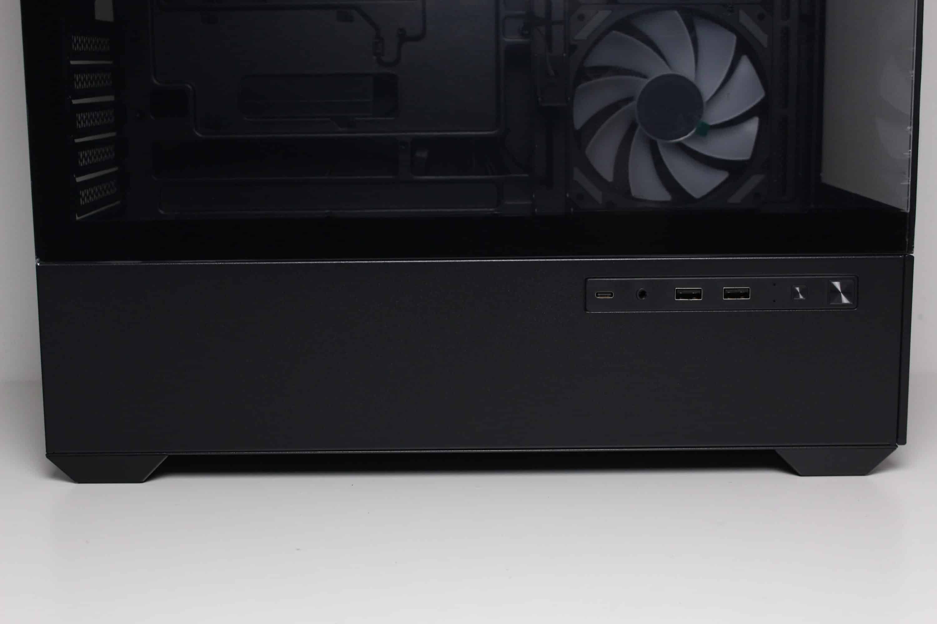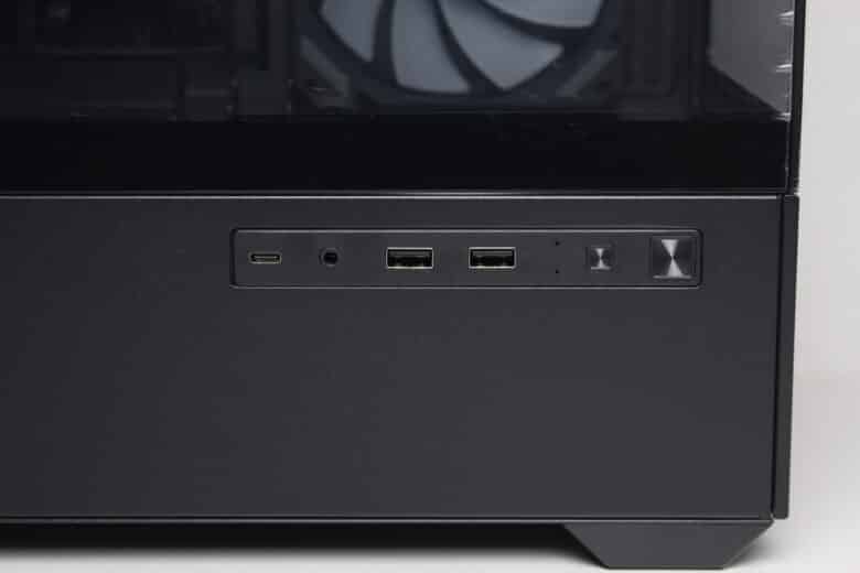 Das modern ausgestattete I/O-Panel platziert Sharkoon an der linken Gehäuseseite. Es besteht aus einem USB-C 3.2 Gen 2 sowie zwei USB-A 3.0 Anschlüssen, einem HD-Audio Combo-Port, zwei Indikator-LEDs sowie zwei Tastern für Power und Reset bzw. zur Steuerung der RGB-Beleuchtung.