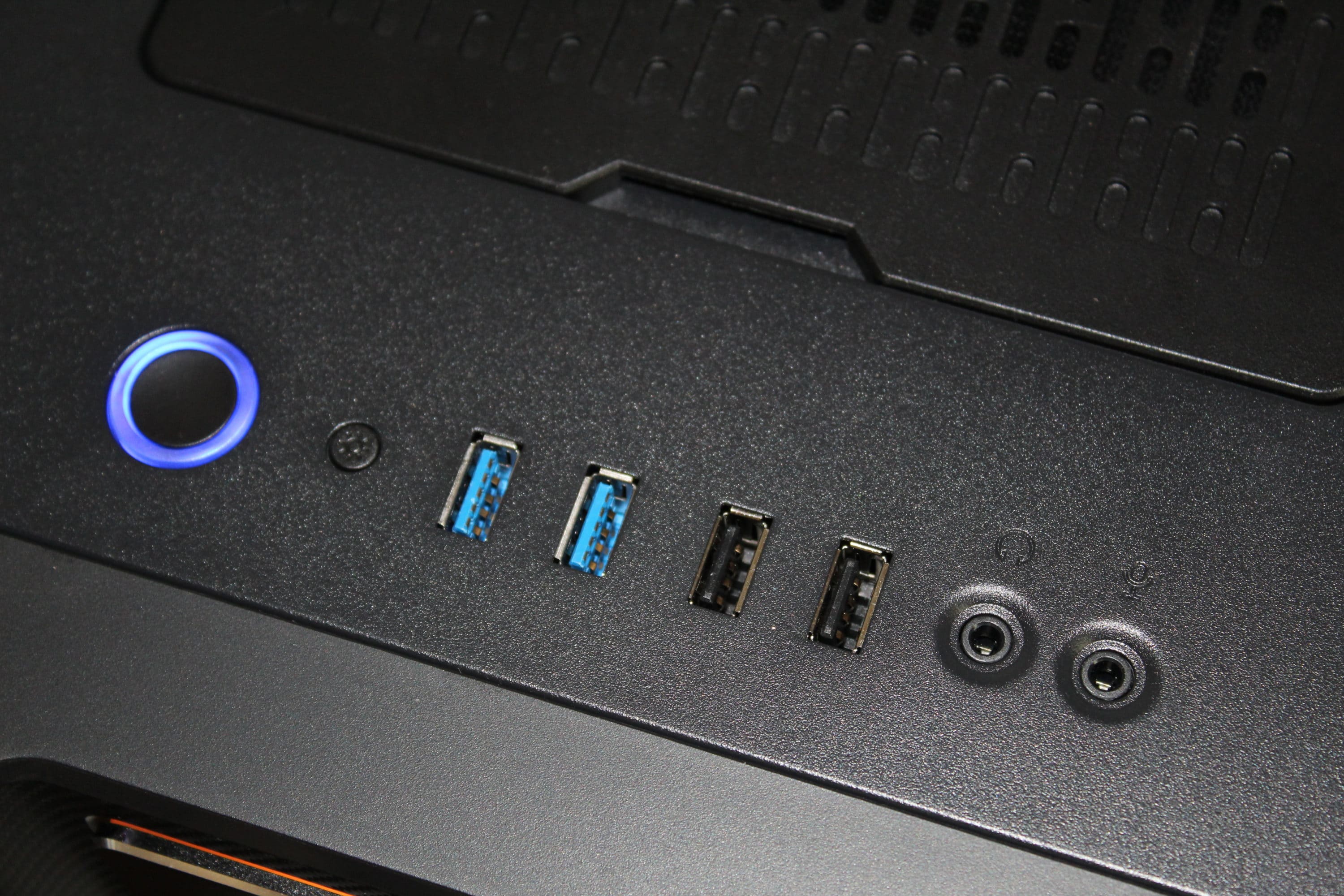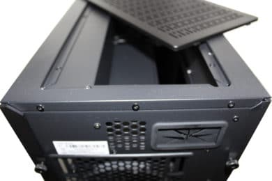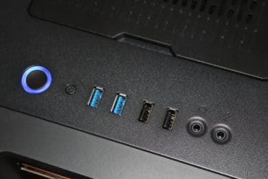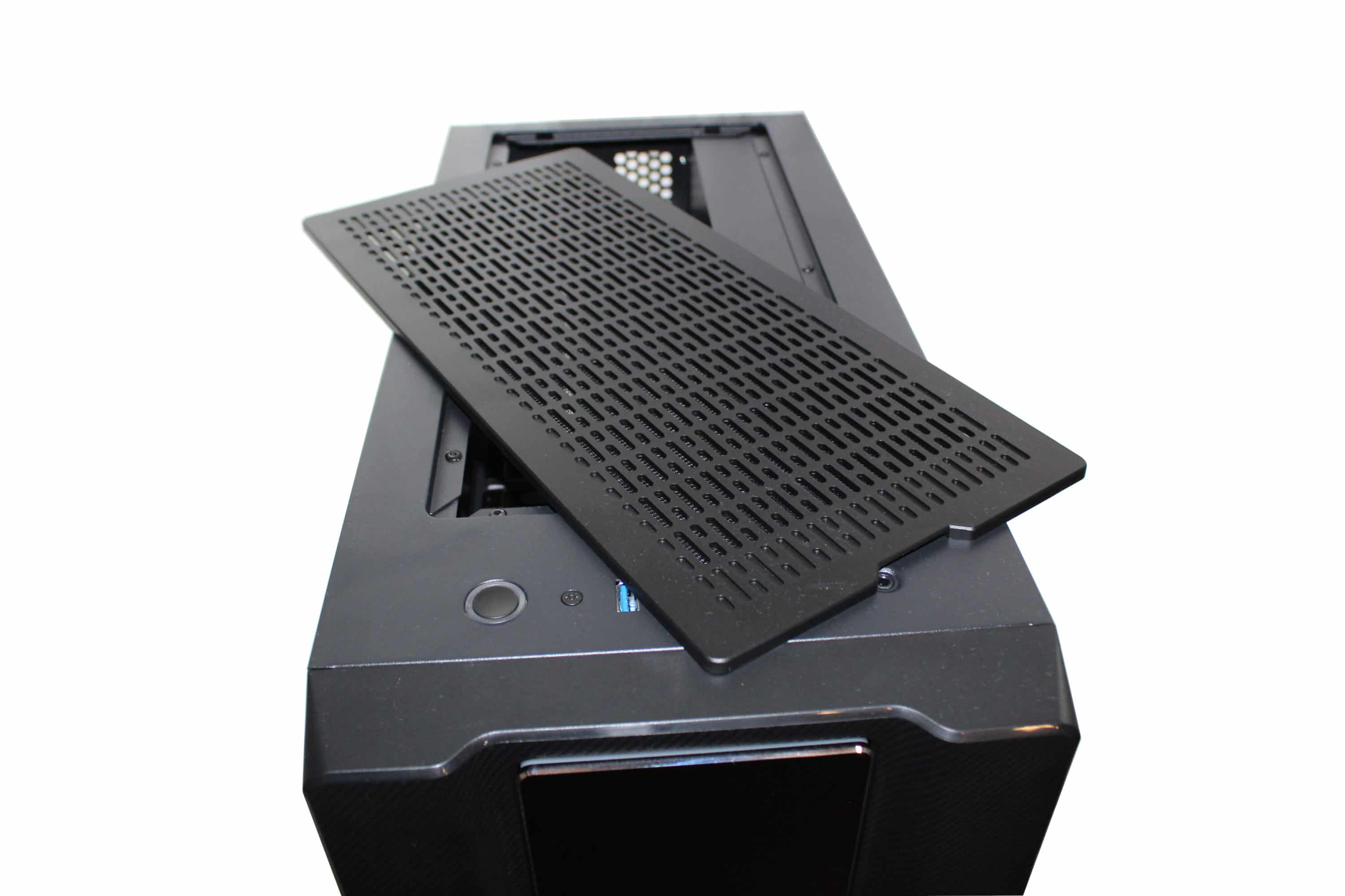 Die Oberseite wird geprägt von einer Klappe – darunter befinden sich GPU-Anschlüsse und das IO-Panel. Die Kabel kann man gesammelt durch eine Gummiabdeckung hinten herausführen. Dies sorgt für einen sehr ordentlichen Look – ein einzelner Kabelstrang, der das Gehäuse verlässt, wirkt sehr aufgeräumt. Frontanschlüsse, inklusive Powerbutton, befinden sich ebenfalls auf der Oberseite. Der Powerbutton wird von der Power-, aber auch HDD-LED beleuchtet. Darüber hinaus stehen zwei USB-2.0-, zwei USB-3.0-Anschlüsse und Audioanschlüsse zur Verfügung.