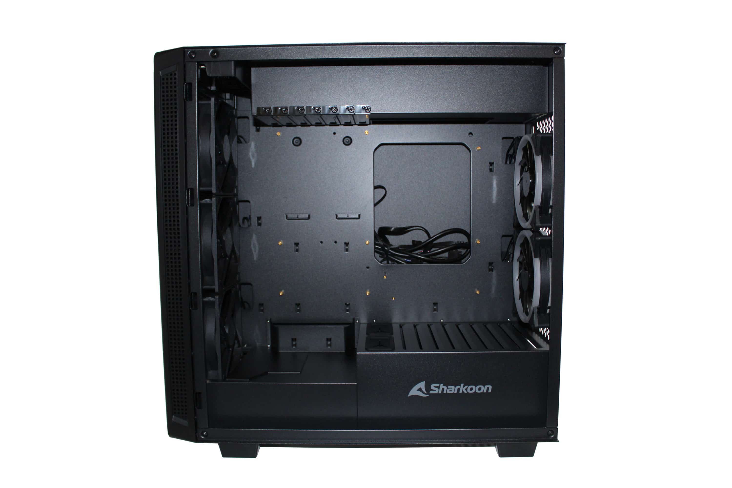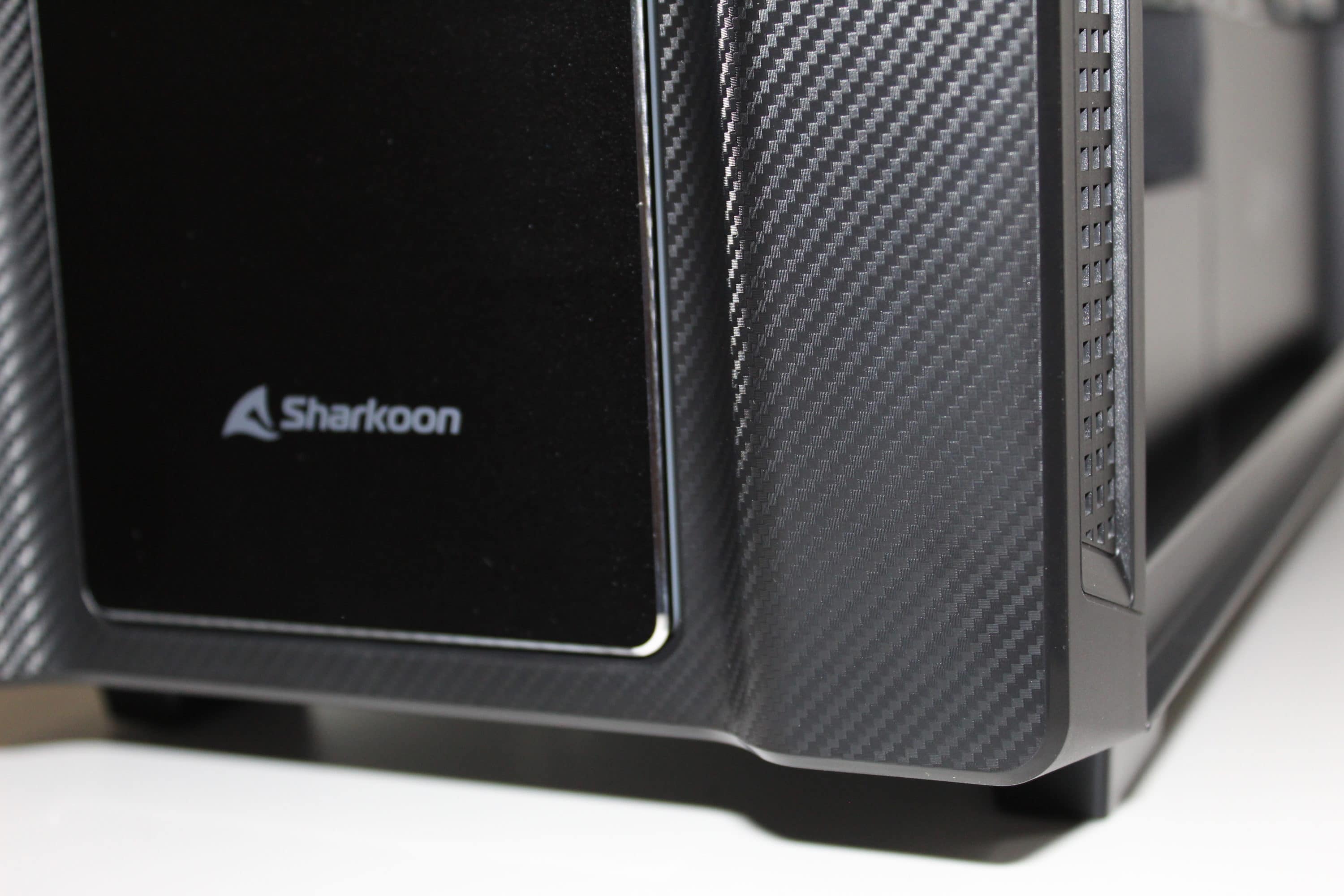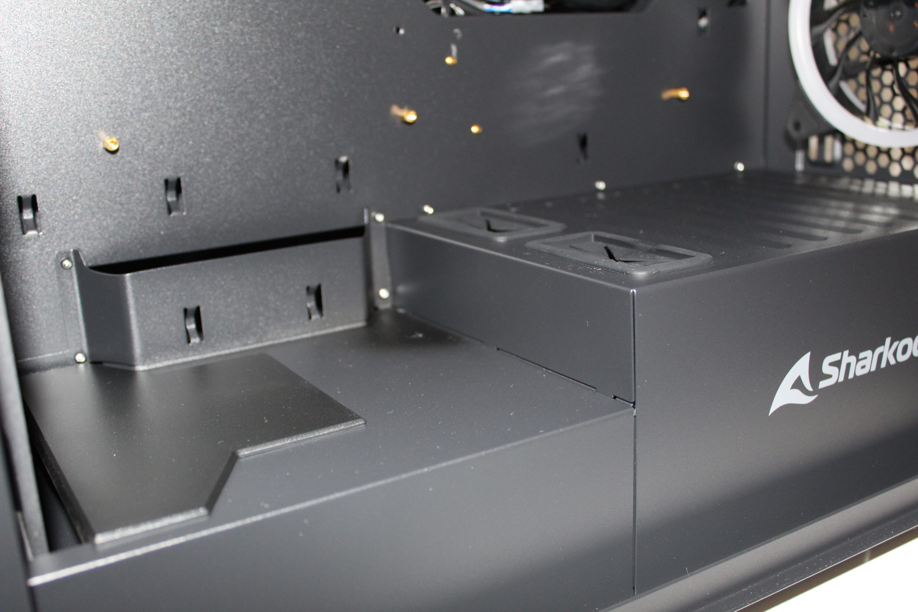 Wie es in der aktuellen Zeit fast schon Standard ist, wird für das Netzteil ein eigener Schacht genutzt, um später die überschüssigen Kabel verstecken zu können. Dieser Schacht wird durch das neue Logo und den Sharkoon-Schriftzug geprägt und er enthält kleine Luftschlitze. Um längere Grafikkarten zu ermöglichen, wird der Schacht jedoch nicht komplett bis zum Ende gezogen.