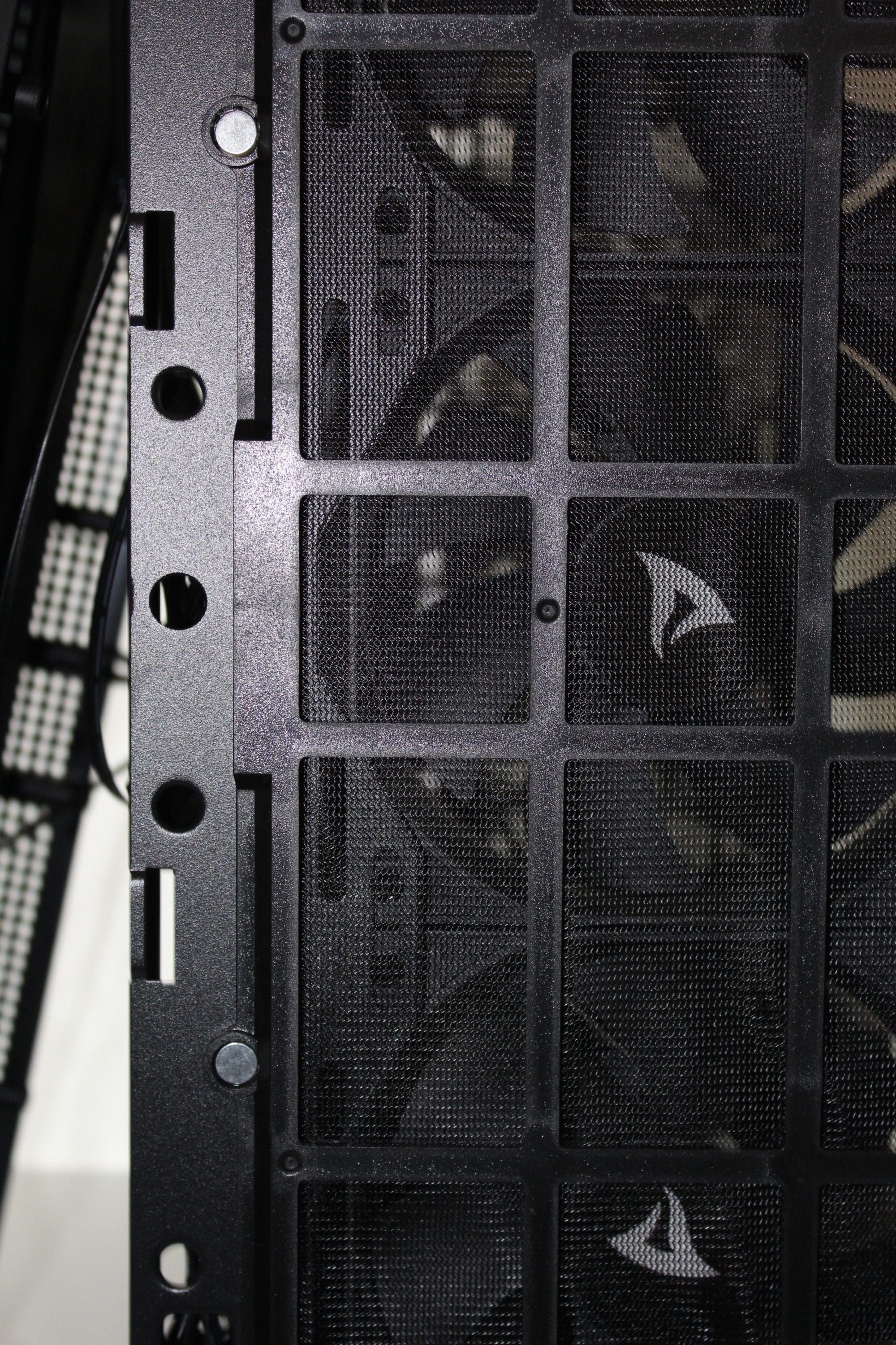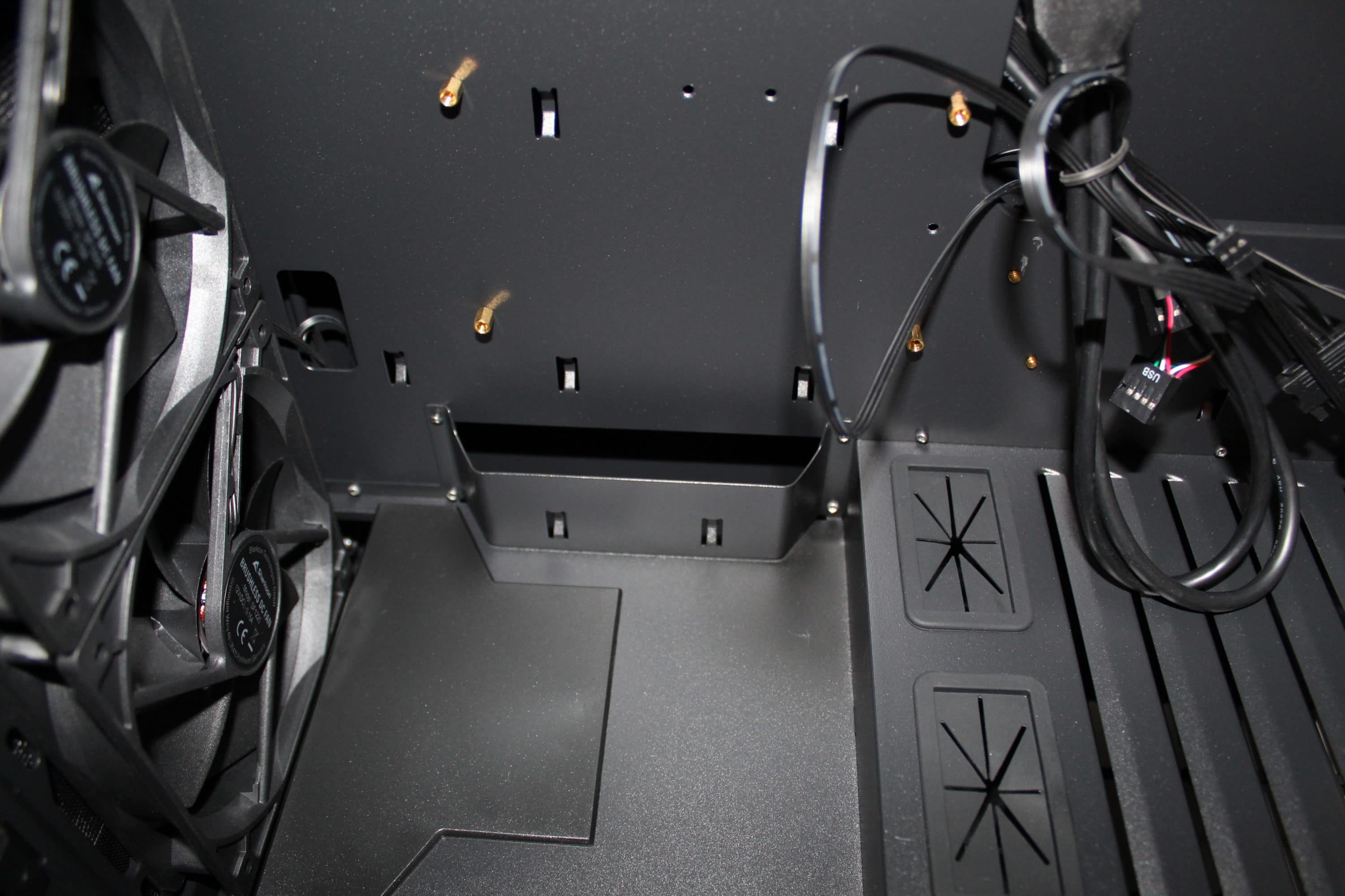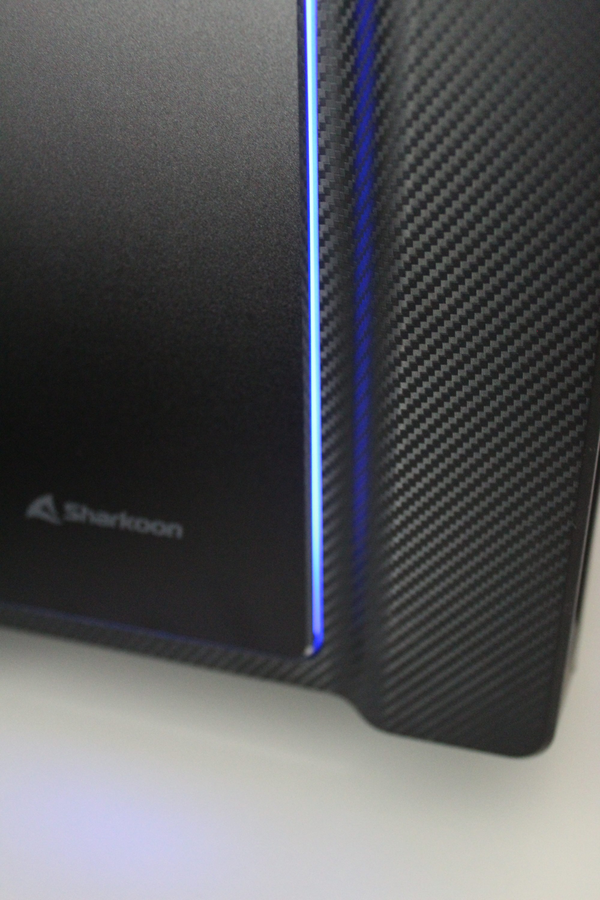 Wie es in der aktuellen Zeit fast schon Standard ist, wird für das Netzteil ein eigener Schacht genutzt, um später die überschüssigen Kabel verstecken zu können. Dieser Schacht wird durch das neue Logo und den Sharkoon-Schriftzug geprägt und er enthält kleine Luftschlitze. Um längere Grafikkarten zu ermöglichen, wird der Schacht jedoch nicht komplett bis zum Ende gezogen.