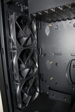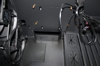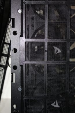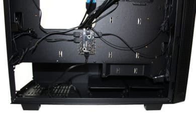 Ein Kabelmanagement ist möglich, jedoch ohne vorgegebene Wege und/oder Kabelschlaufen immer etwas schwierig. Wer eine ordentliche Rückseite möchte, der sollte auf Kabelbinder oder idealerweise Kabelkletten zurückgreifen. Durch kleinere Befestigungslöcher sind hier einige Möglichkeiten gegeben – hier merkt man jedoch noch den Unterschied zu einem High-End-Case mit deutlicher angenehmerer Kabelführung.