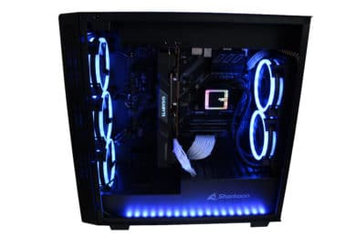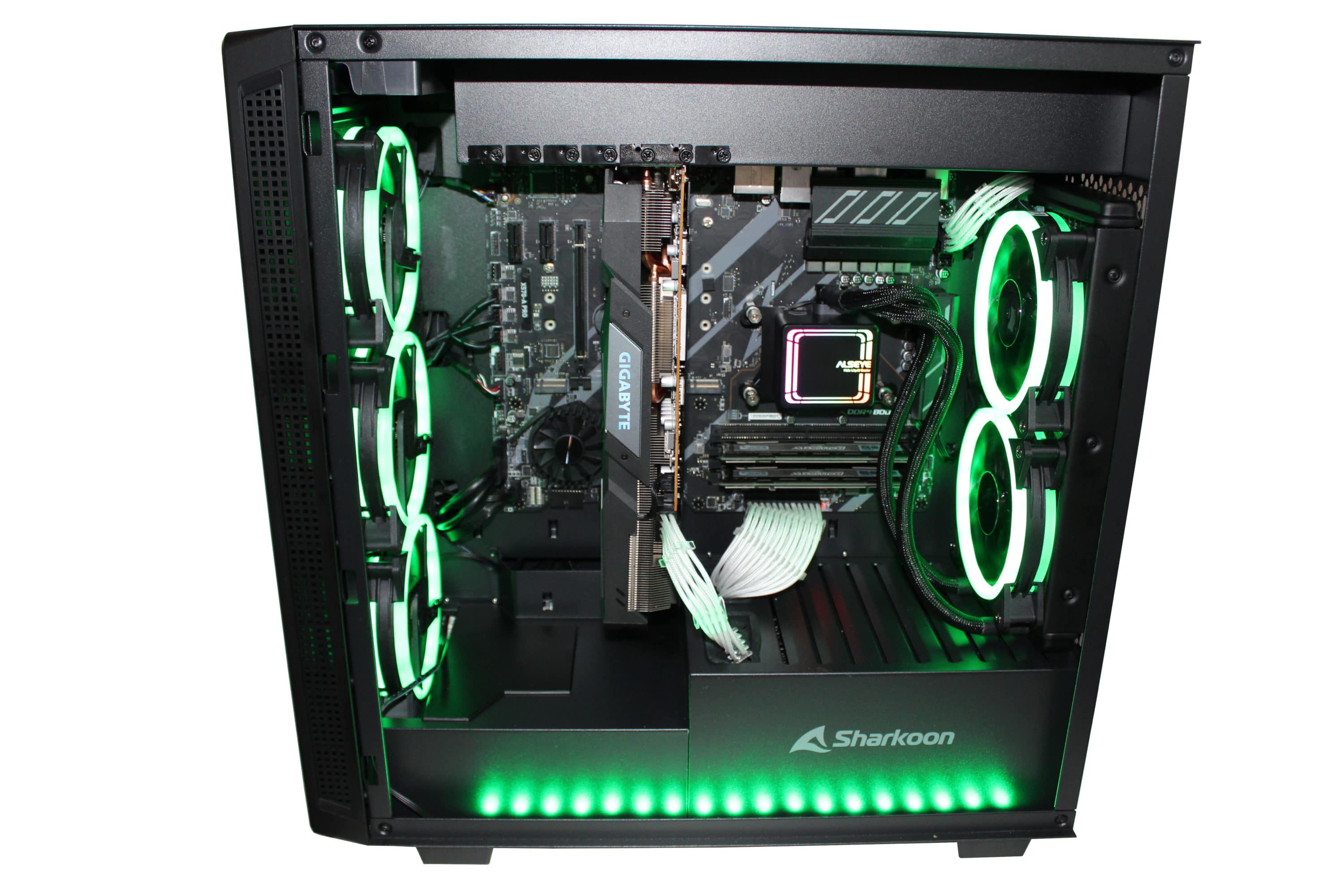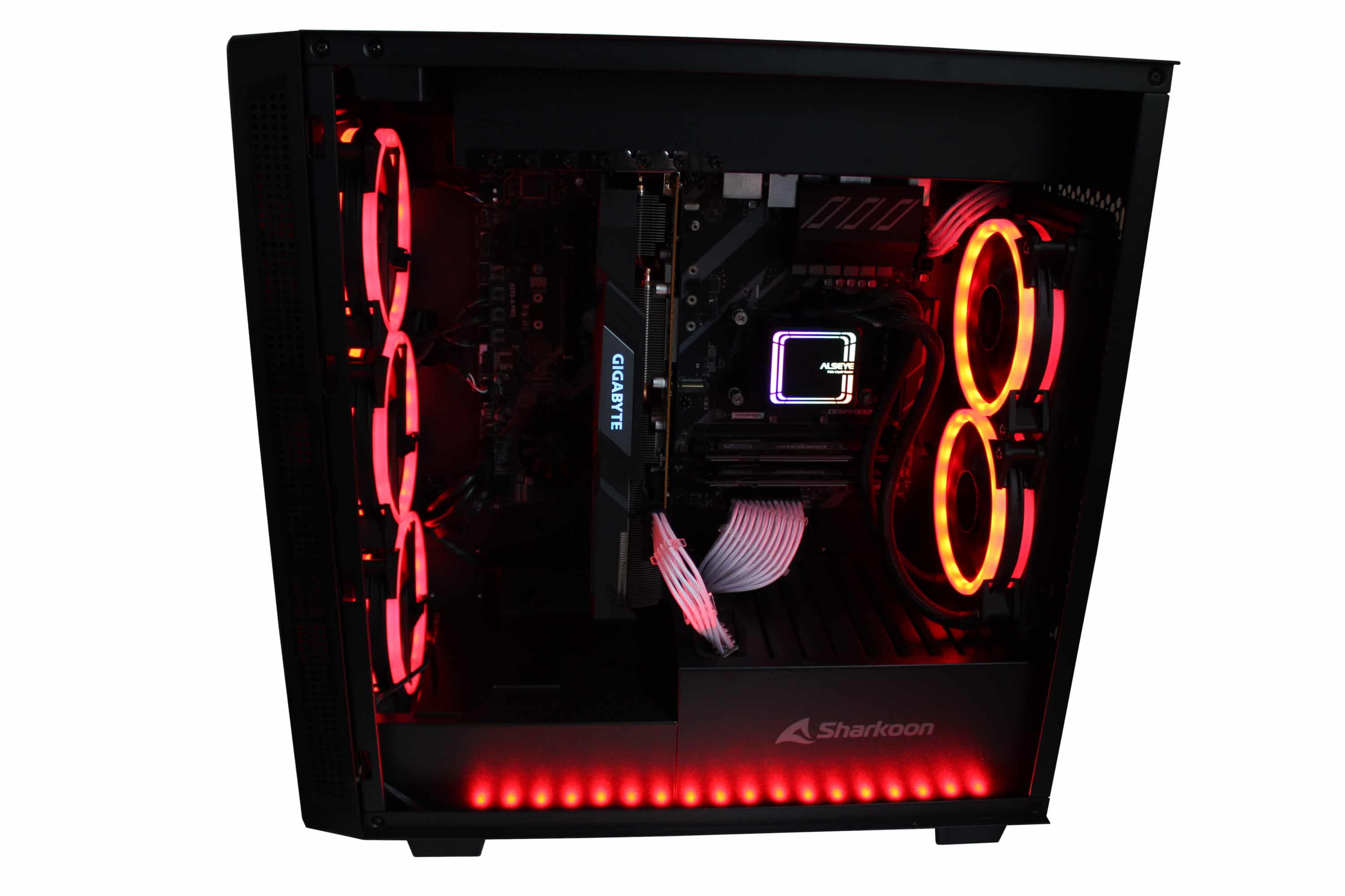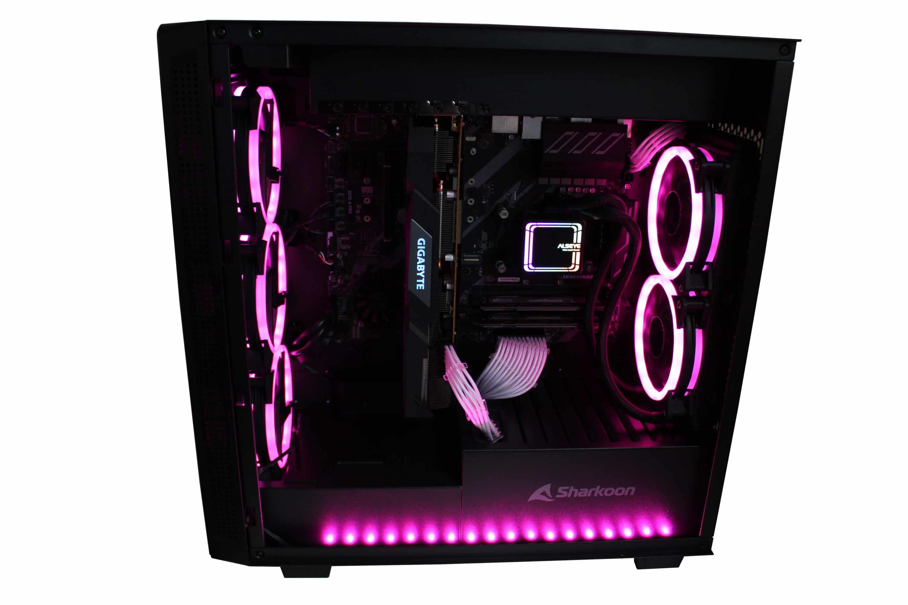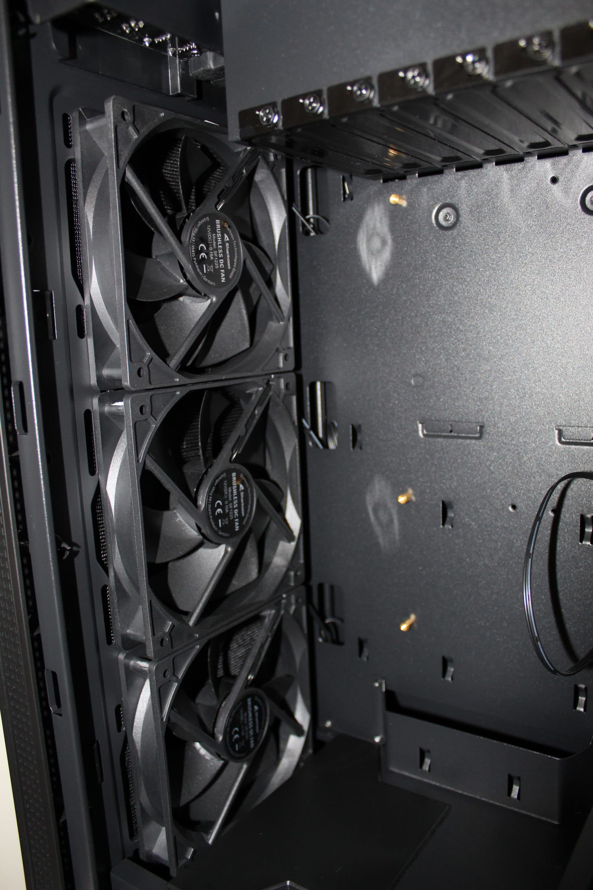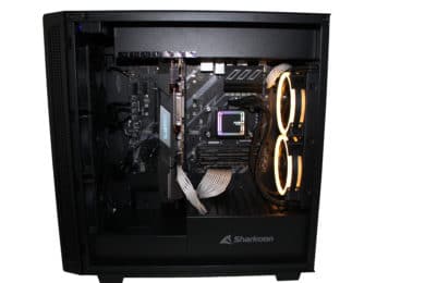 Positiv anzumerken ist die großzügige Lüfterausstattung – fünf Lüfter sind auf jeden Fall überdurchschnittlich, wenn auch nicht immer wirklich benötigt. Durch den recht restriktiven Airflow macht es hier jedoch durchaus Sinn. Dass Sharkoon hier auf eine komplette RGB-Ausstattung verzichtet, ist schade – denn das Gehäuse ist sehr auf seine Optik angelegt.