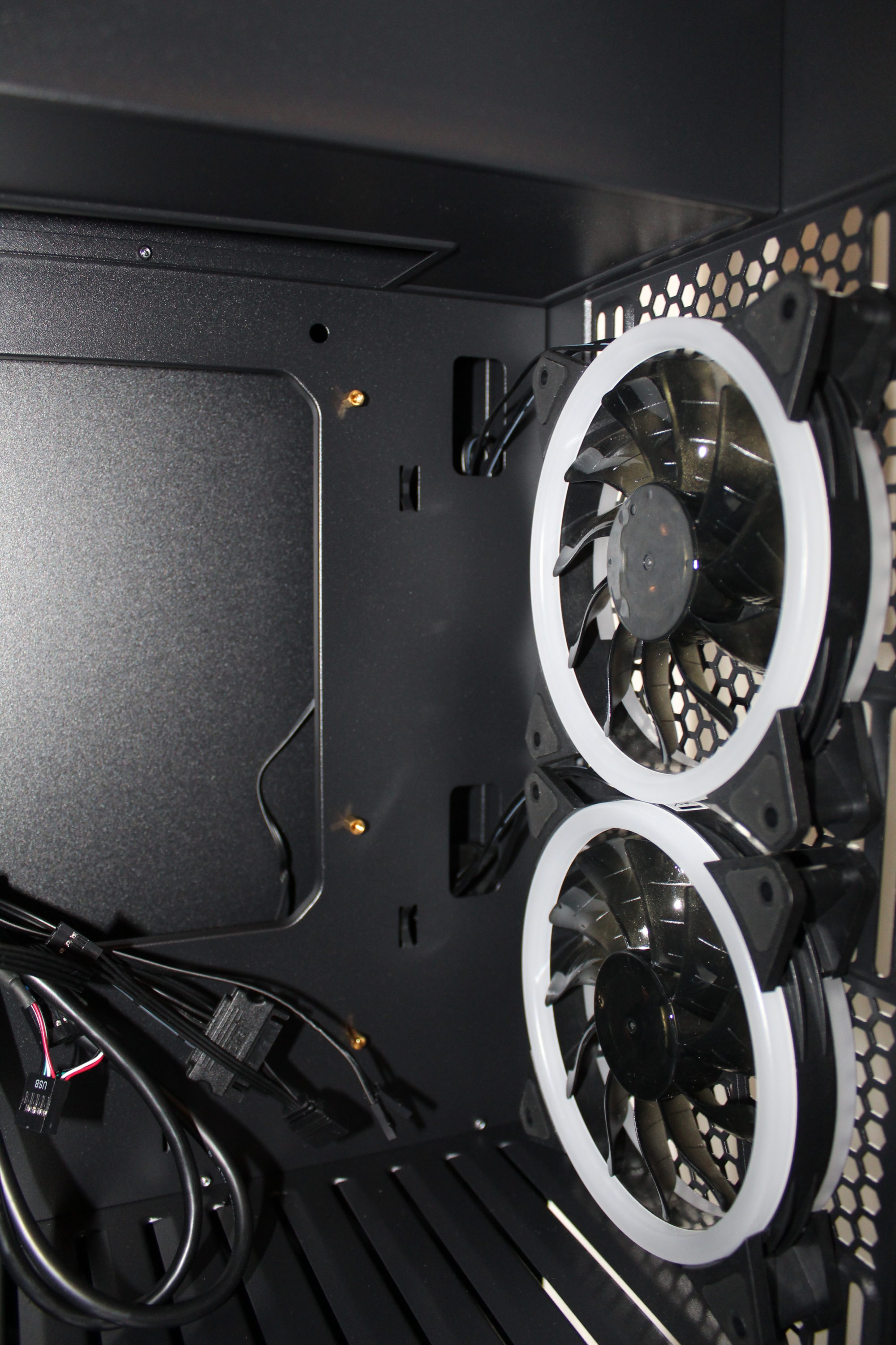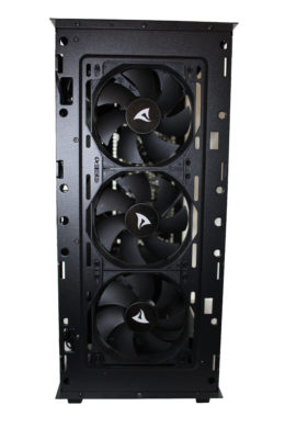 Ohne verbaute Hardware braucht man einen Moment, um zu realisieren, was hier anders ist. Links Lüfter, rechts Lüfter – GPU-Slotblenden oben, Oh! Eine rotierte Mainboardhalterung. Des Weiteren findet man drei vorinstallierte Lüfter in der Front und zwei RGB-Lüfter in der Hinterseite des Gehäuses.