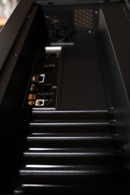 Zur Durchführung der Kabel stehen einige Aussparungen zur Verfügung. Diese werden größtenteils durch eine Gummierung verschönert – seltsamerweise wird dies jedoch nicht konsequent durchgezogen. Löblich ist jedoch, dass es an jeder denkbaren Stelle ordentliche Öffnungen gibt – so muss kein Kabel quer durchs Gehäuse gezogen werden.