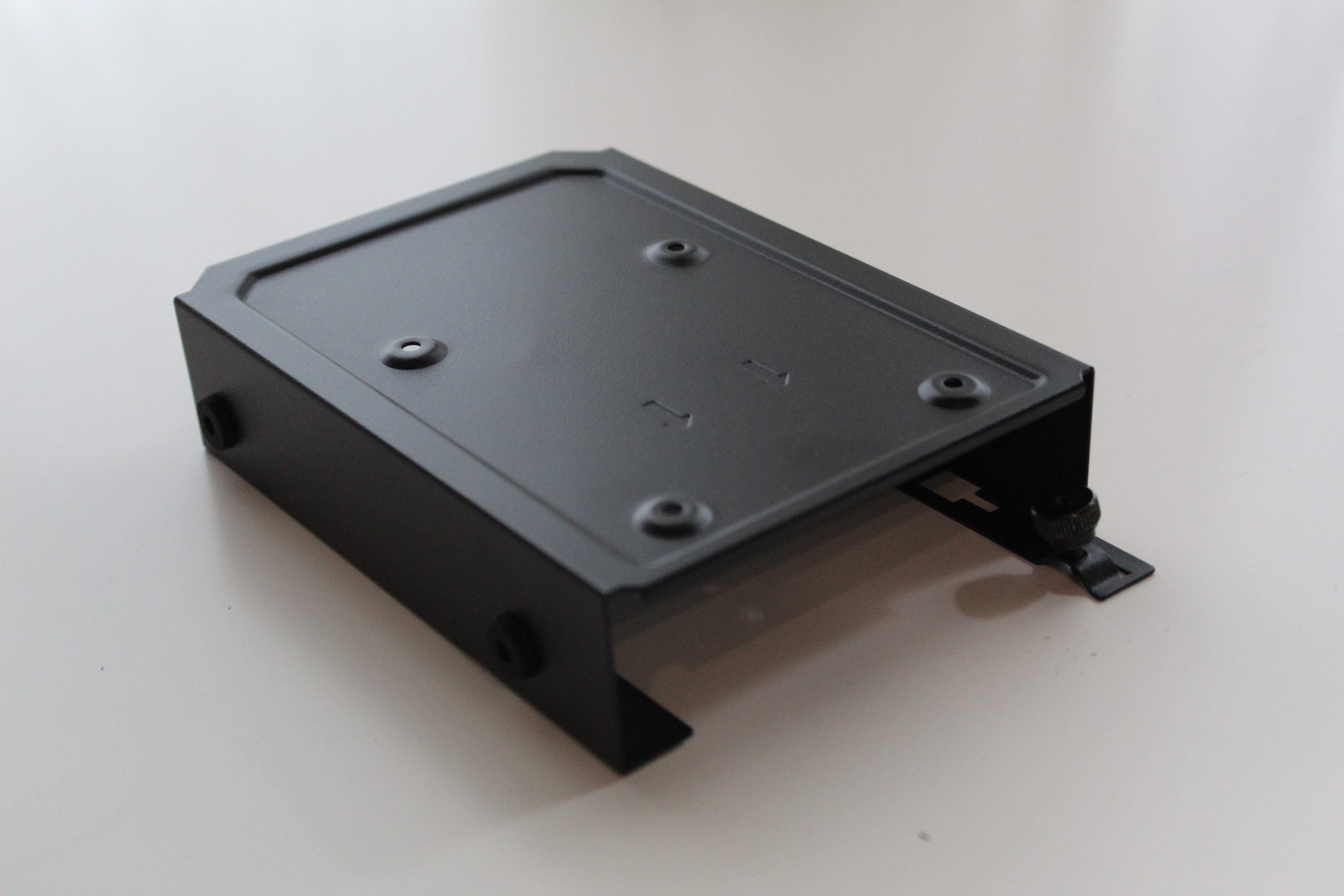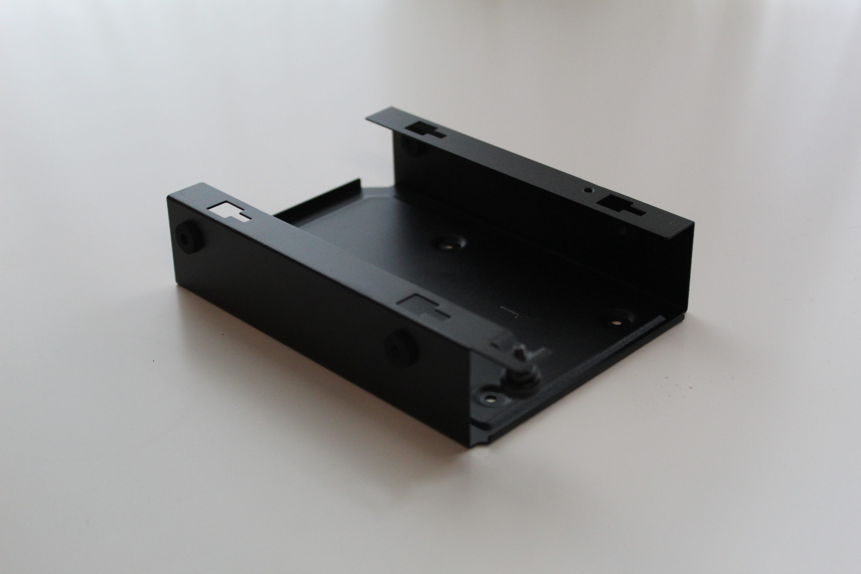 Auf der Rückseite der Mainboardkammer findet man zwei Halteschienen für 2,5″-SSDs, die eingehangen und mit einer Schraube fixiert werden. Vor dem Netzteil können ebenfalls zwei 3,5″-HDDs und zwei weitere 2,5″-SSDs montiert werden.