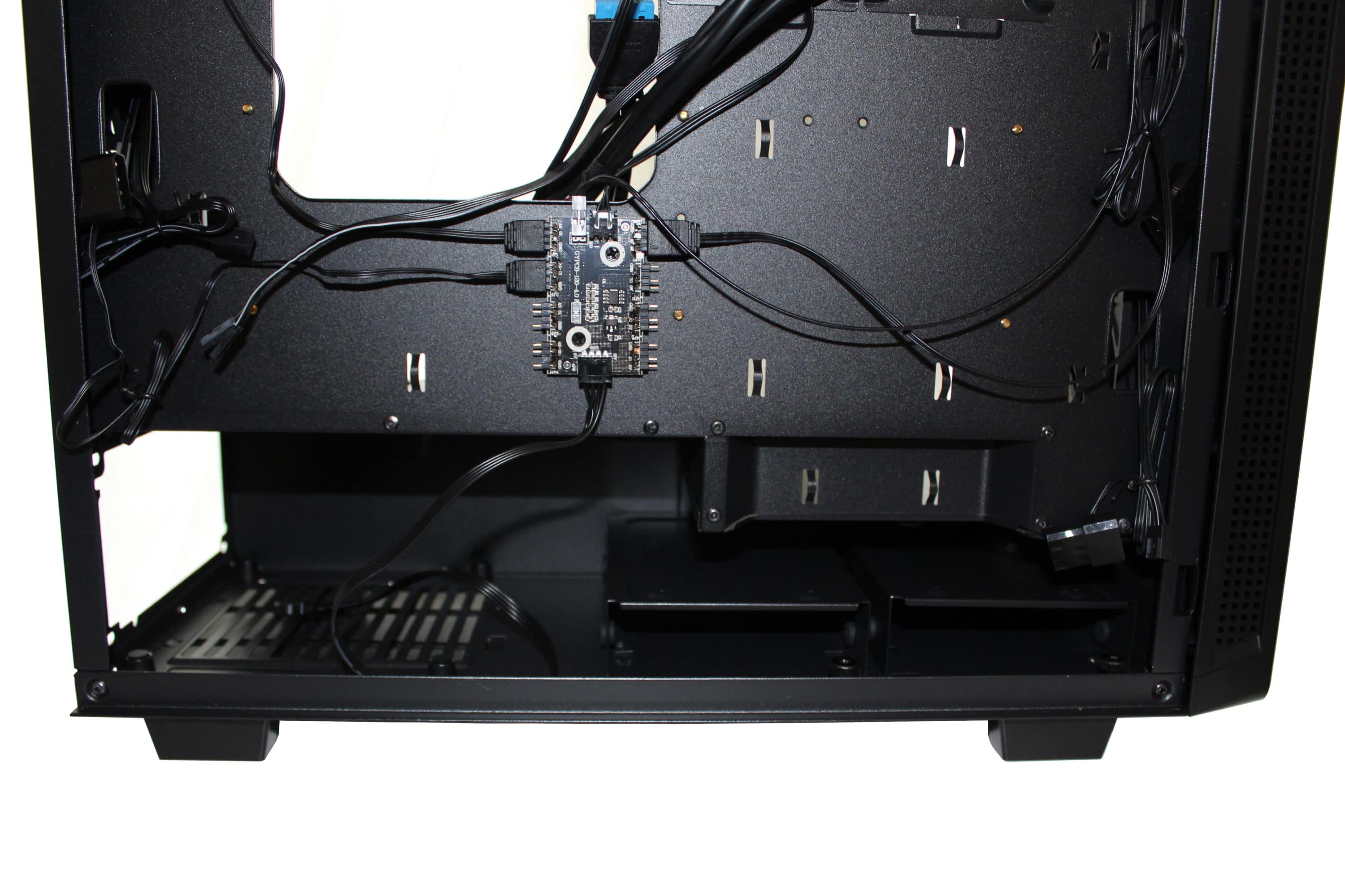 Die Montage dieser erfolgt simpel und problemfrei. In der Mitte findet man einen RGB-Splitter, den man mit dem üblichen Stecker (4-Pin-RGB-Stecker, ein Pin ist unbelegt) oder per 3-Pin-VDG an aktuellere Mainboards anschließen kann. Dieser wird zusätzlich per SATA-Stromanschluss angeschlossen, um bis zu acht ARGB-Geräte mit Strom zu versorgen. Alternativ kann man die Steuerung der ARGB-Komponenten auch per Reset-Switch am Gehäuse erfolgen. Dies ist bereits vorsorglich verbunden, ebenso wie die beiden vorhandenen ARGB-Lüfter.