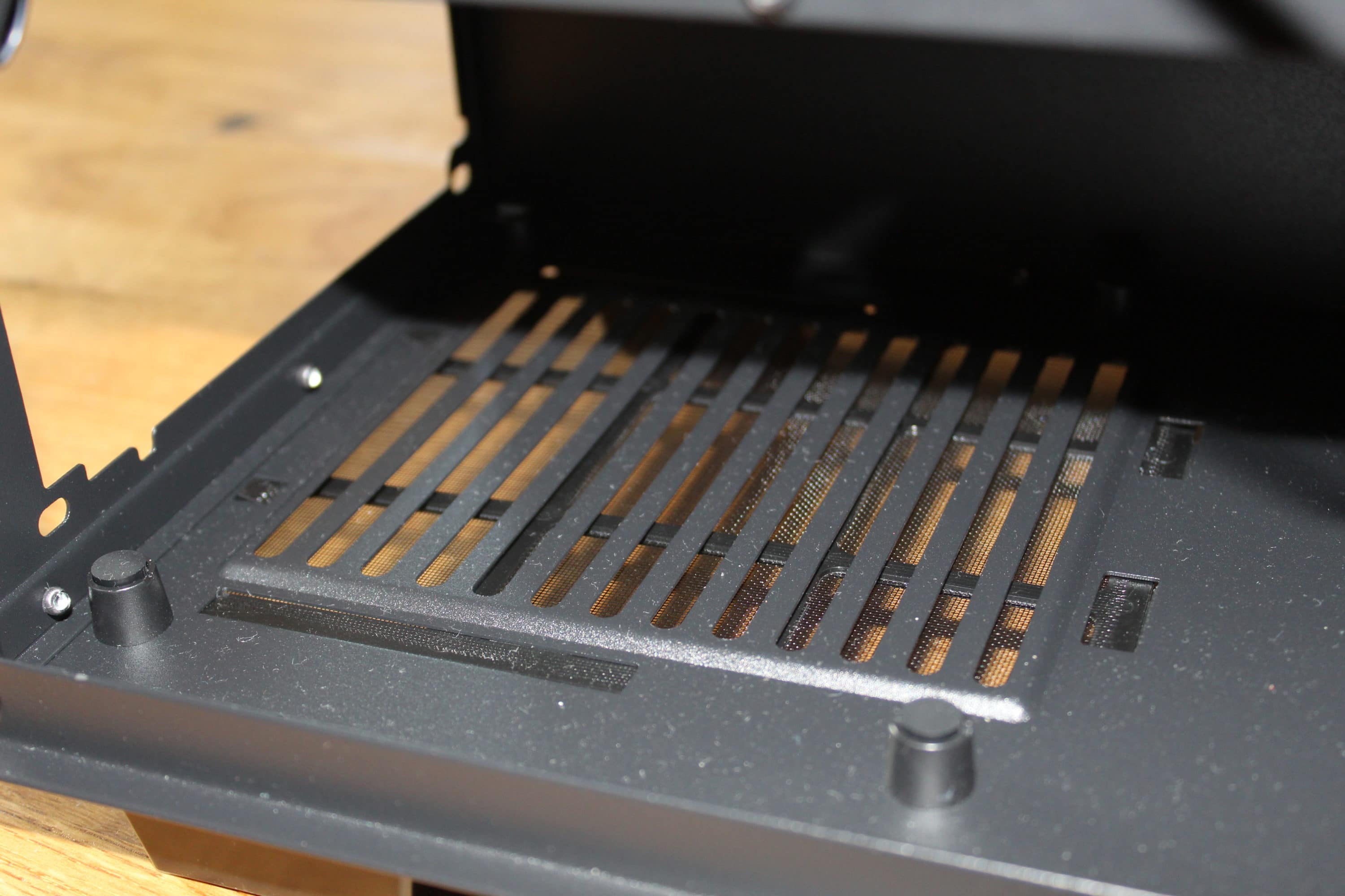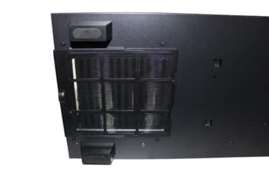 Auf der Unterseite des Gehäuses findet man einen Staubfilter, der in Metallhalterungen gesteckt wird. Dieser kann von der Vorderseite des Gehäuses aus entfernt werden. Dazu gibt es Füße aus Kunststoff, welche robust und wertig wirken – ein fester Stand ist garantiert.