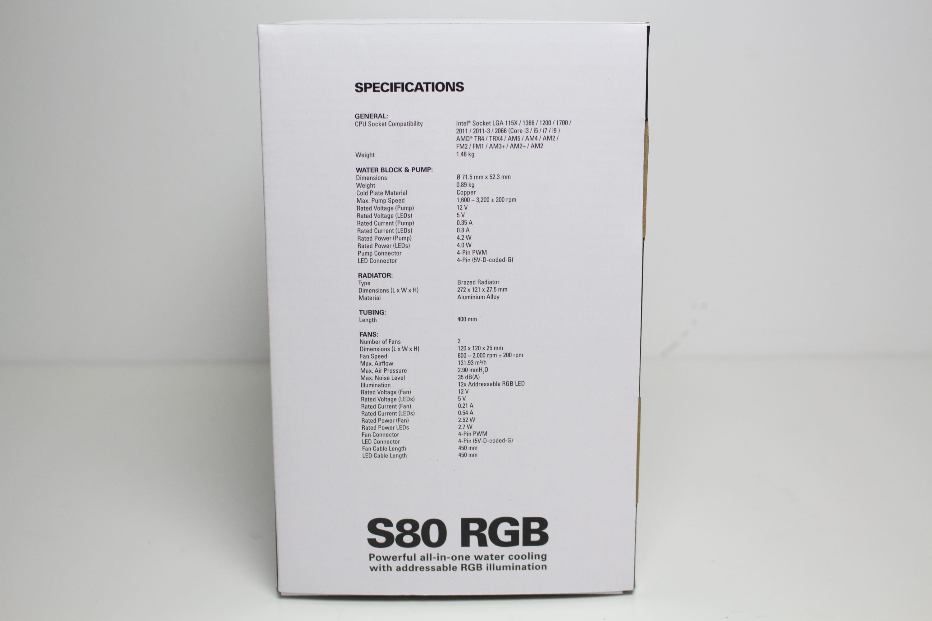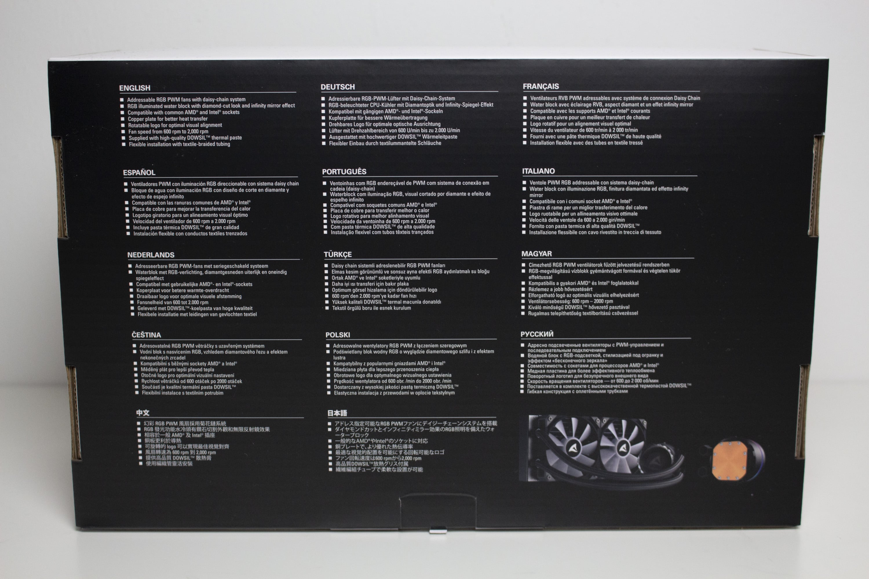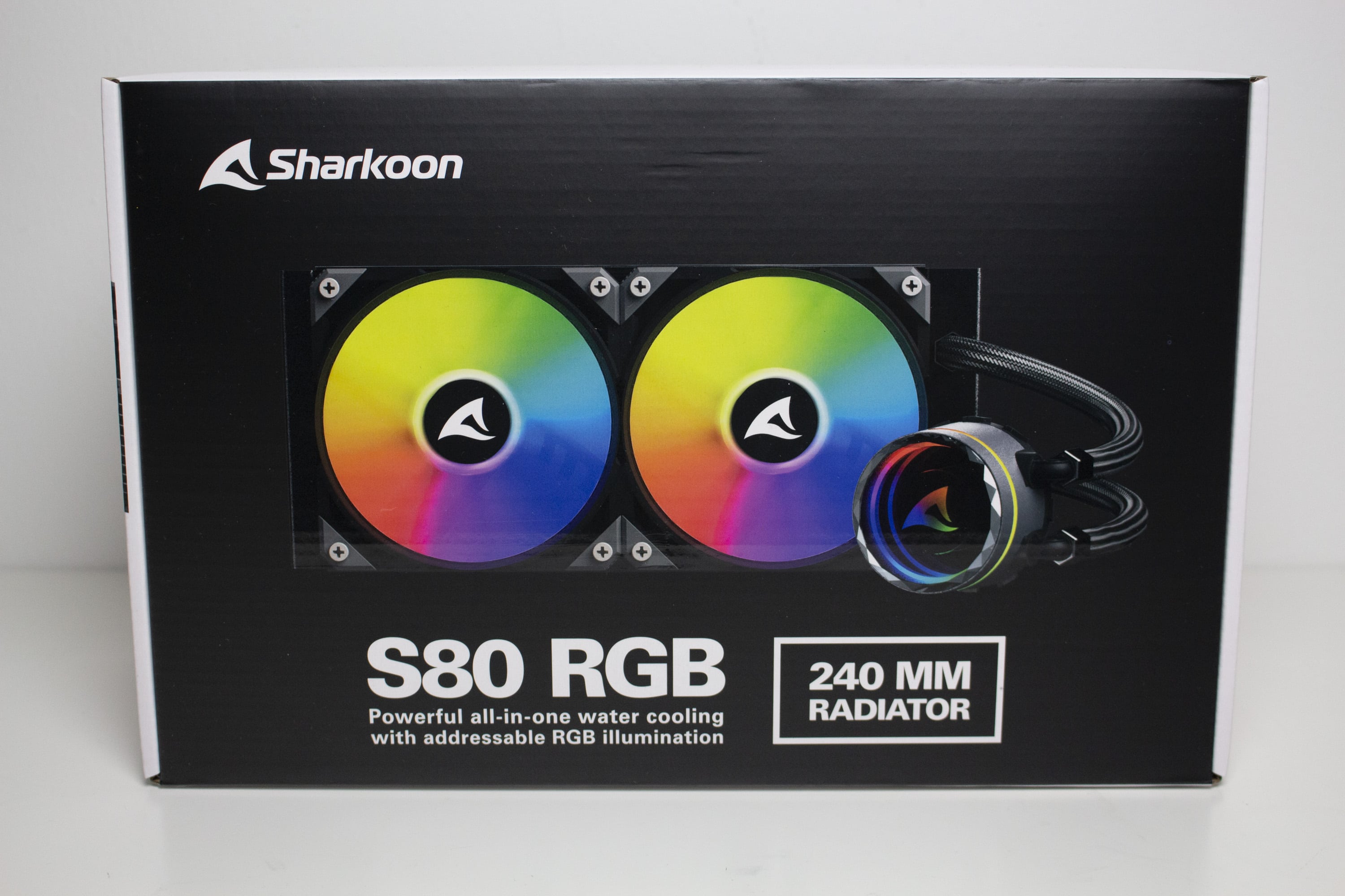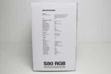 Sharkoon verpackt die S80 RGB in einer Kartonage aus farbig bedruckter Pappe auf welcher die Hauptfarben Schwarz und Weiß dominieren. Außerdem hat der Hersteller einige farbige Produktbilder auf die Verpackung drucken lassen. Weiterhin findet man Angaben zum Typ des CPU-Kühlers und Informationen zu den wichtigsten Features, alle technische Daten sowie eine Auflistung des Verpackungsinhalts. Alle Textelemente wurden in englischer Sprache und teilweise in weiteren Sprachen verfasst.