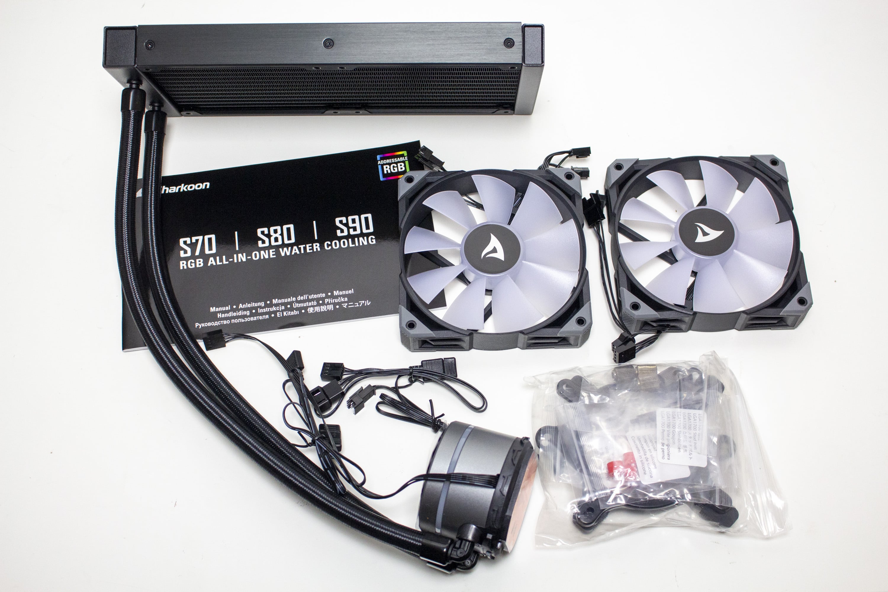 Innerhalb der Kartonage setzt Sharkoon zum Schutz aller Bauteile auf eine Form aus recycelter Pappe und einige Schutzfolien aus Kunststoff für Radiator, Schläuche, den Pumpenblock, die Lüfter und sonstiges Montagematerial. Zum Lieferumfang gehören der Radiator, zwei 120-mm-Lüfter mit RGB-Beleuchtung, eine Backplate bzw. Montagebügel aus Metall, notwendiges Montagematerial (Schrauben, Abstandshalter etc.), eine kleine Tube Wärmeleitpaste, Anschlusskabel sowie eine ausführliche Montageanleitung.