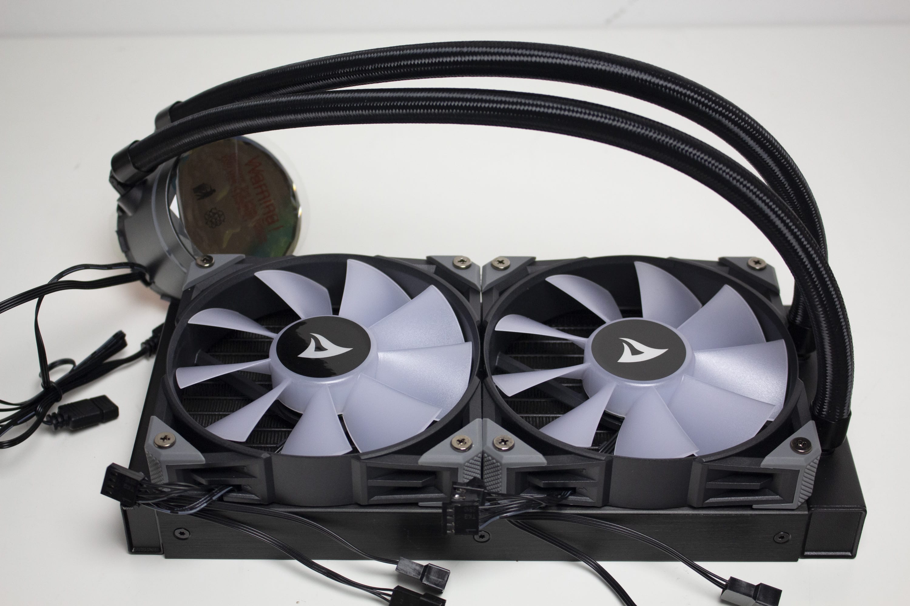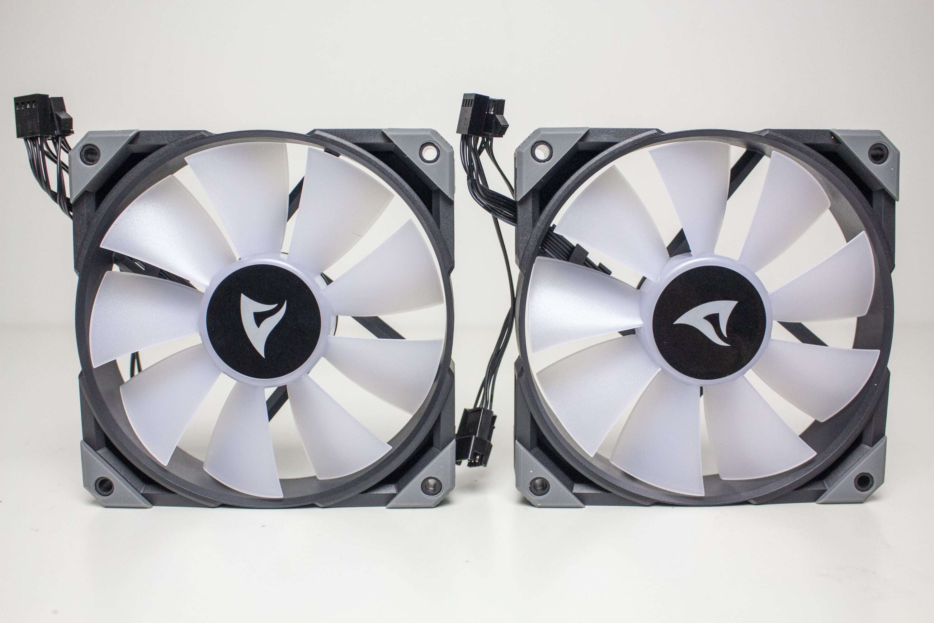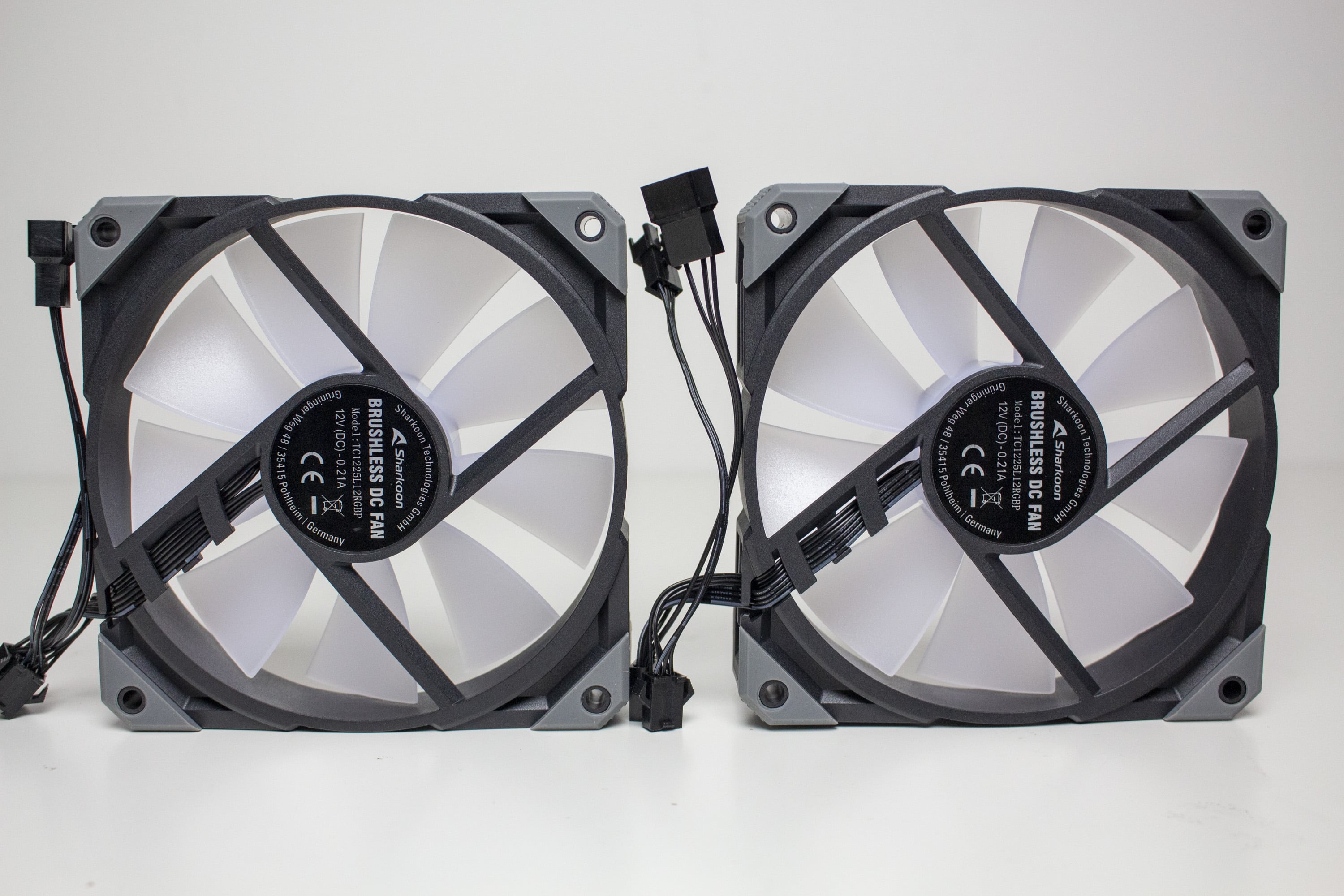 Die mitgelieferten Lüfter vom Typ „Sharkoon Brushless DC Fan“ bestehen aus einem schwarzem bzw. milchigen Kunststoff und verfügen über einen Drehzahlbereich von 600 bis 2000 Umdrehungen pro Minute. Der Anschluss erfolgt über einen 4-Pin-PWM-Stecker inklusive Y-Weiche direkt am Mainboard. Weiterhin besitzen die Lüfter an den Ecken kleine graue Gummipuffer, die eine Übertragung von Schwingungen an den Radiator oder das Gehäuse verhindern sollen.