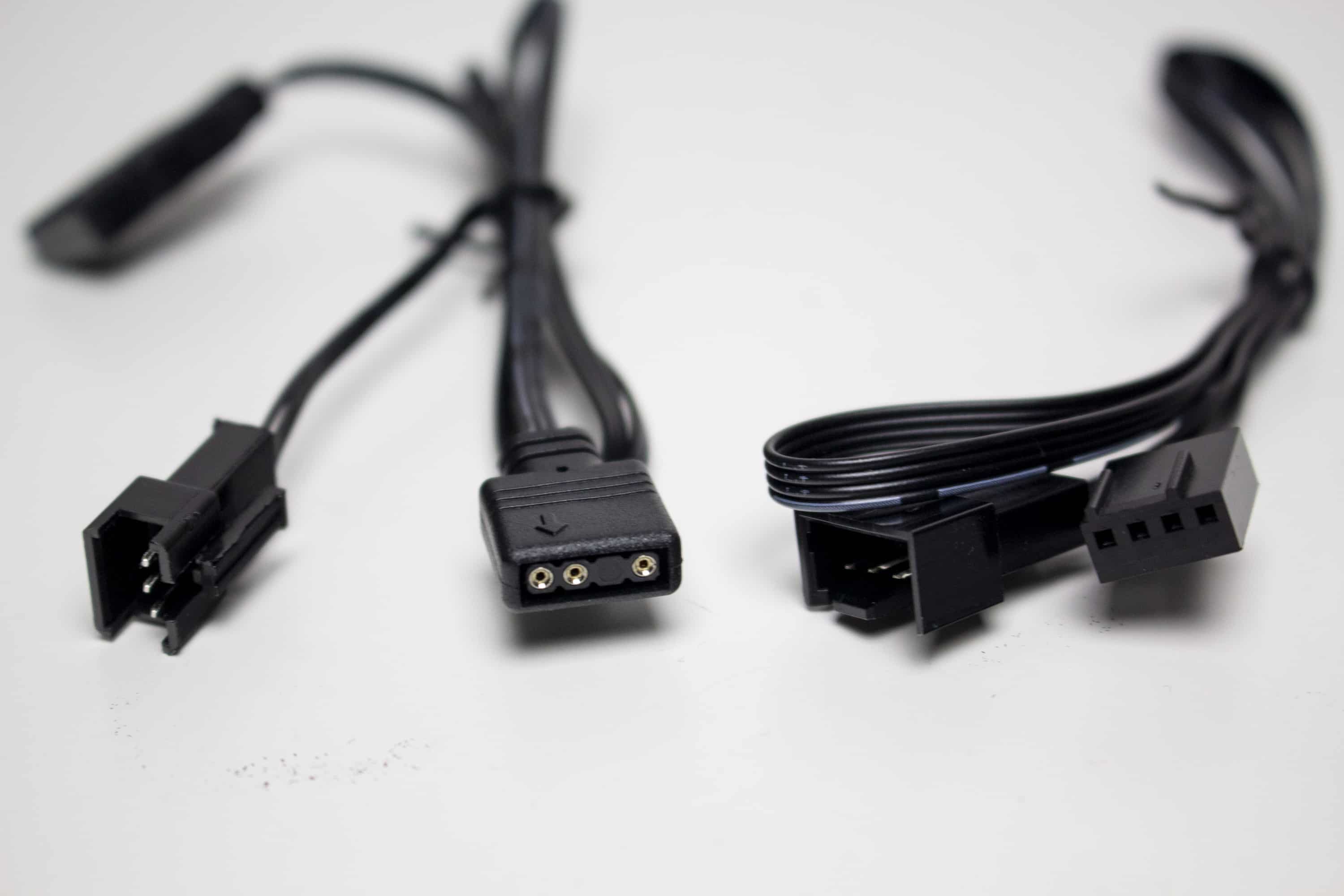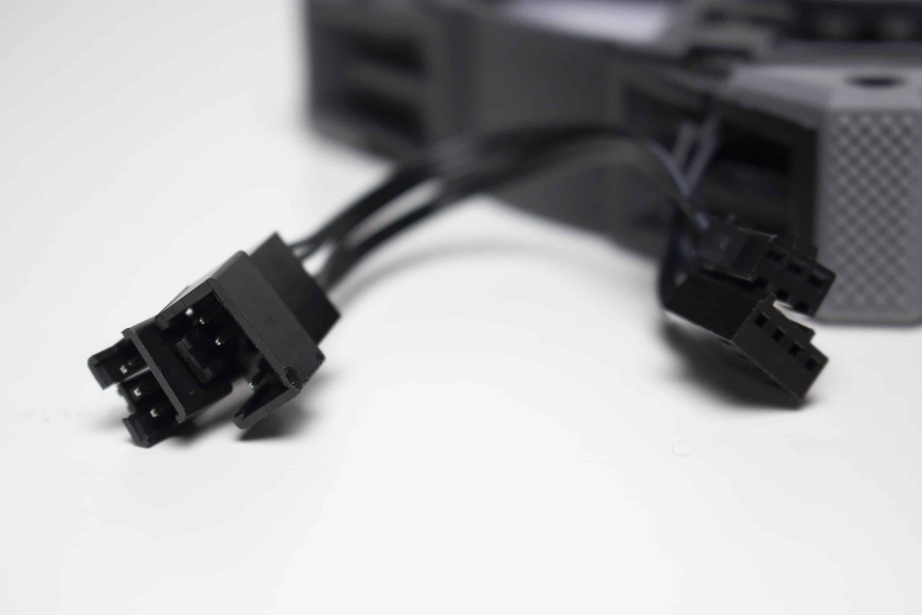 Für die Umsetzung der Beleuchtung kommen jeweils 12 adressierbare RGB-LEDs in der Lüfternabe zum Einsatz. Die Ansteuerung der LEDs erfolgt dabei über einen proprietären Anschluss, der mittels Adapter aber in einen herkömmlichen 5V-3-Pin-ARGB-Stecker umgewandelt und mit dem RGB-Kabel der Pumpe verbunden werden kann.