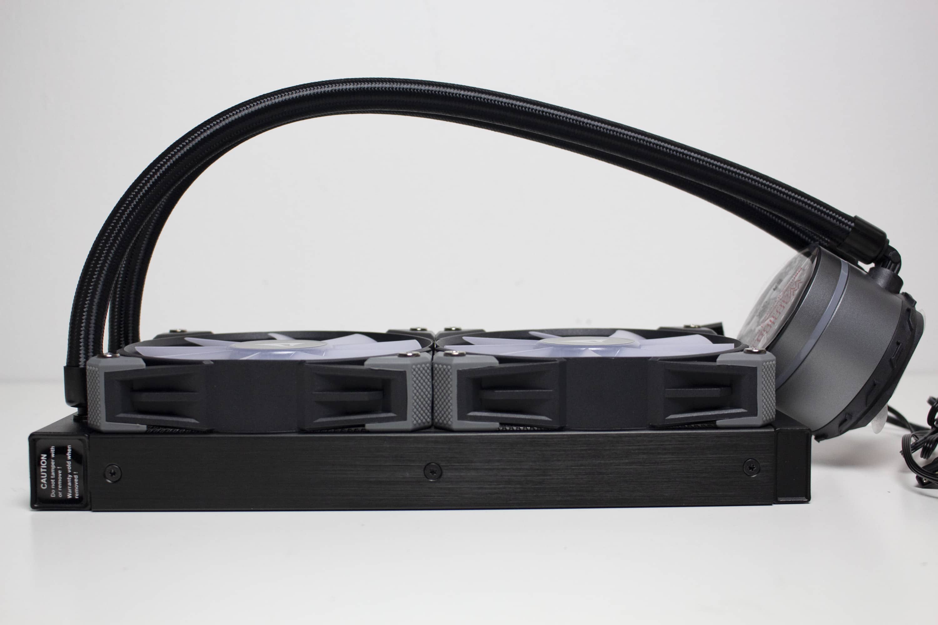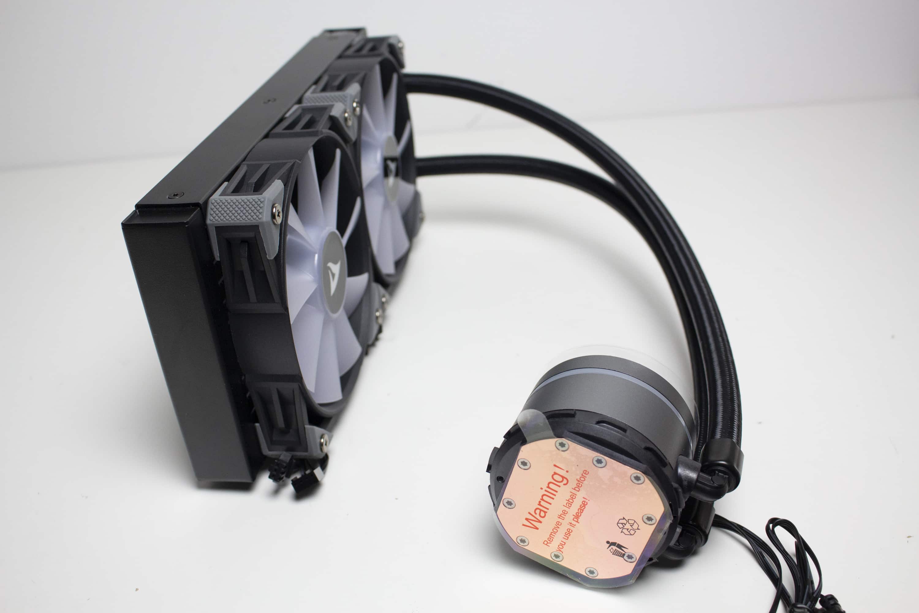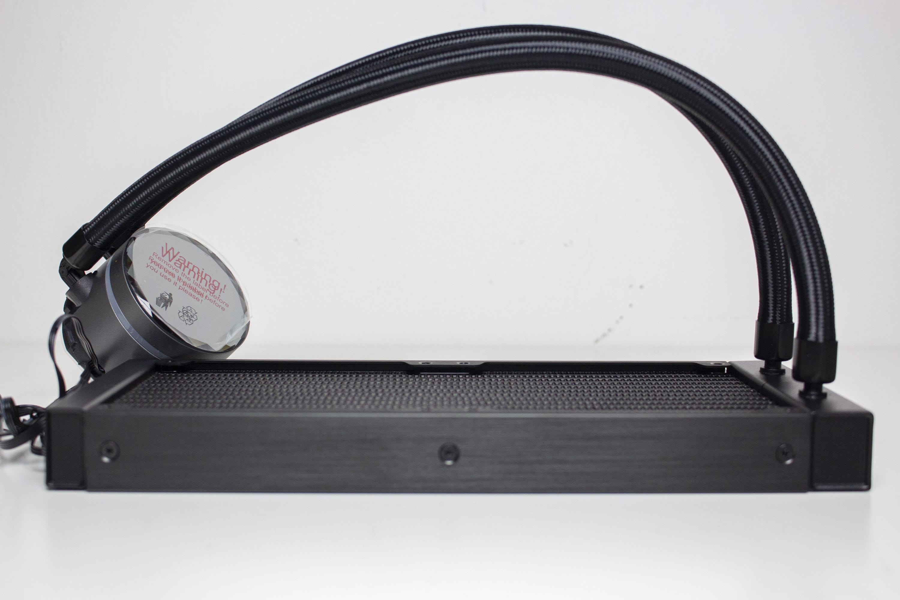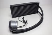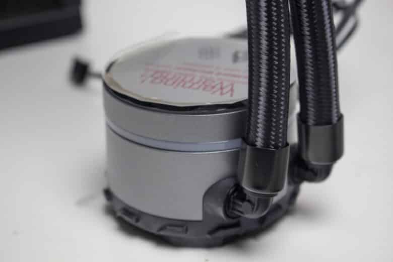 Mit einer Länge von 400 Millimetern sind die Wasserschläuche ausreichend lang um den Radiator überall in einem herkömmlichen Midi-Tower unterbringen zu können. Dazu tragen auch die drehbaren Gelenke auf Seiten des Pumpenblocks bei. Sowohl am Radiator als auch auf Seiten der Pumpe wurden die textilummantelten Schläuche in Metallmuffen gepresst. Dadurch wird die Lösung zu einem geschlossenen System, bei dem der Kühlkreislauf nicht erweitert werden kann.