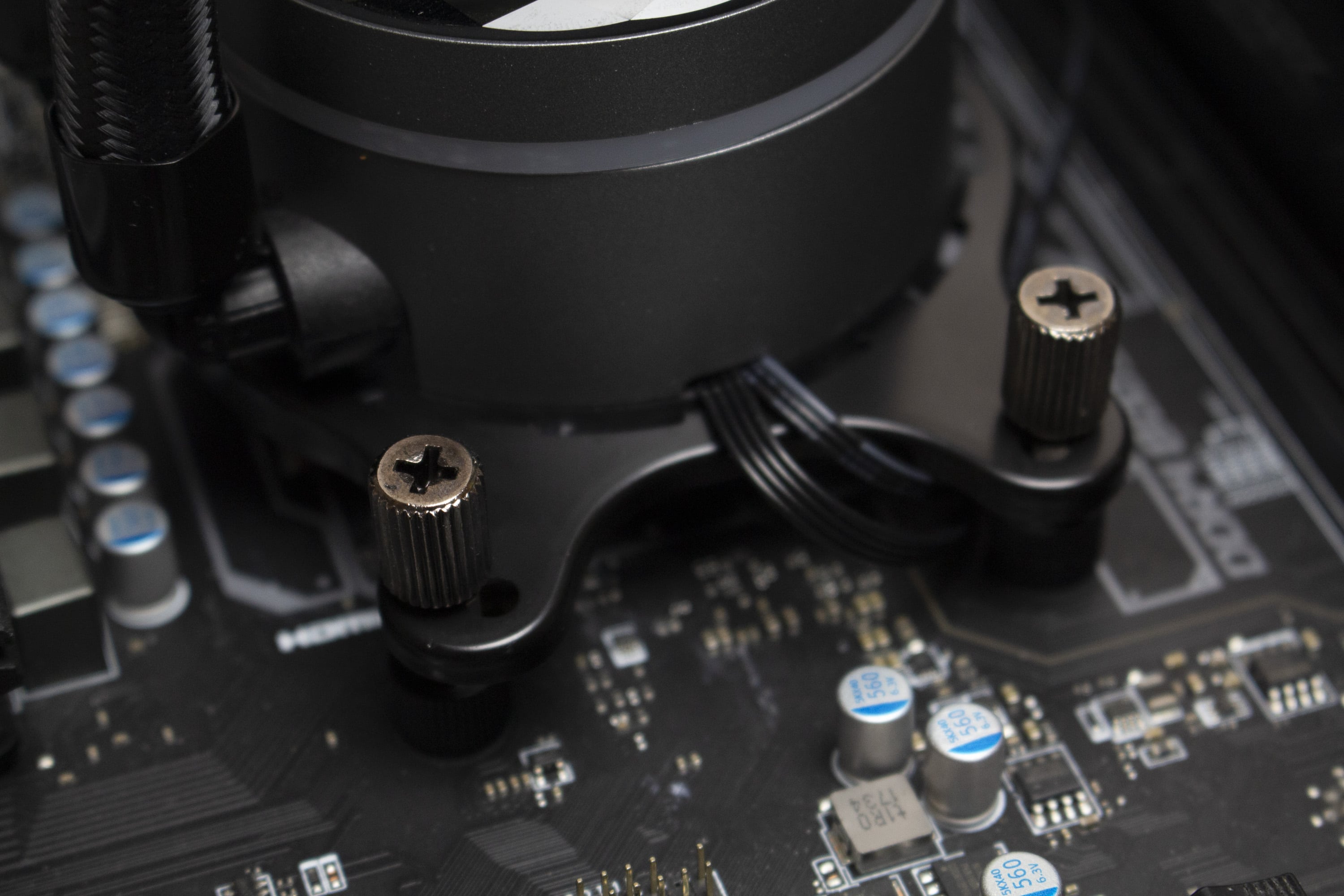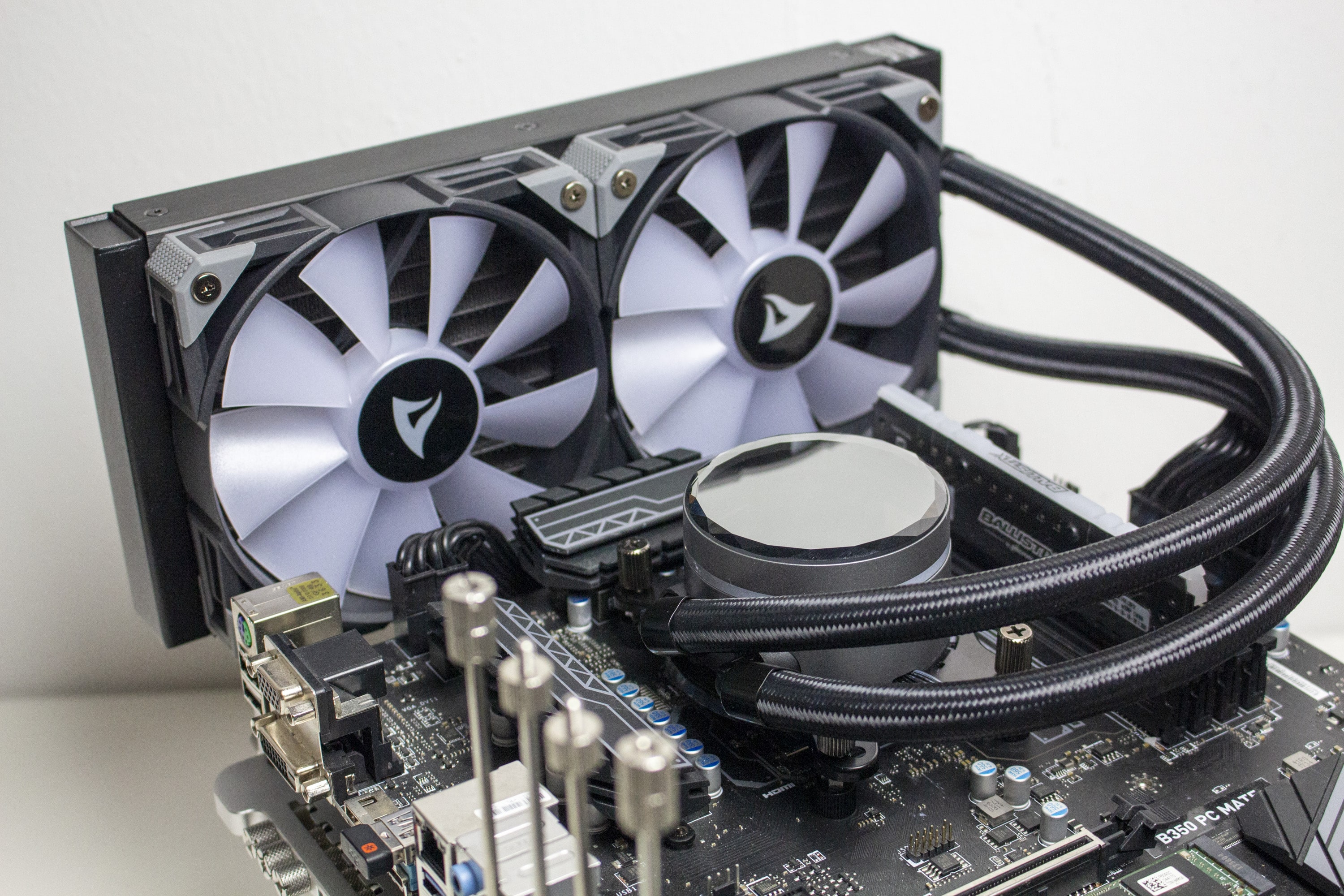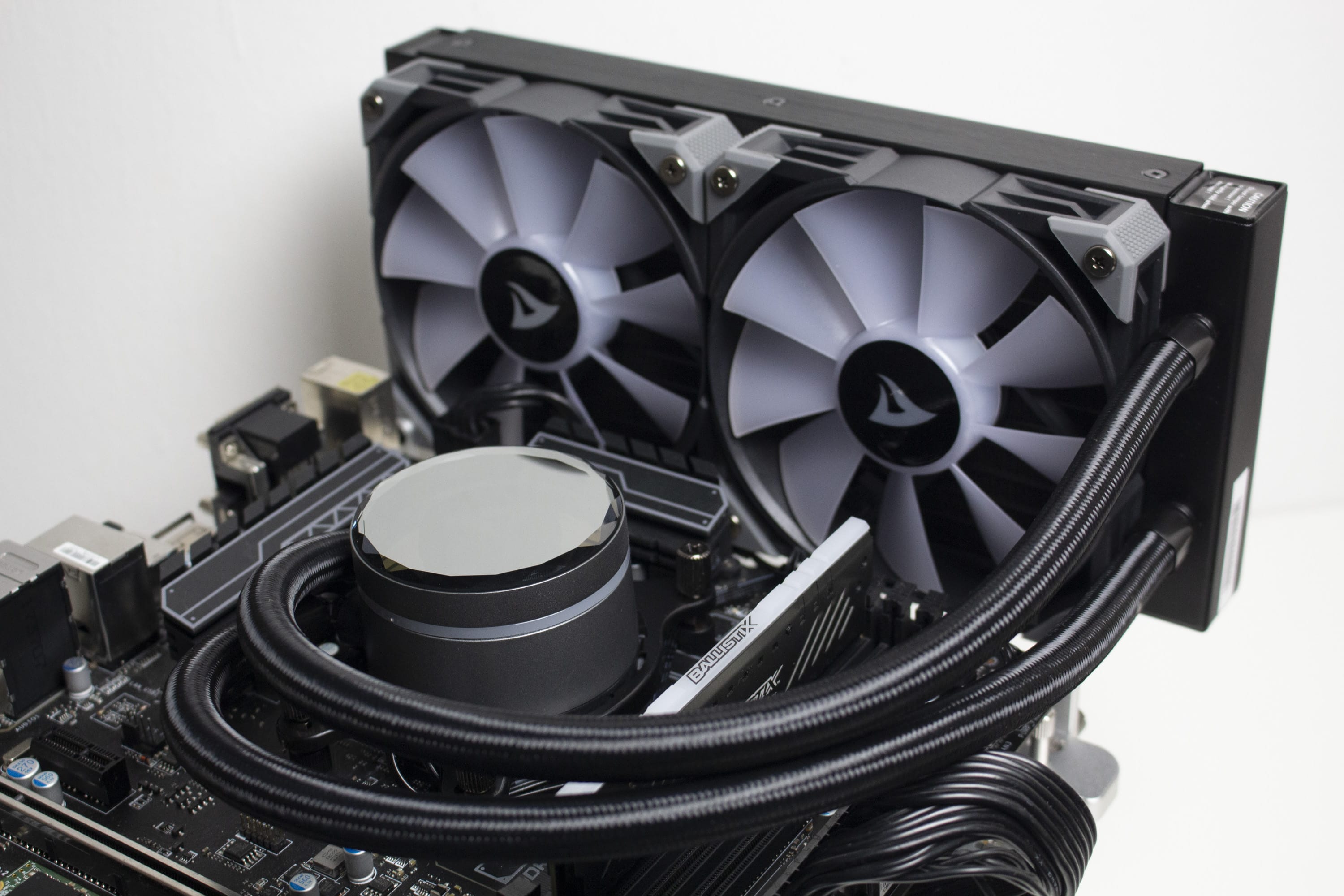 Mit einer Länge von 400 Millimetern sind die Wasserschläuche ausreichend lang um den Radiator überall in einem herkömmlichen Midi-Tower unterbringen zu können. Dazu tragen auch die drehbaren Gelenke auf Seiten des Pumpenblocks bei. Sowohl am Radiator als auch auf Seiten der Pumpe wurden die textilummantelten Schläuche in Metallmuffen gepresst. Dadurch wird die Lösung zu einem geschlossenen System, bei dem der Kühlkreislauf nicht erweitert werden kann.