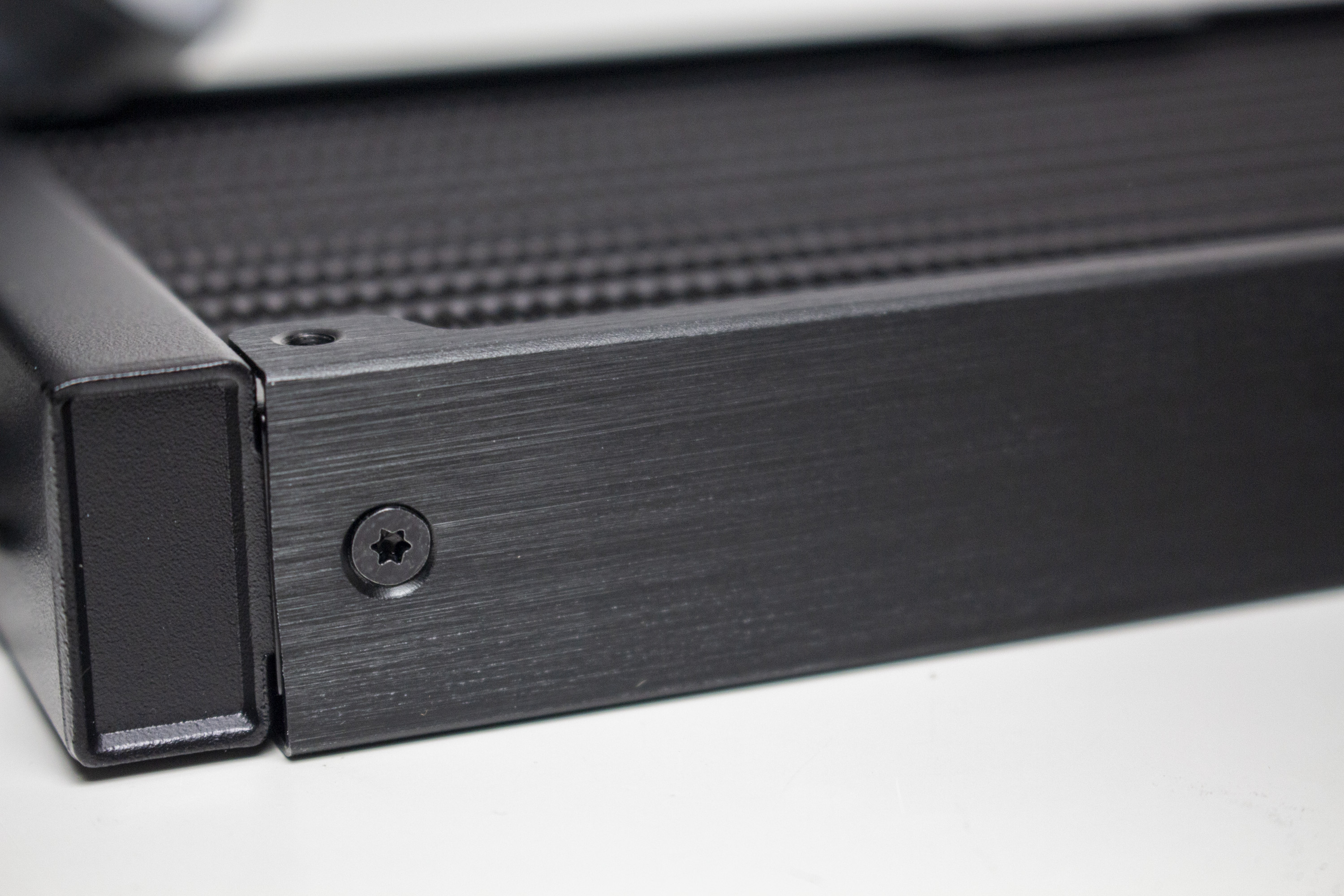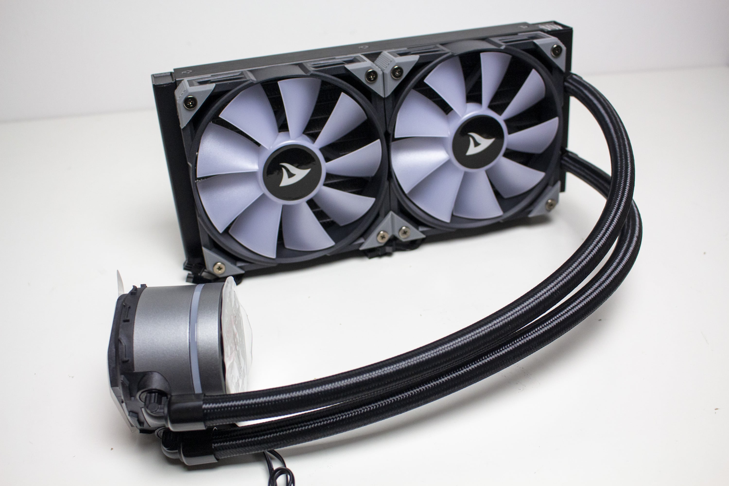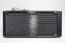 Wie viele andere Hersteller auch, setzt Sharkoon auf einen schlichten Radiator aus Aluminium. Die Lamellen wurden verlötet und schwarz lackiert. Schriftzüge des Herstellers oder Beleuchtungselemente findet man nicht. Dafür wurden die zwei Enden des Radiators aber schwarz pulverbeschichtet und die länglichen Seiten mit einer Abdeckplatte aus gebürstetem Aluminium verkleidet. Mit einer Höhe von 27,5 Millimetern liegt er im Durchschnitt vieler handelsüblicher Kompaktwasserkühlungen.