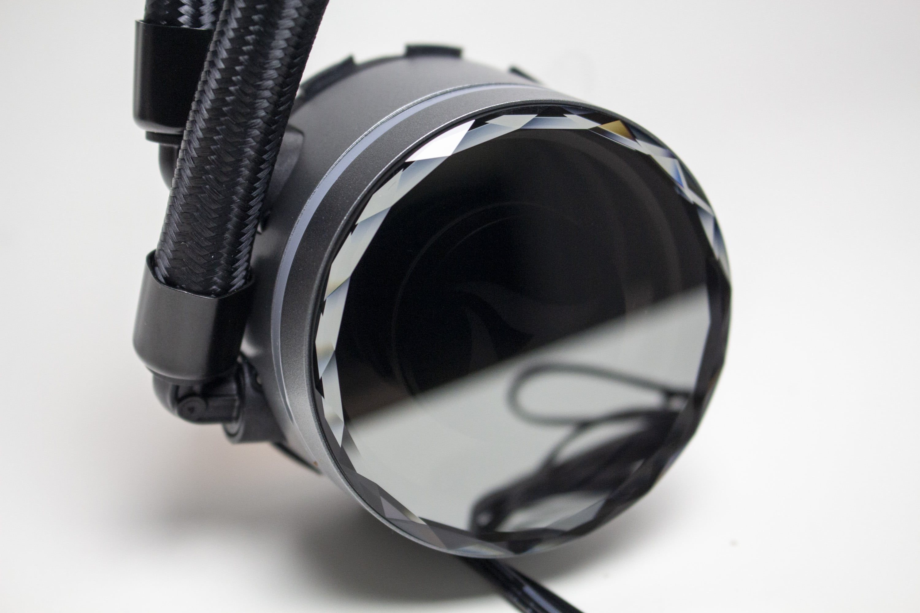 Im Deckel der Pumpe finden wir hingegen eine verspiegelte Oberfläche, hinter der sich zahlreiche RGB-LEDs bzw. ein beleuchtetes Herstellerlogo befinden und die von einem Ring in Diamantoptik umrandet ist. Wird die Beleuchtung aktiviert, zeigt sich dort ein Infinity-Spiegel-Effekt. Die Ansteuerung der LEDs erfolgt per 5V-3-Pin-Kabel über das Mainboard. Des Weiteren befindet sich auch seitlich um den Pumpenblock herum ein weiterer RGB-Streifen. Ein letztes gutes Feature ist, dass der Deckel mit dem Logo gedreht werden kann. Dadurch muss dieses nie auf dem Kopf stehen.