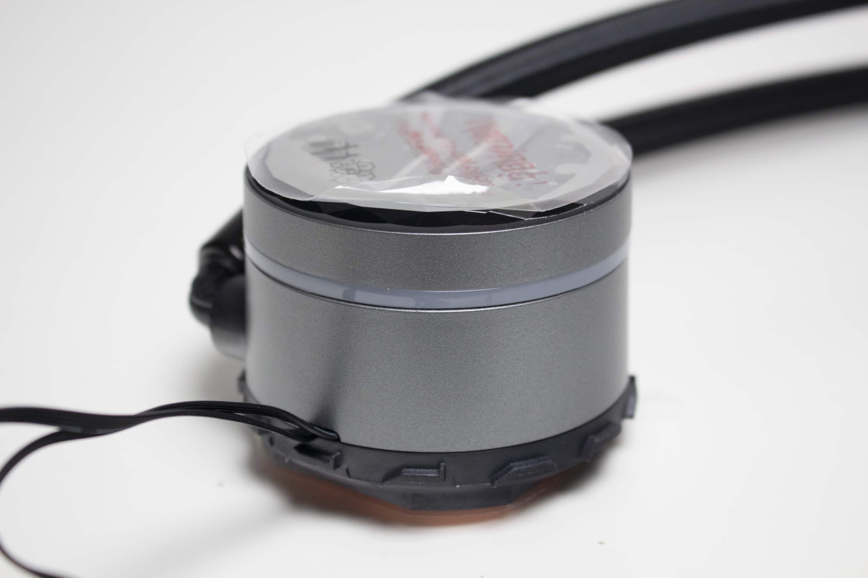 Als Basis des Pumpenblocks setzt Sharkoon auf eine Bodenplatte aus Kupfer, die in ein Pumpengehäuse aus Kunststoff eingearbeitet wurde. Zur Verbesserung von Optik und Wertigkeit wurde das Gehäuse zudem mit einem Element aus gräulichem Aluminium ummantelt. Die im Block eingebaute Pumpe dreht zwischen 1600 und 3200 Umdrehungen pro Minute und wird über einen 4-Pin-PWM-Stecker mit dem Mainboard verbunden.