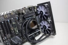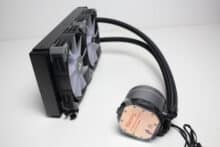 Bringt man Radiator und Lüfter zu einem einem Komplettpaket zusammen, dann ist die Kombination 52,5 Millimeter hoch und ca. 1,5 Kilogramm schwer. Damit sollte die Kompaktwasserkühlung auch in Gehäuse passen, die nicht so viel Platz für Wasserkühlungskomponenten bieten. In Bezug auf die Verarbeitungsqualität konnten wir weder an den Lüftern noch am Radiator oder der Pumpeneinheit Verarbeitungs- oder Lackierungsfehler feststellen. Zudem gab es keine verbogenen Lamellen oder unschöne Kratzer.