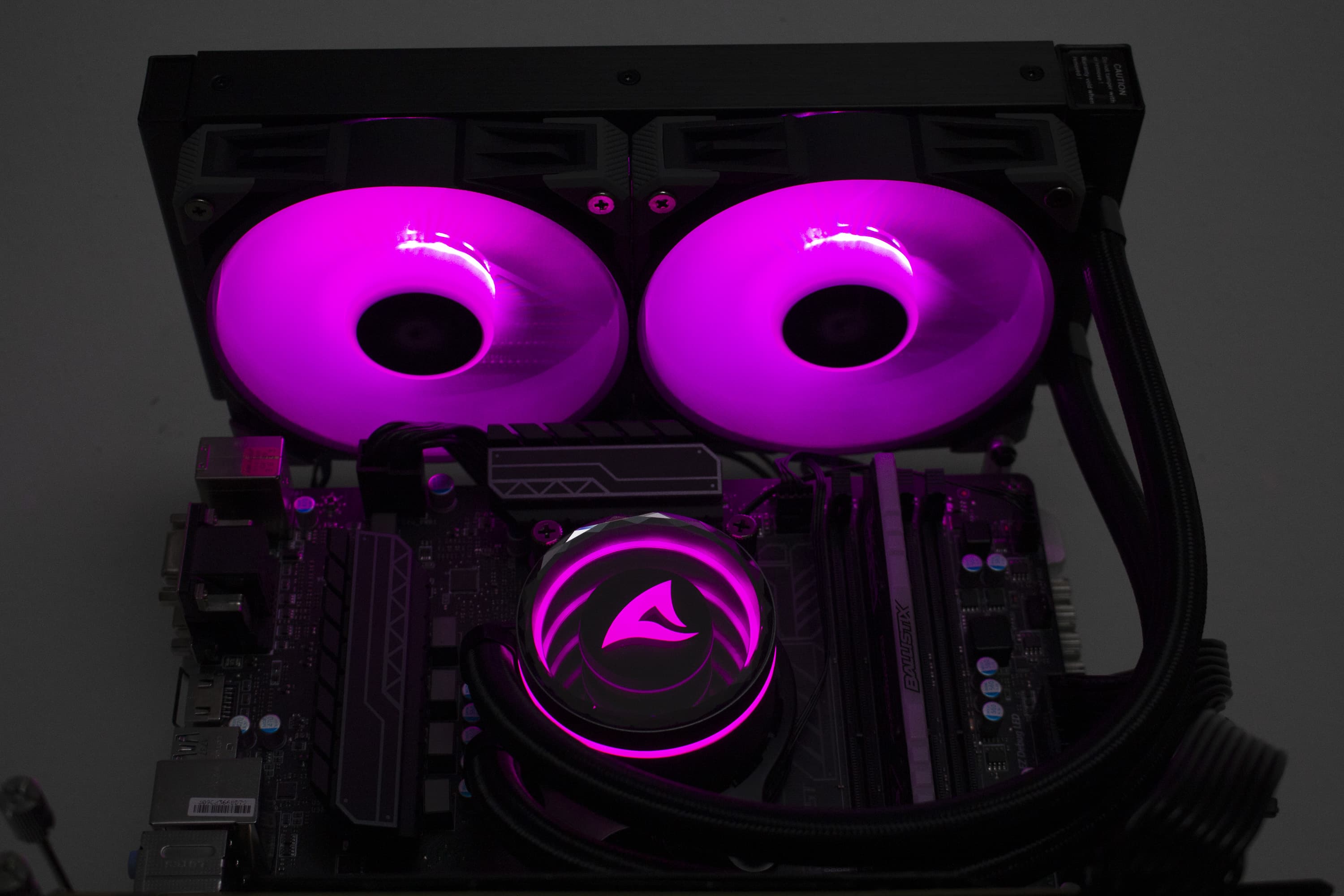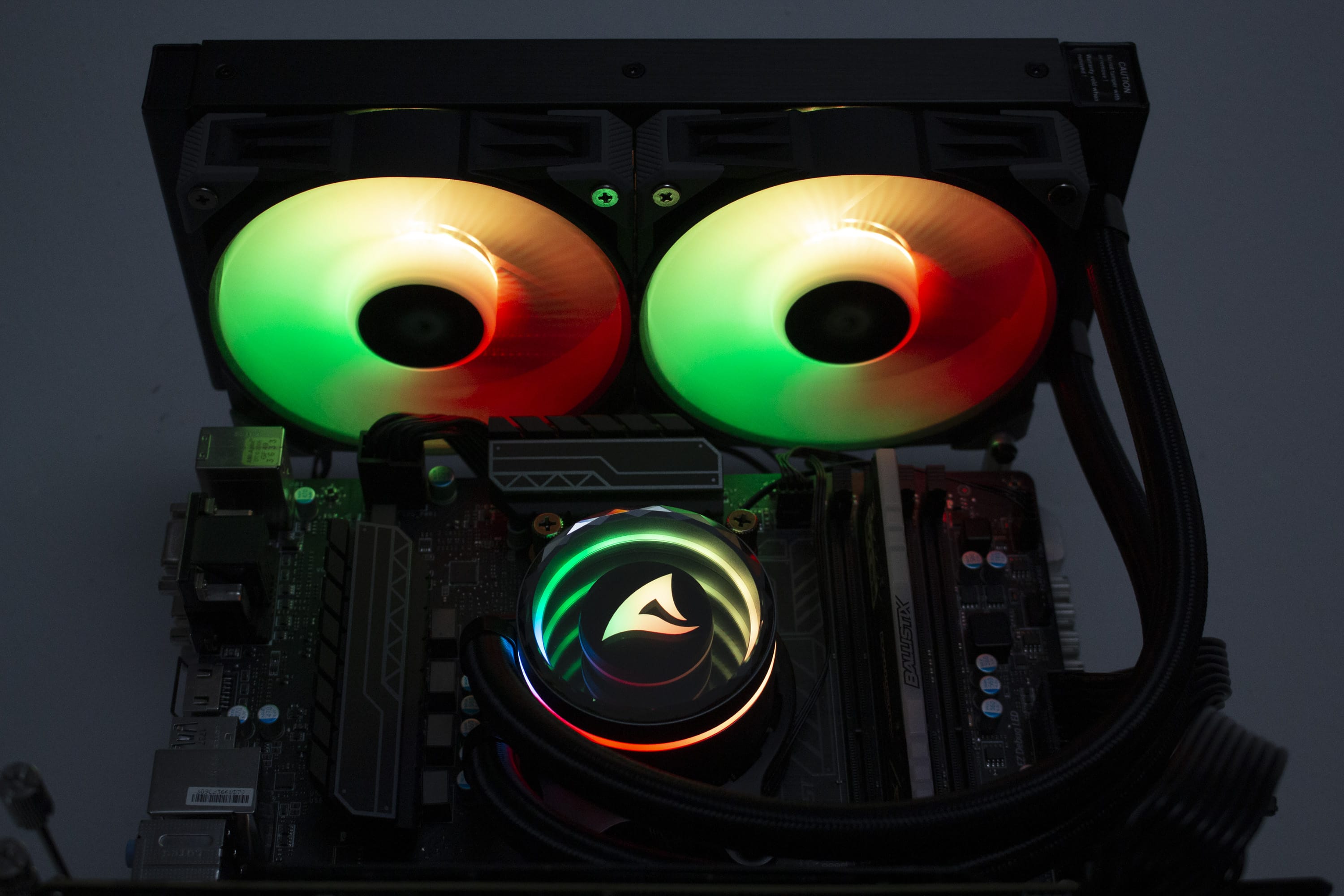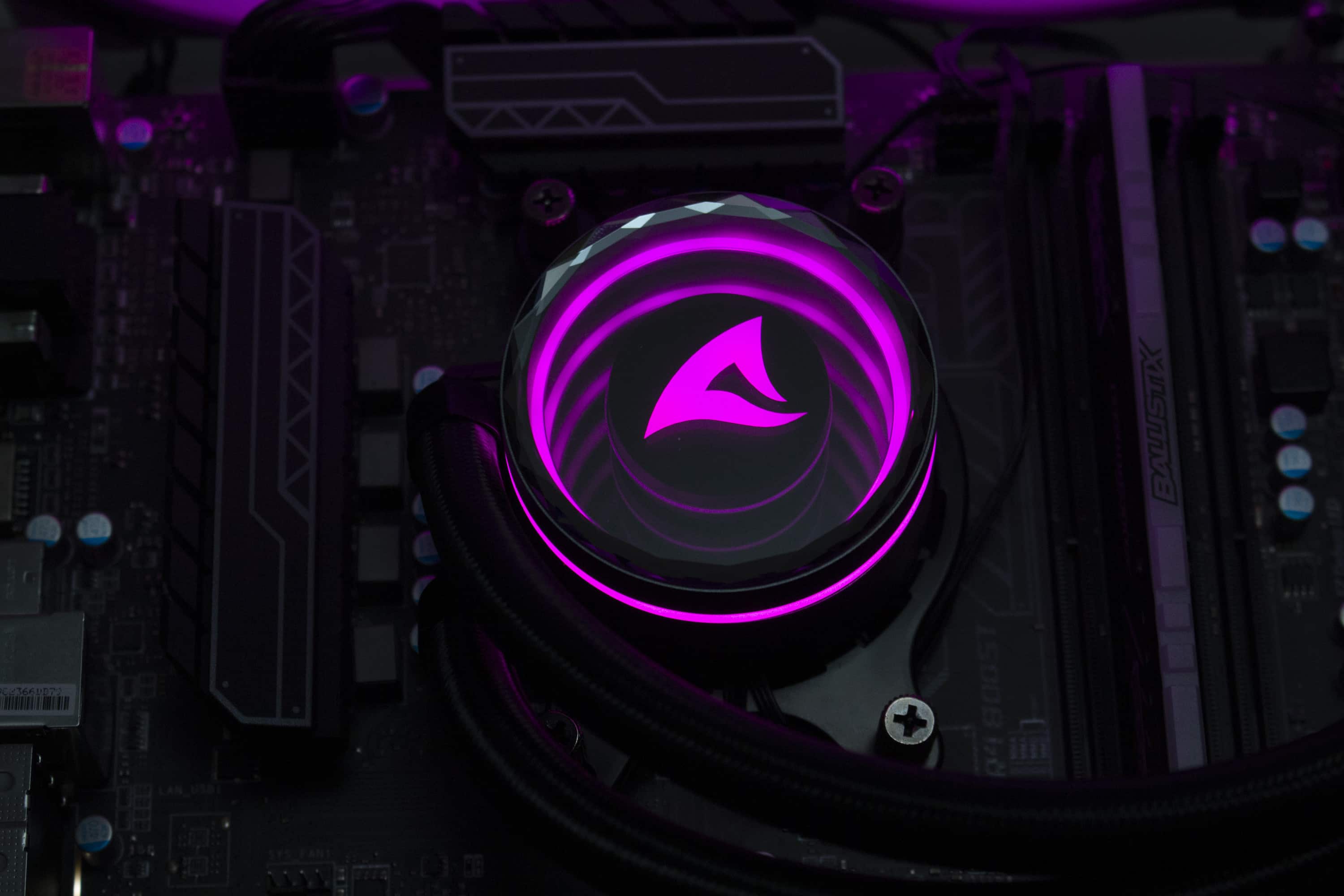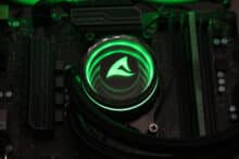 Die Sharkoon S80 RGB verfügt über diverse ARGB-Elemente, die über das Mainboard angesteuert werden können. Dazu gehören sowohl die Lüfter, deren Lüfternabe über entsprechende LEDs verfügt, als auch der Pumpenblock, an dem sich unterhalb der Spiegelplatte weitere LEDs befinden. Die Ansteuerung erfolgt über den 3-Pin-5V-ARGB-Stecker am Pumpenblock. Die Anschlüsse der Lüfter werden über ein mitgeliefertes Kabel direkt mit dem Pumpenblock verbunden. Dadurch benötigt das Mainboard nur einen einzigen ARGB-Anschluss für die Ansteuerung der Beleuchtung. Abschließend noch ein paar Impressionen der aktivierten Beleuchtung.