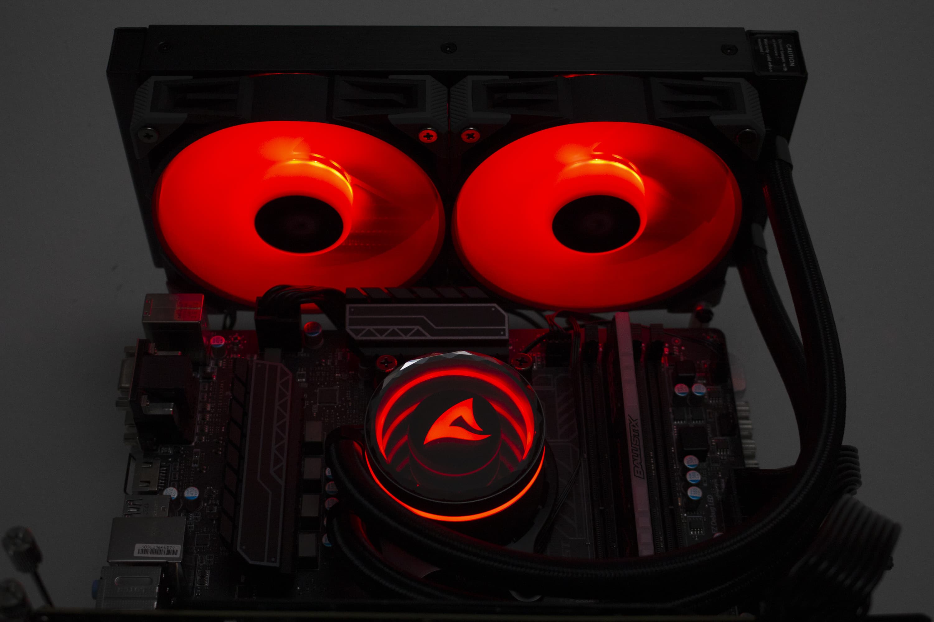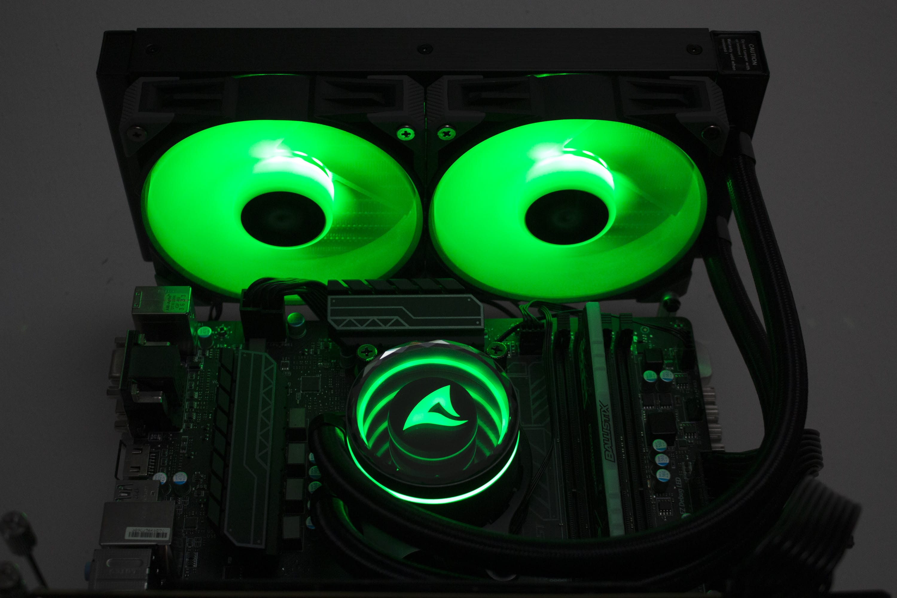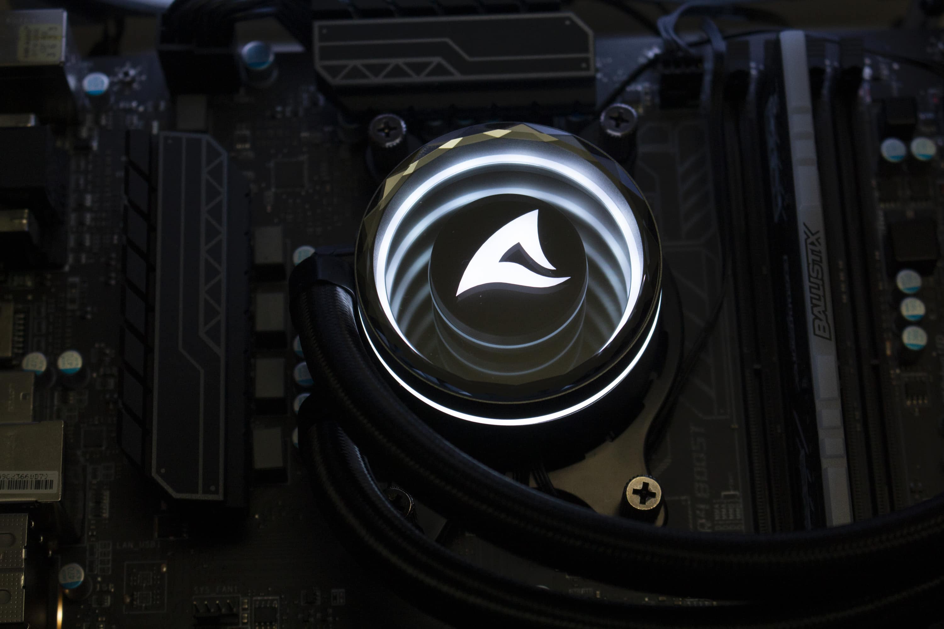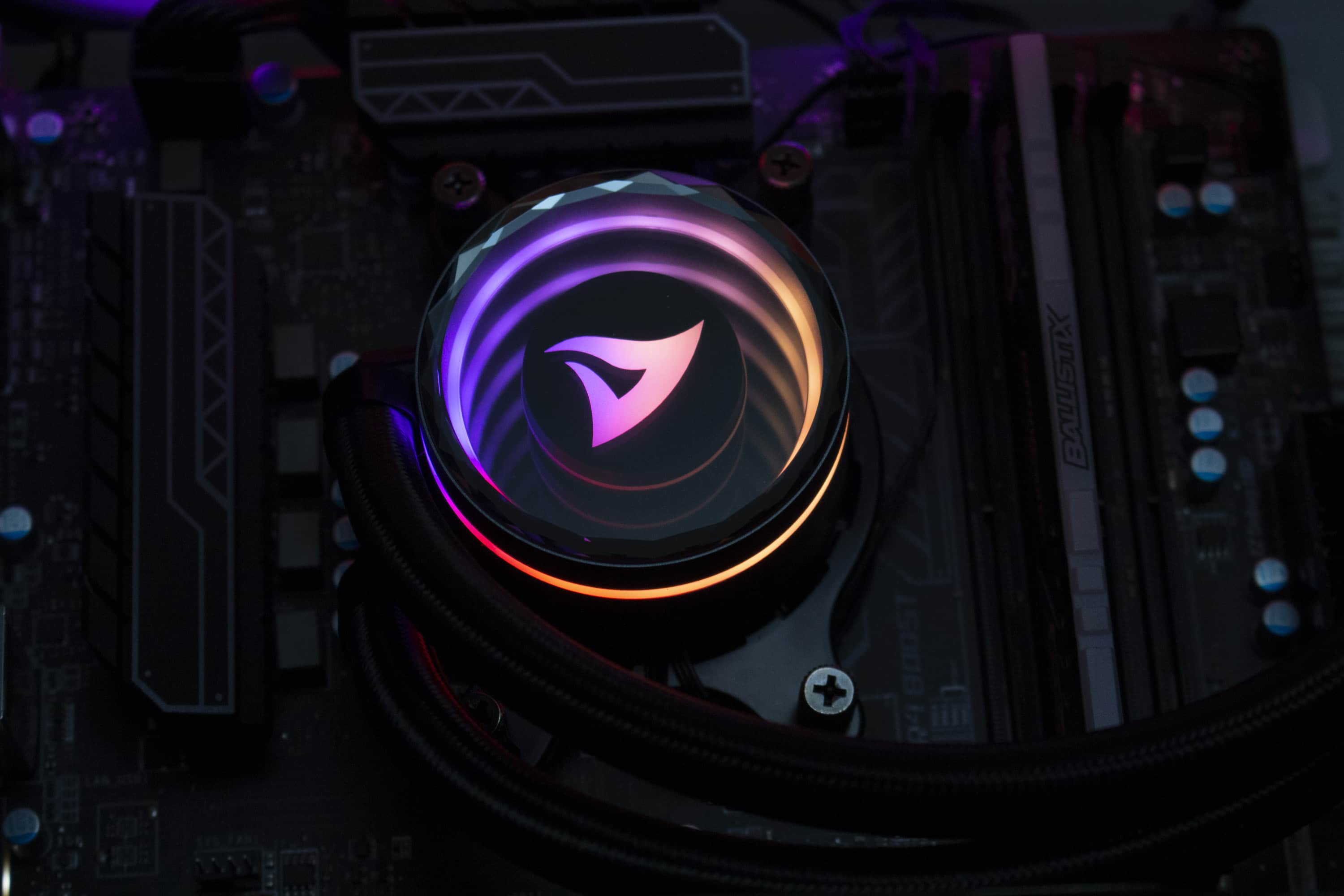 Die Sharkoon S80 RGB verfügt über diverse ARGB-Elemente, die über das Mainboard angesteuert werden können. Dazu gehören sowohl die Lüfter, deren Lüfternabe über entsprechende LEDs verfügt, als auch der Pumpenblock, an dem sich unterhalb der Spiegelplatte weitere LEDs befinden. Die Ansteuerung erfolgt über den 3-Pin-5V-ARGB-Stecker am Pumpenblock. Die Anschlüsse der Lüfter werden über ein mitgeliefertes Kabel direkt mit dem Pumpenblock verbunden. Dadurch benötigt das Mainboard nur einen einzigen ARGB-Anschluss für die Ansteuerung der Beleuchtung. Abschließend noch ein paar Impressionen der aktivierten Beleuchtung.
