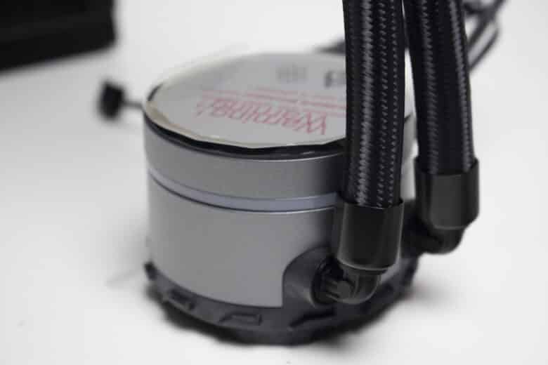 Auch bei der S90 RGB setzt Sharkoon auf schwarze sowie textilumantelte Wasserschläuche mit einer Länge von 400 Millimetern. Das ist in der Regel ausreichend um den Radiator problemlos überall in einem Midi-Tower platzieren zu können. Ebenfalls hilfreich ist dabei der Pumpenblock, der über flexible Schlauchgelenke mit weitem Schwenkbereich verfügt. Sowohl am Radiator als auch auf Seiten der Pumpe wurden die schwarzen Schläuche jedoch in Metallmuffen gepresst. Dadurch wird die Lösung zu einem geschlossenen System, bei dem der Kühlkreislauf nicht erweitert werden kann.