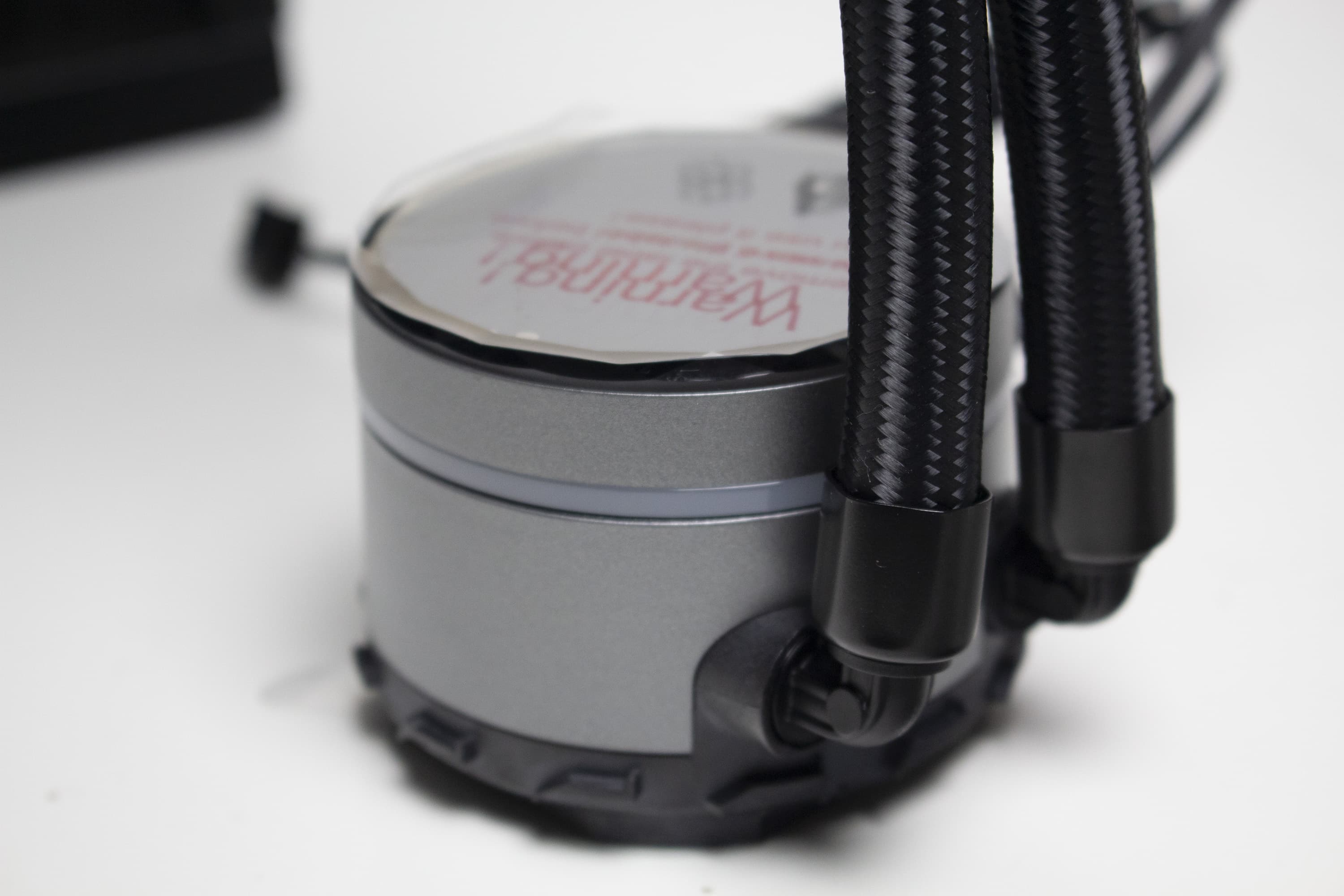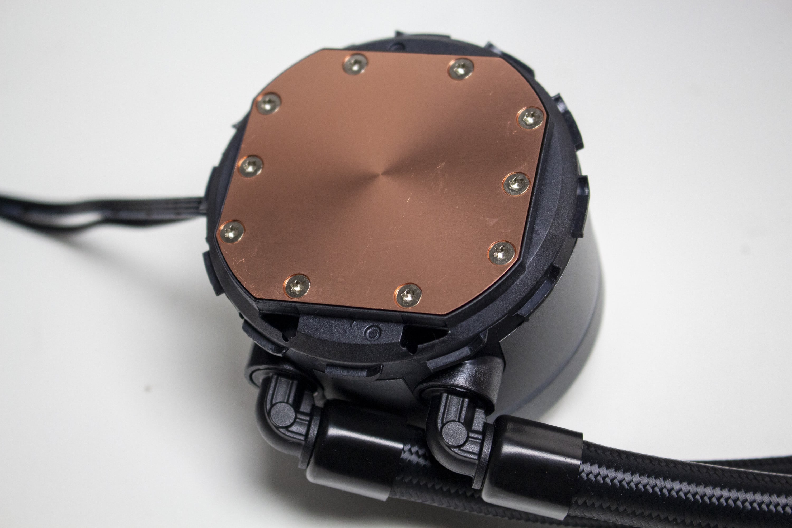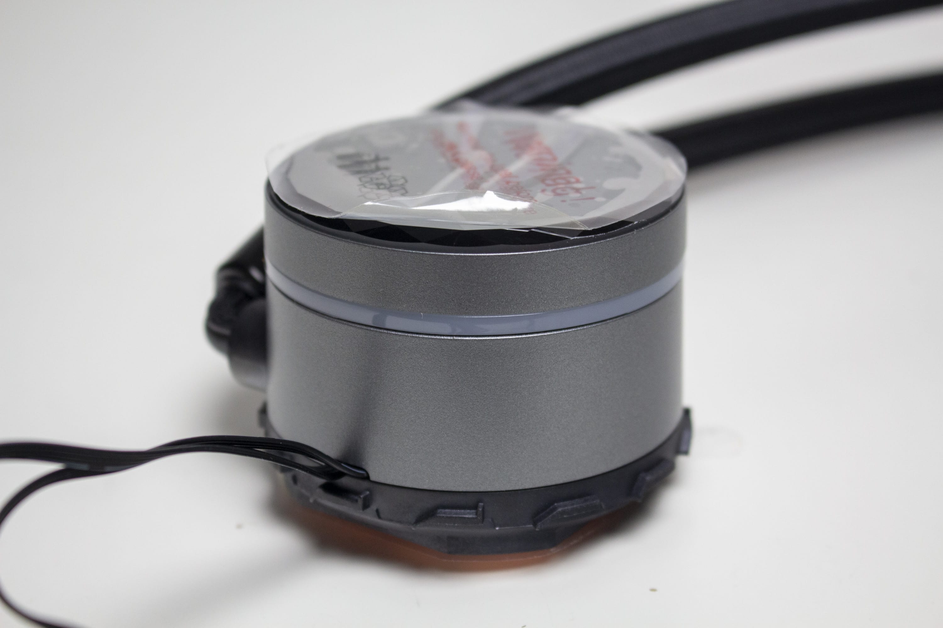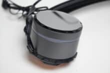 Das Pumpengehäuse der Sharkoon S90 RGB besteht aus Kunststoff, welcher aber zur Verbesserung der Optik und Haptik von einem gräulichen Aluminium umhüllt wurde. Die Übertragung der Wärme vom Heatspreader der CPU an den Kühlkreislauf erfolgt über eine Basisplatte aus Kupfer. Die im Block eingebaute Pumpe dreht zwischen 1600 und 3200 Umdrehungen pro Minute und wird über einen 4-Pin-PWM-Stecker mit dem Mainboard verbunden.