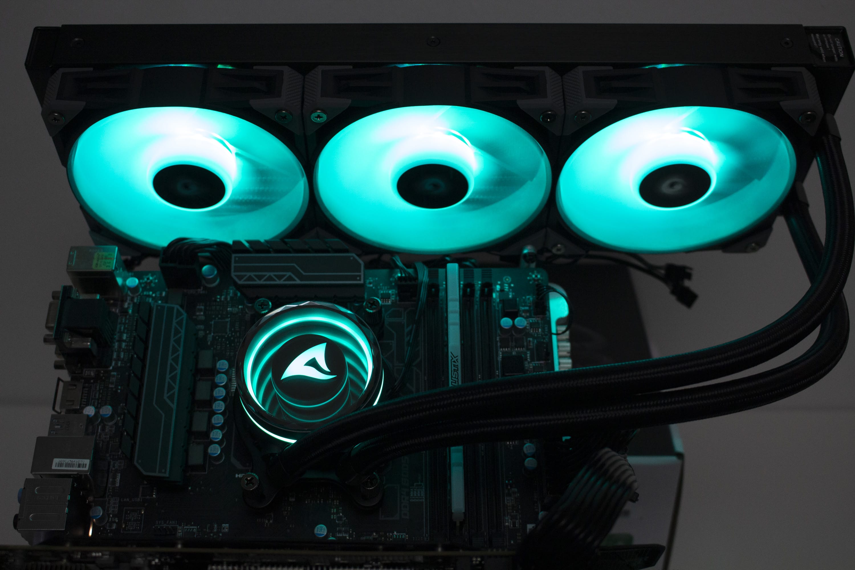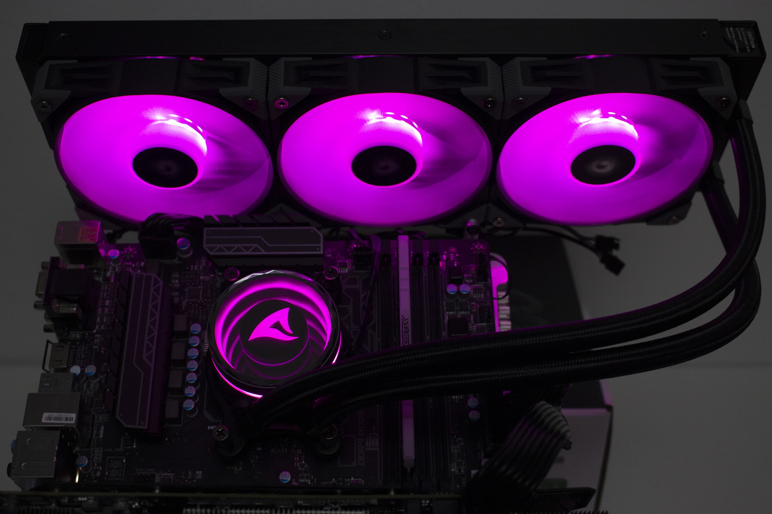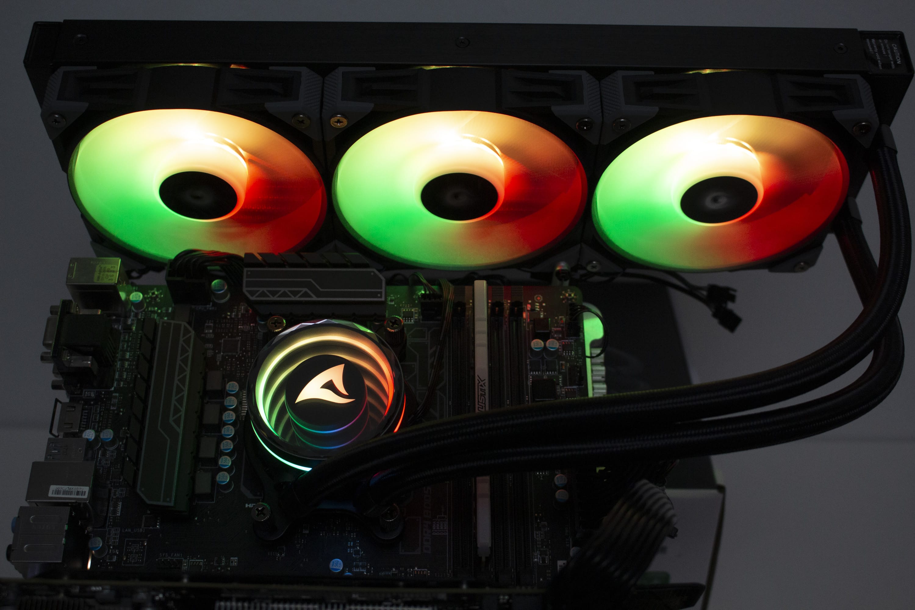 Die Sharkoon S90 RGB verfügt über diverse ARGB-Elemente, die über das Mainboard angesteuert werden können. Dazu gehören sowohl die Lüfter, deren Lüfternabe über entsprechende LEDs verfügt, als auch der Pumpenblock, an dem sich unterhalb der Spiegelplatte weitere LEDs befinden. Die Ansteuerung erfolgt über den 3-Pin-5V-ARGB-Stecker am Pumpenblock. Die Anschlüsse der Lüfter werden über ein mitgeliefertes Kabel direkt mit dem Pumpenblock verbunden. Dadurch benötigt das Mainboard nur einen einzigen ARGB-Anschluss für die Ansteuerung der Beleuchtung. Abschließend noch ein paar Impressionen der aktivierten Beleuchtung.
