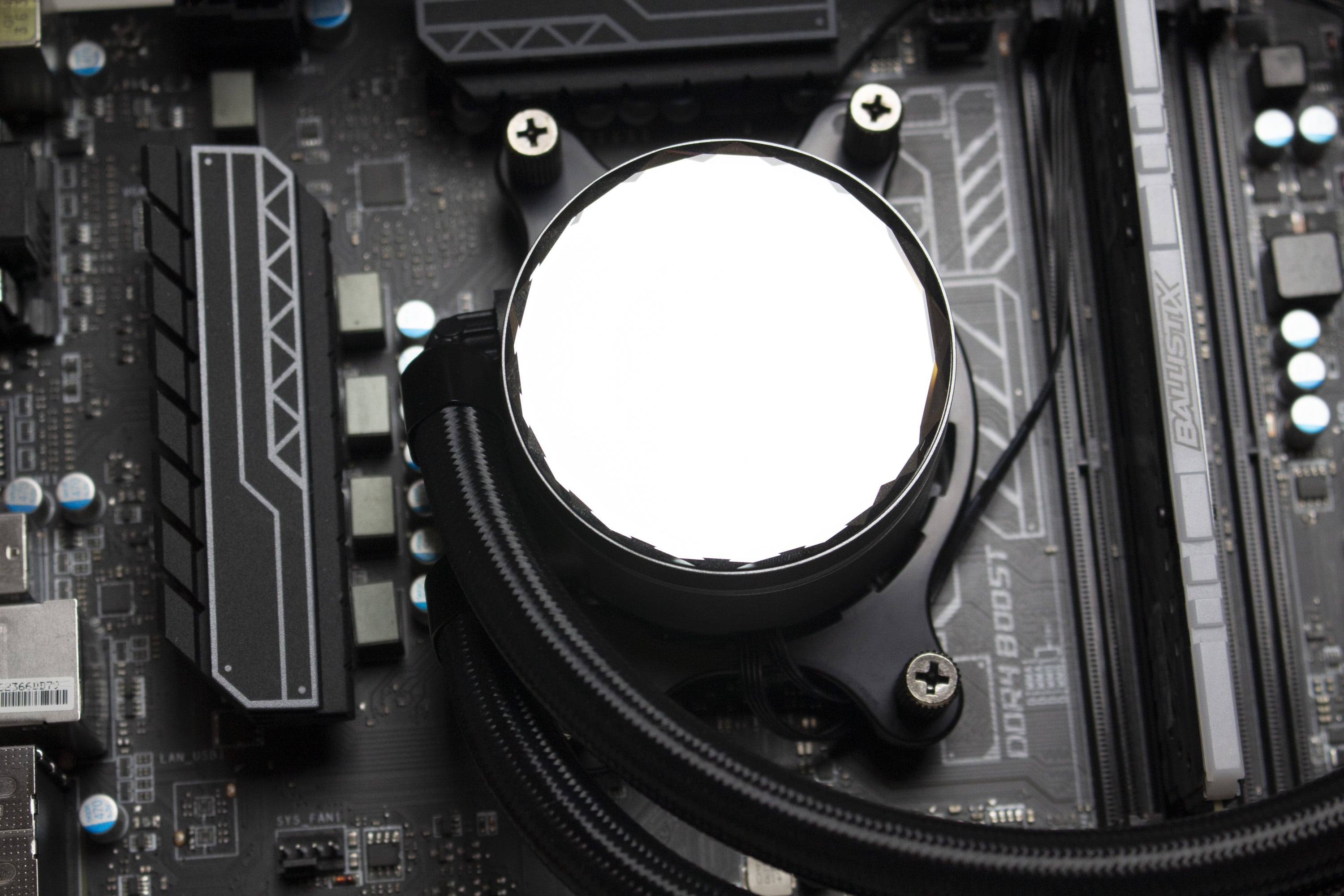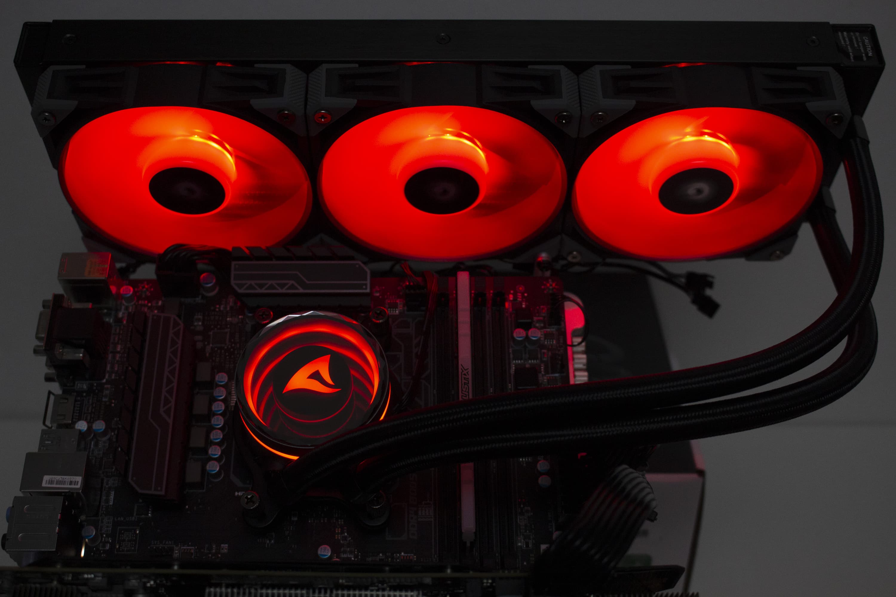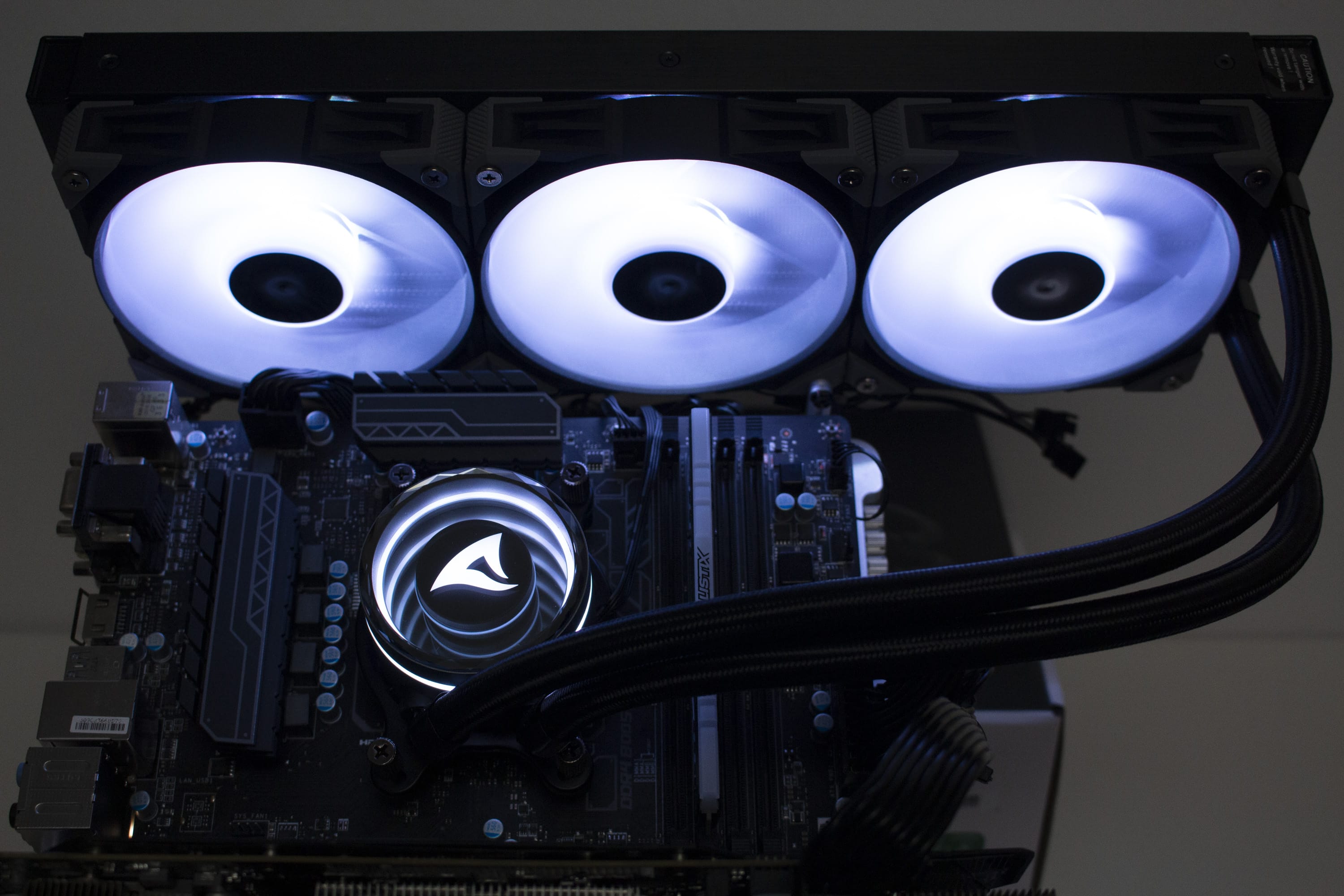 Die Sharkoon S90 RGB verfügt über diverse ARGB-Elemente, die über das Mainboard angesteuert werden können. Dazu gehören sowohl die Lüfter, deren Lüfternabe über entsprechende LEDs verfügt, als auch der Pumpenblock, an dem sich unterhalb der Spiegelplatte weitere LEDs befinden. Die Ansteuerung erfolgt über den 3-Pin-5V-ARGB-Stecker am Pumpenblock. Die Anschlüsse der Lüfter werden über ein mitgeliefertes Kabel direkt mit dem Pumpenblock verbunden. Dadurch benötigt das Mainboard nur einen einzigen ARGB-Anschluss für die Ansteuerung der Beleuchtung. Abschließend noch ein paar Impressionen der aktivierten Beleuchtung.