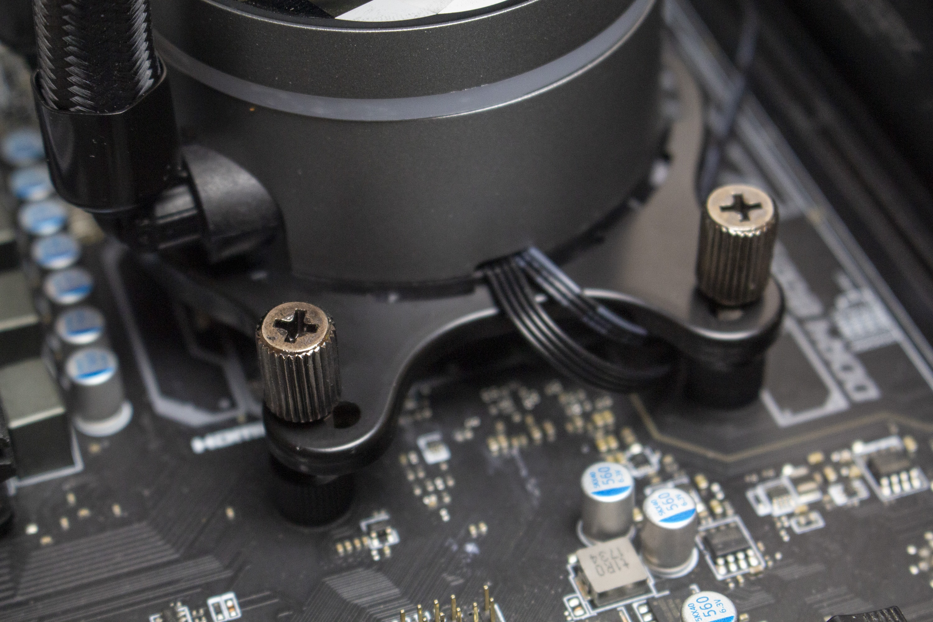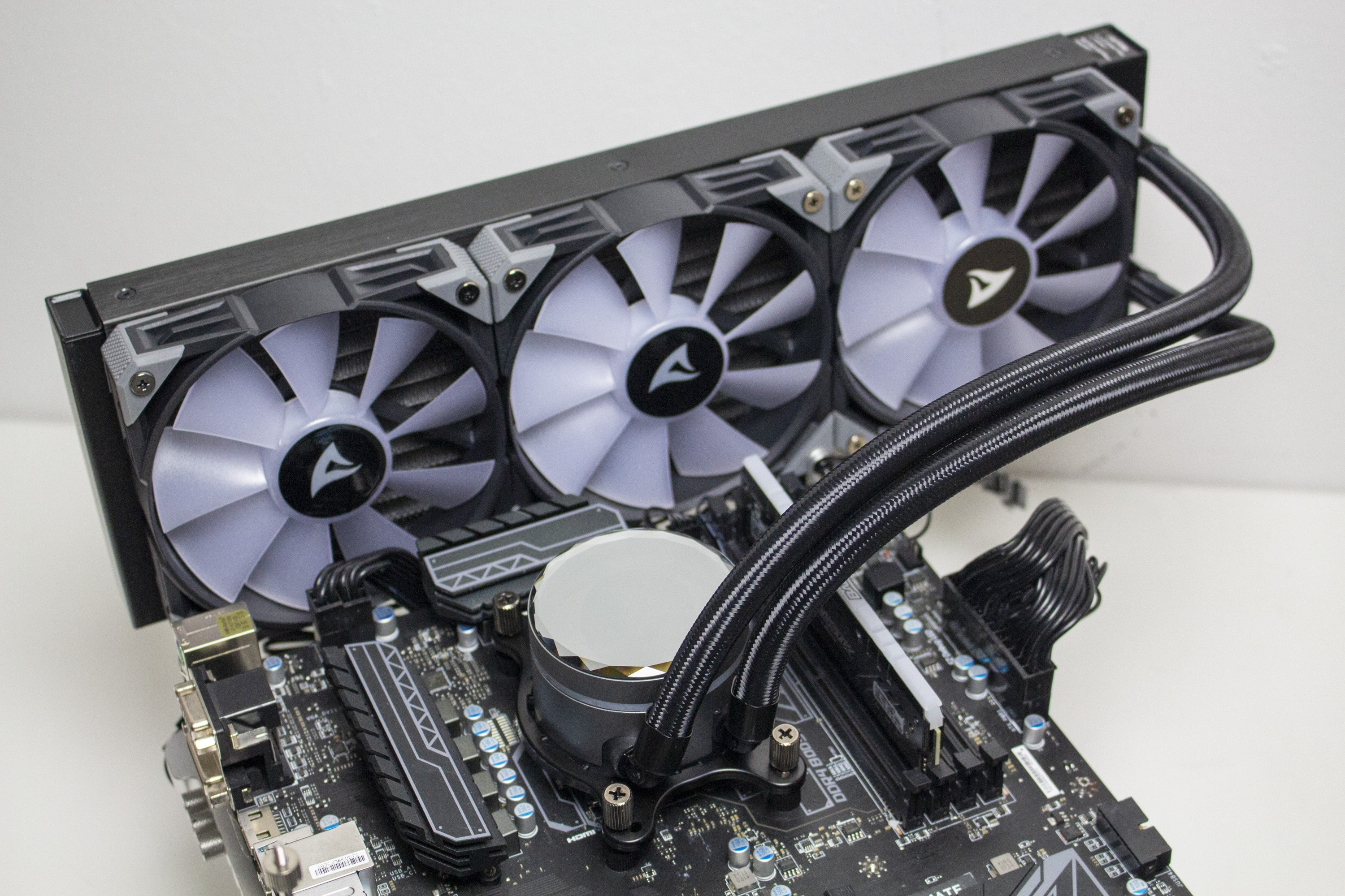Ähnlich wie bei der Sharkoon S80 RGB wären auch bei der S90 RGB die proprietären RGB-Anschlüsse der Lüfter sowie die Lautstärke in höheren Drehzahlbereich als Kritikpunkte zu nennen. Gleichermaßen gilt hier aber wieder die Aussage aus dem Review der S80 RGB. Aufgrund hoher Lüfterdrehzahlen ist die Lautstärke bei vielen AiO-Wasserkühlungen ein Problem und lässt sich meistens durch individuelle Lüfterkurven im BIOS ganz gut regeln. Die proprietären RGB-Anschlüsse der Lüfter werden über das mitgelieferte Kabel einfach adaptiert und mit der Y-Weiche der Pumpe verbunden.