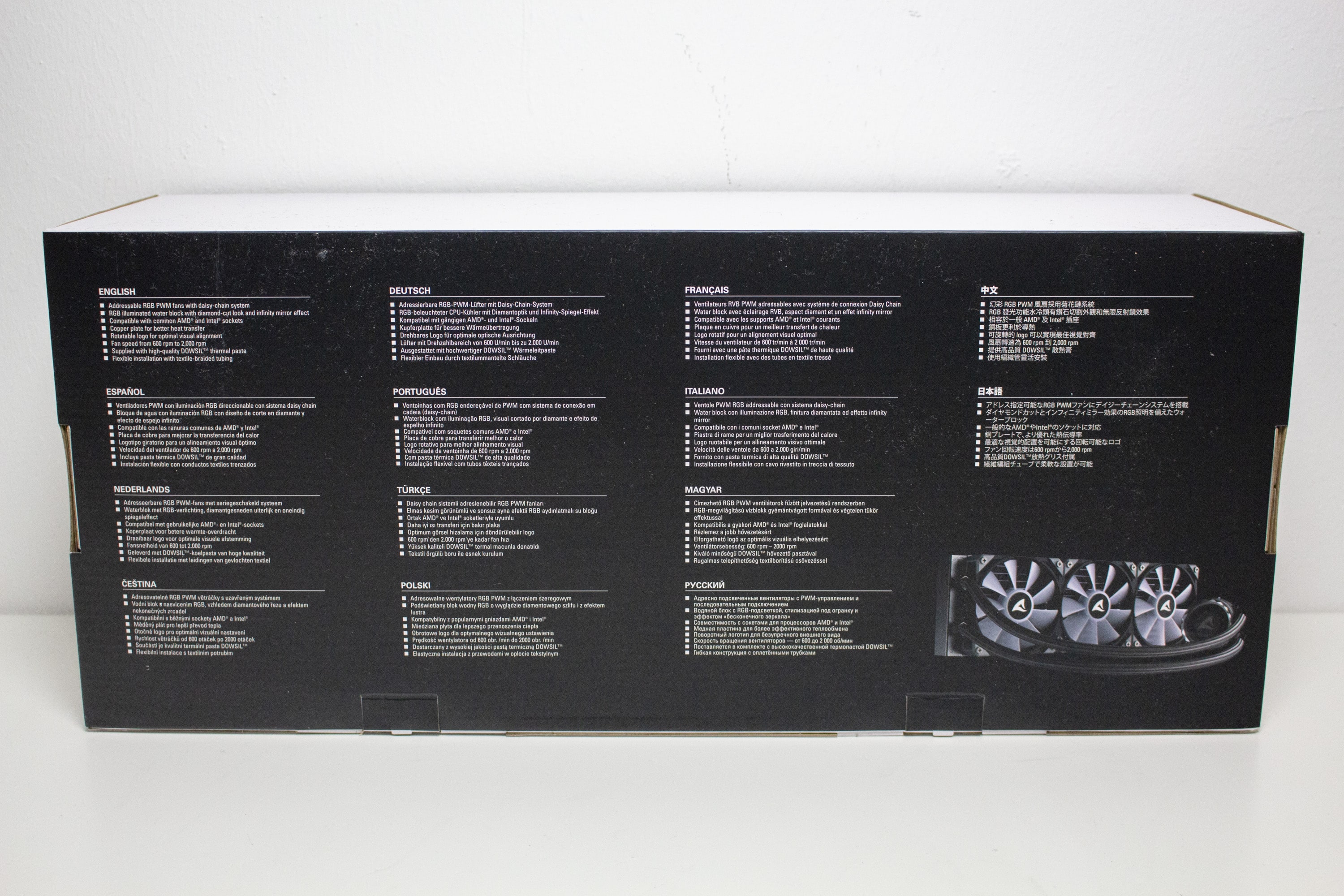 Die Verpackung der Sharkoon S90 RGB besteht aus farbig bedruckter Pappe und wird von den Hauptfarben Schwarz und Weiß dominiert. Weiterhin wurden einige farbige Produktbilder auf die Verpackung gedruckt. Zuletzt findet man noch Angaben zum Typ des CPU-Kühlers und Informationen zu den wichtigsten Features, alle technische Daten sowie eine Auflistung des Verpackungsinhalts. Die Textelemente wurden überwiegend in englischer Sprache verfasst. Die Auflistung der Hauptfeatures wurde aber in mehreren Sprache abgedruckt.