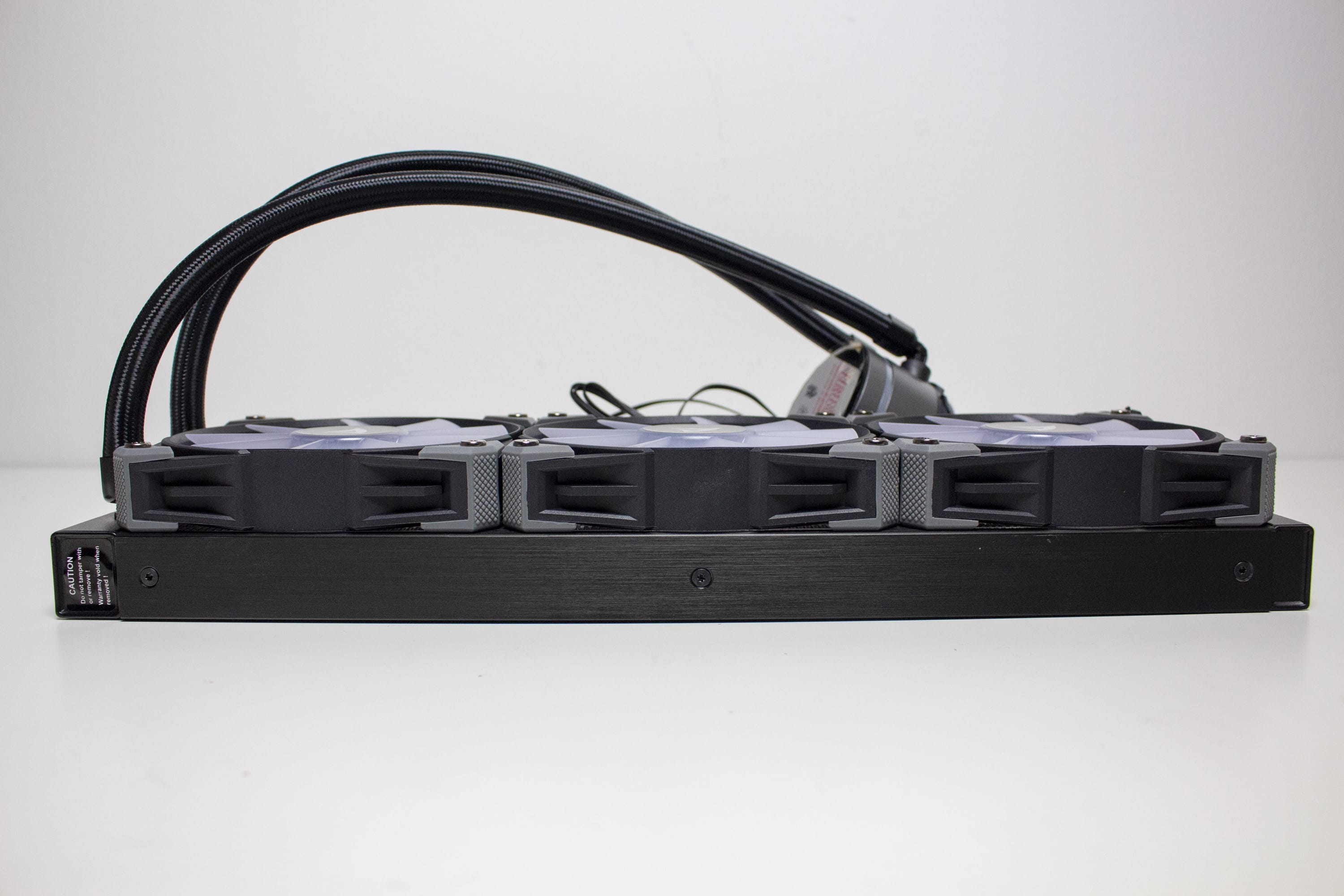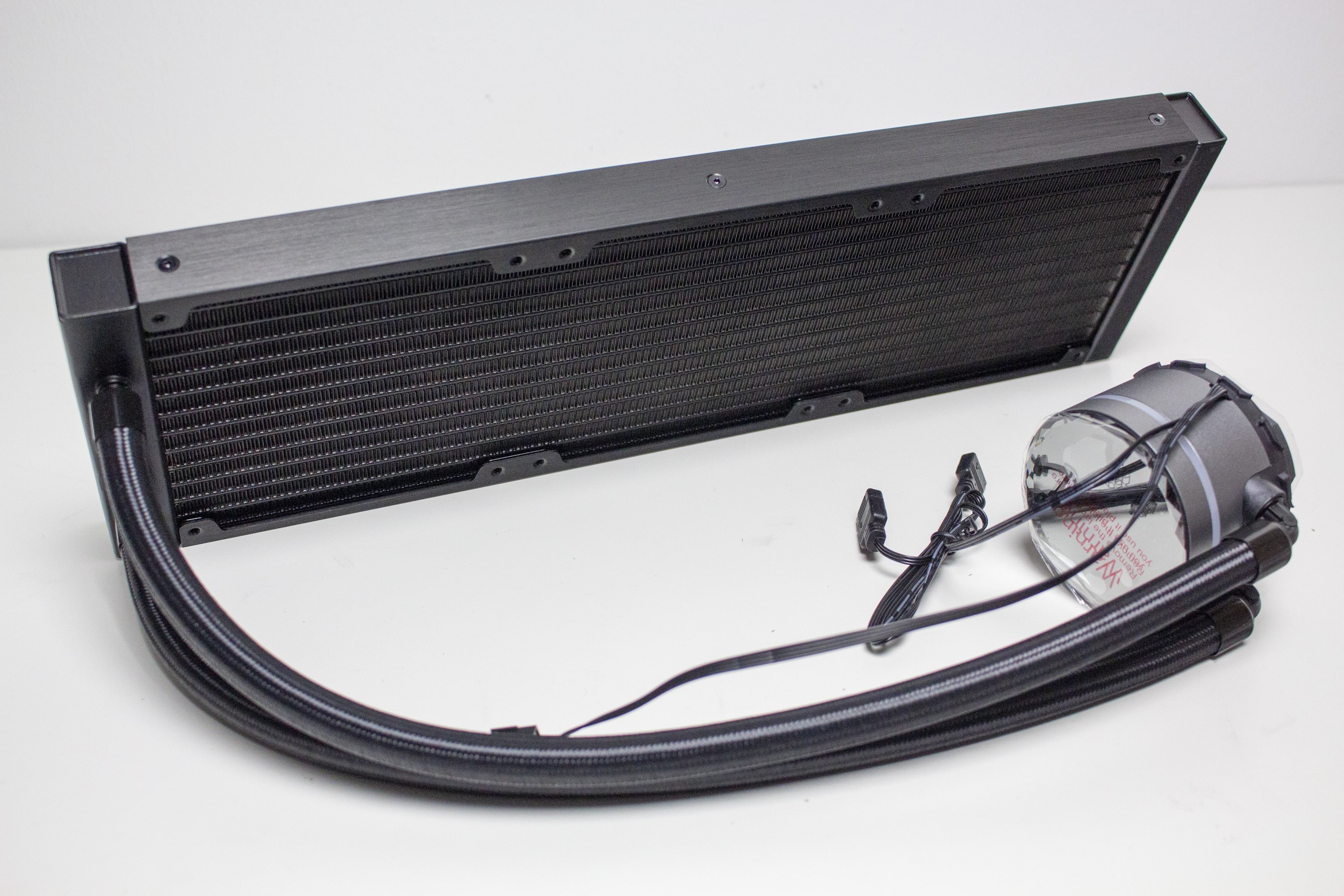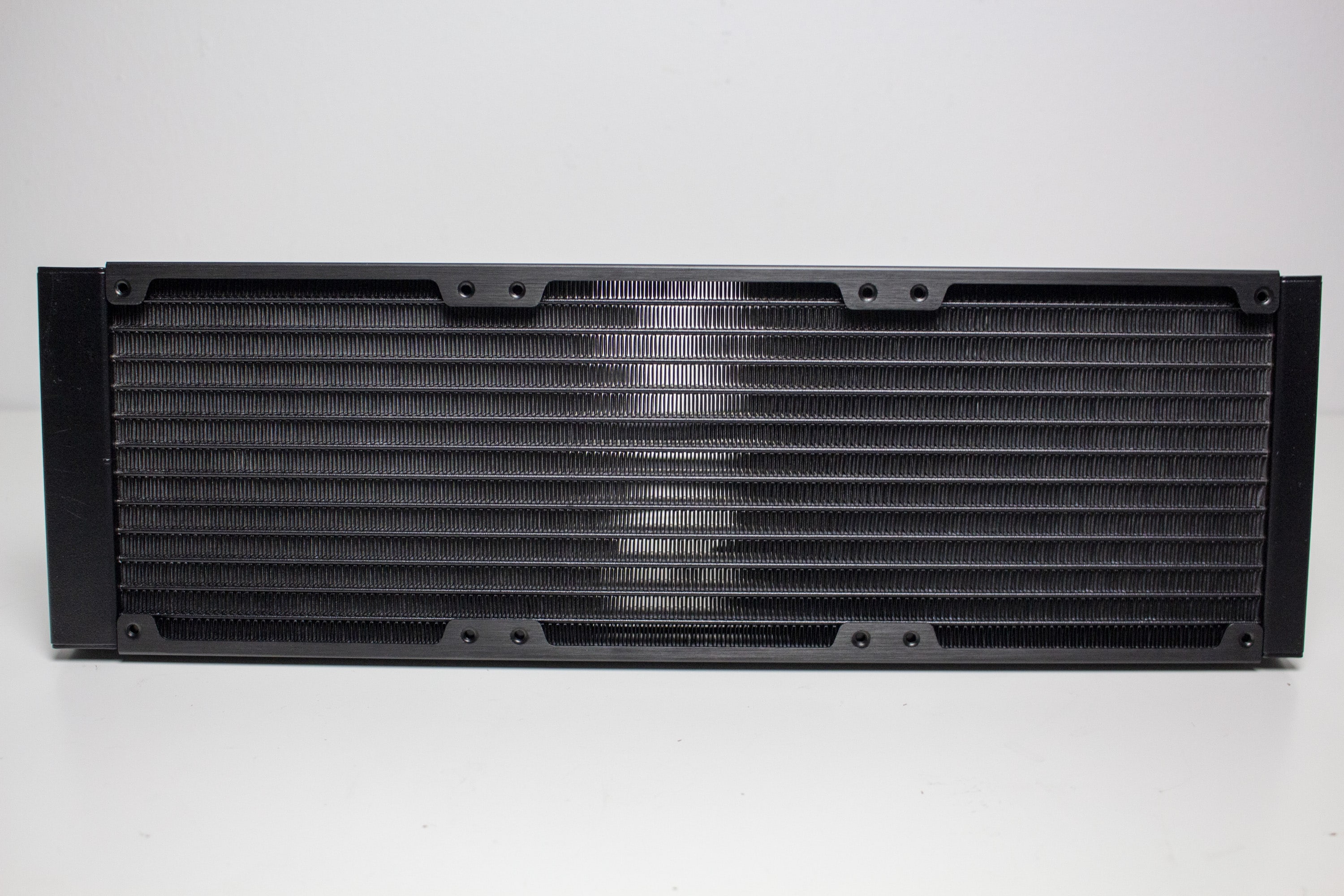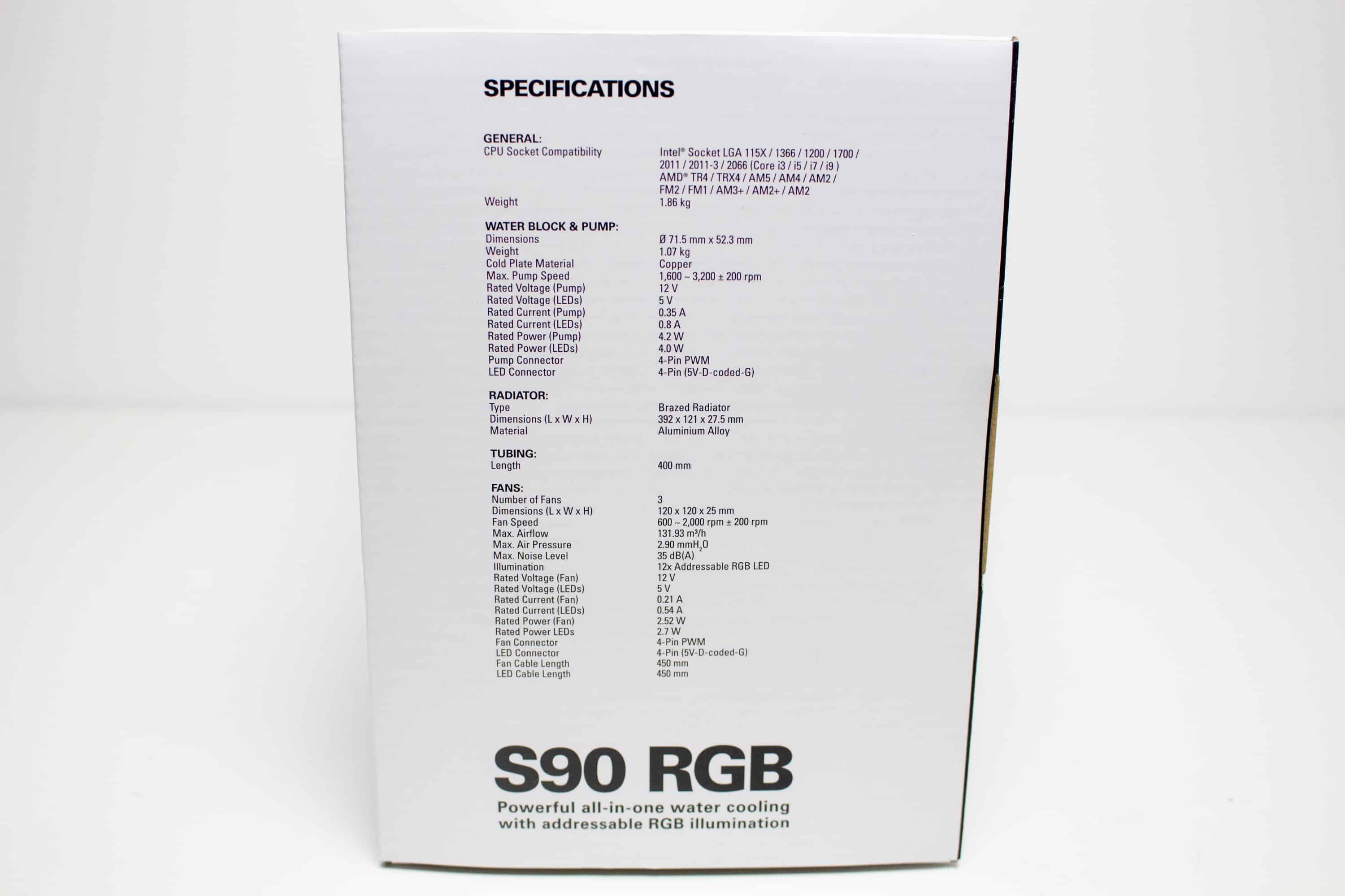 Optisch ist der Radiator der S90 RGB genauso gestaltet wie der Wärmetauscher der S80 RGB, nur dass er länger ist. Er besteht aus verlöteten Aluminiumlamellen, die, zur Verbesserung der Optik, schwarz lackiert wurden. Auf Schriftzüge des Herstellers oder Beleuchtungselemente wurde verzichtet. Um die Optik des Radiators aber weiter aufzuwerten, wurden die zwei Enden des Radiators schwarz pulverbeschichtet und die länglichen Seiten mit einer Abdeckplatte aus gebürstetem Aluminium verkleidet. Mit einer Höhe von 27,5 Millimetern liegt der Radiator im Durchschnitt vieler handelsüblicher Kompaktwasserkühlungen.