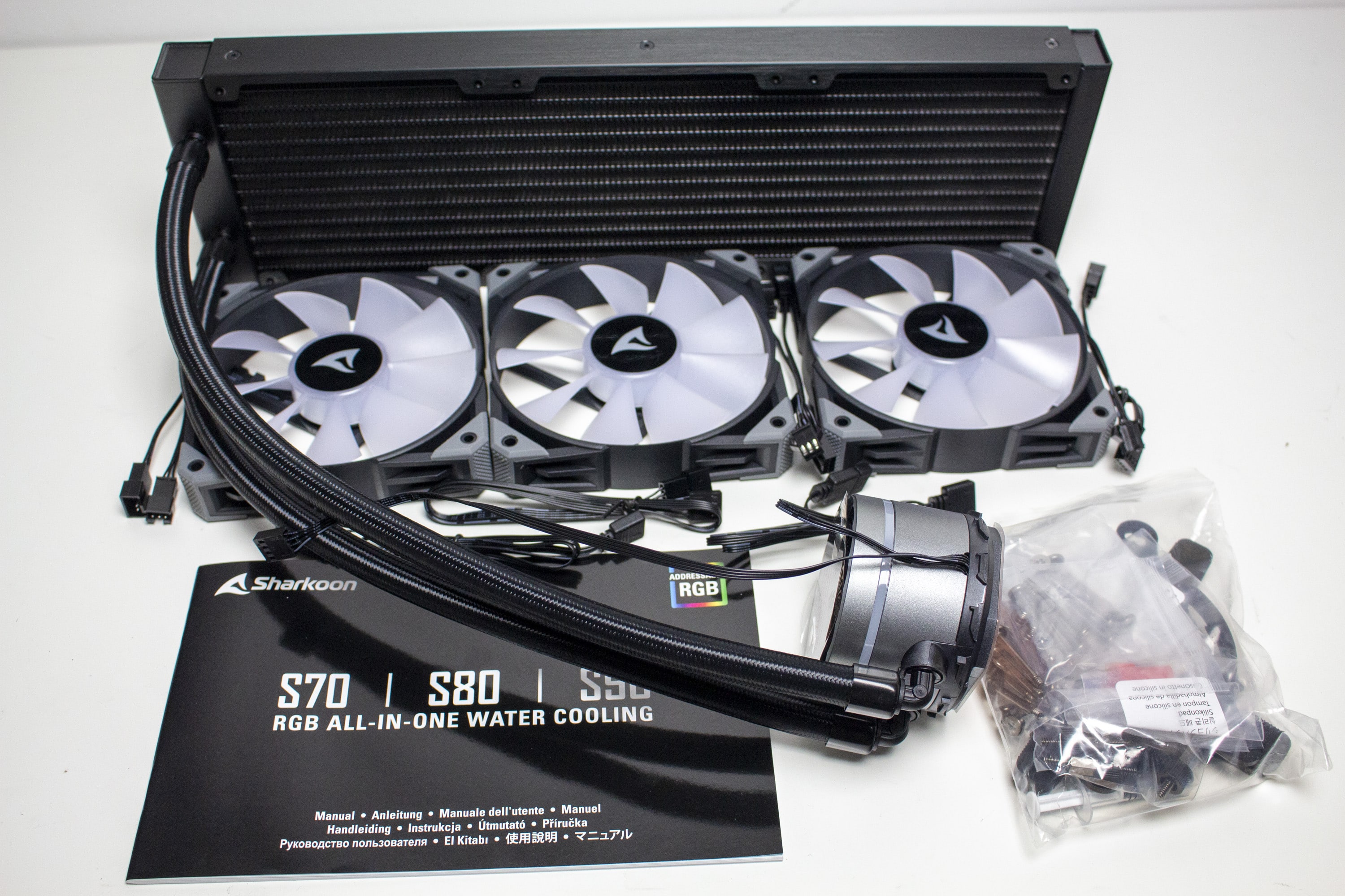 Innerhalb der Kartonage platziert Sharkoon alle Komponenten in einer Form aus recycelter Pappe und hüllt Radiator, Schläuche, den Pumpenblock, die Lüfter und sonstiges Montagematerial für einen zusätzlichen Schutz in eine Folie aus Kunststoff ein. Insgesamt gehören zum Lieferumfang der Radiator mit Pumpe, drei 120-mm-Lüfter mit RGB-Beleuchtung, eine Backplate bzw. Montagebügel aus Metall, notwendiges Montagematerial (Schrauben, Abstandshalter etc.), eine kleine Tube Wärmeleitpaste, Anschlusskabel sowie eine ausführliche Montageanleitung.