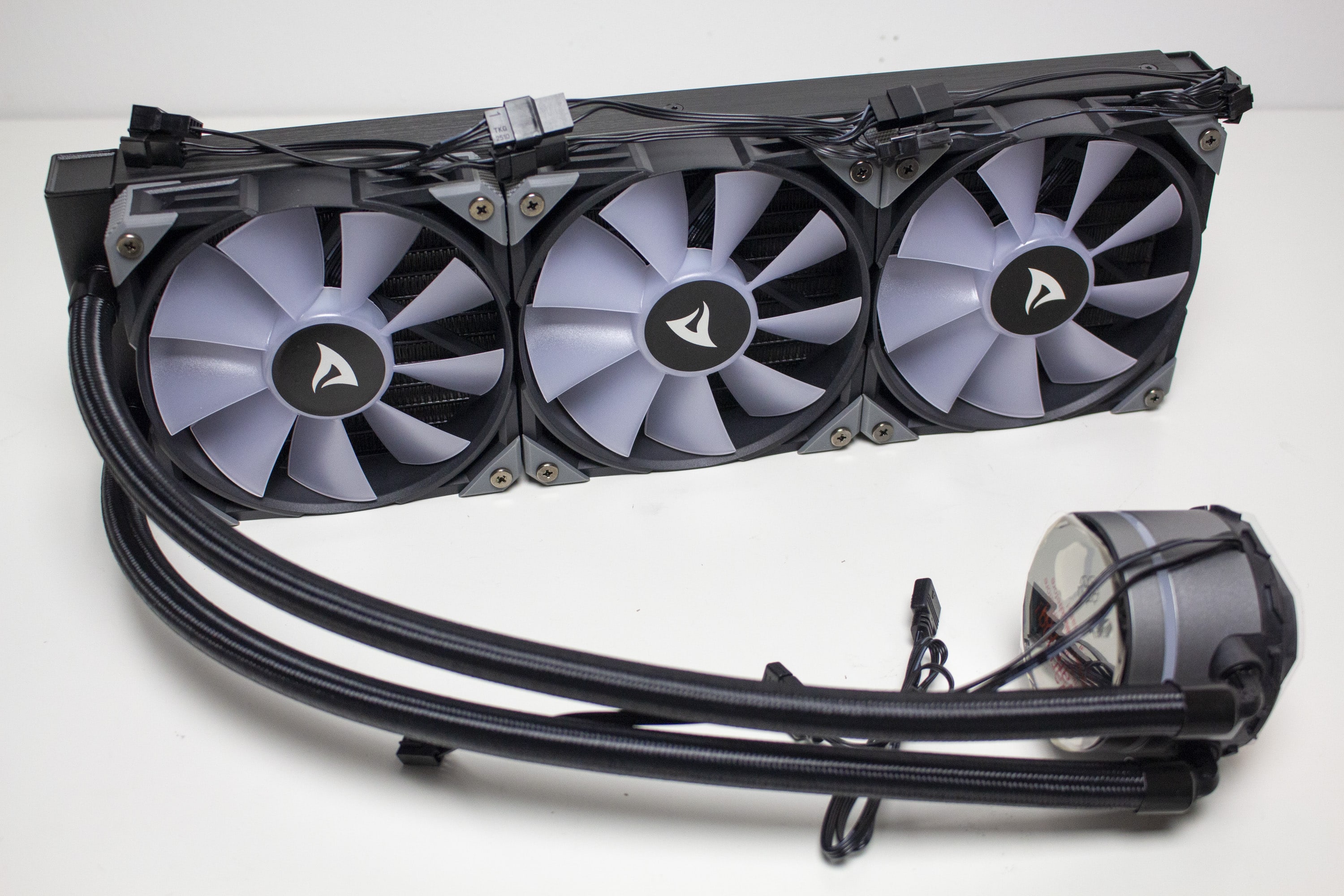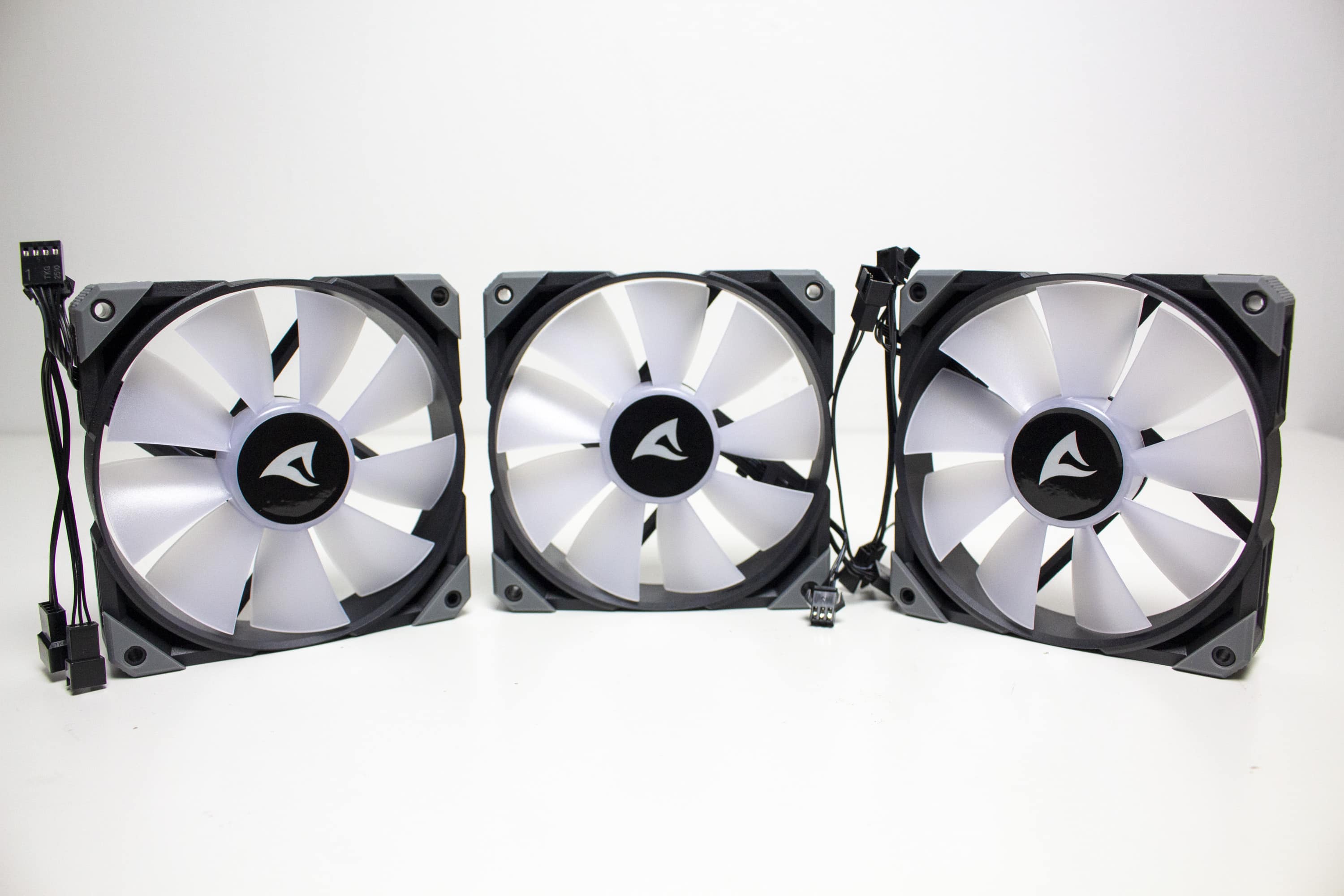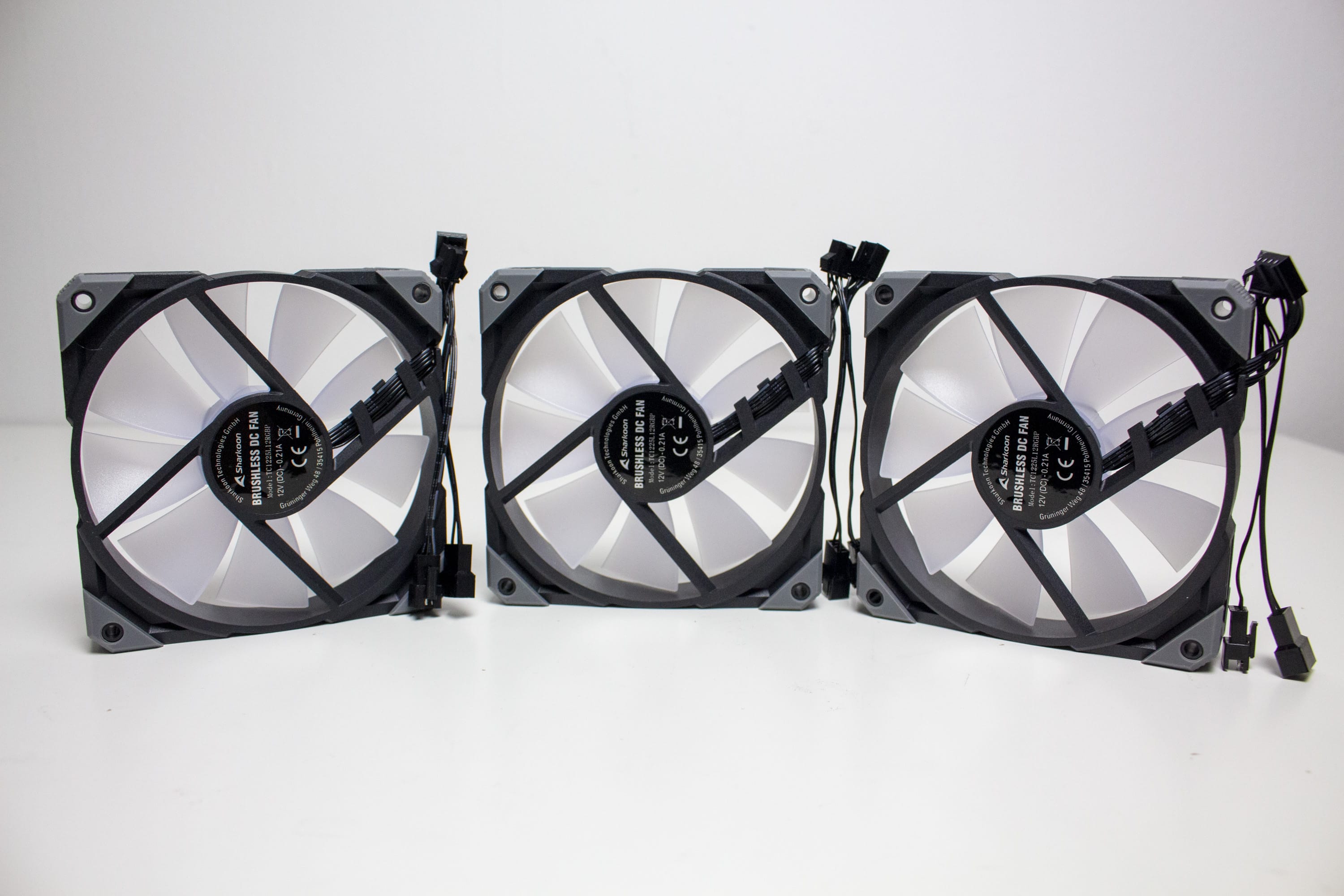 Die mitgelieferten Lüfter vom Typ „Sharkoon Brushless DC Fan“ bestehen aus einem schwarzem Lüfterrahmen und aus einem milchigen Rotor mit jeweils neun Lüfterblättern. Der Anschluss erfolgt über einen 4-Pin-PWM-Stecker inklusive Y-Weiche direkt am Mainboard und macht die Lüfter zwischen 600 und 2000 Umdrehungen pro Minute regelbar. Weiterhin besitzen die Lüfter an den Ecken kleine graue Gummipuffer, die eine Übertragung von Schwingungen an den Radiator oder das Gehäuse verhindern sollen.