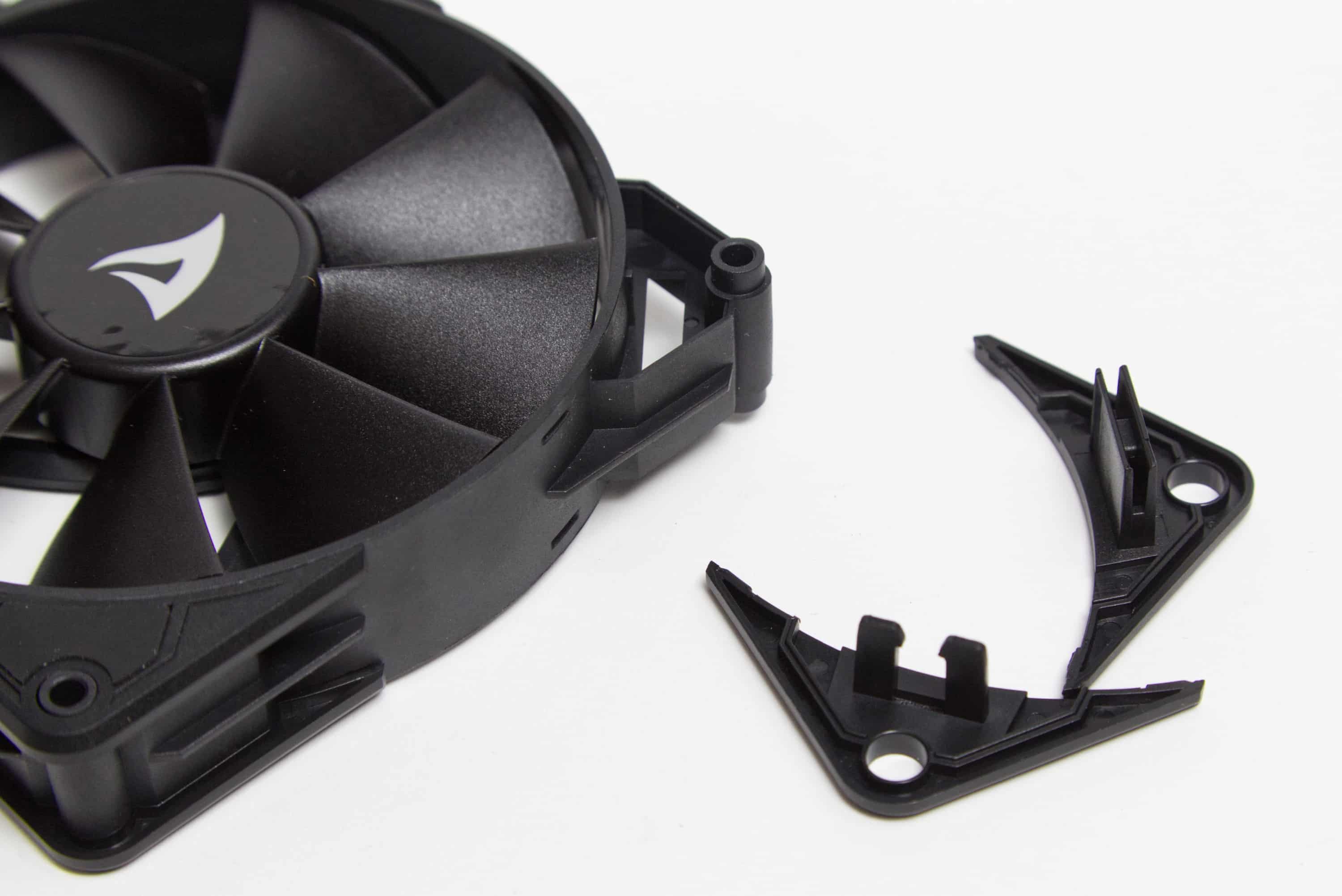 Die Besonderheit der Sharkoon SilentStorm-Lüfter ist der Wechsel der Lüfterecken. Und es ist nicht so, dass man das sofort erkennen würde – die Ecken sitzen schon sehr fest und ordentlich. Wären keine anders gefärbten Ecken im Lieferumfang, wäre ich nicht auf die Idee gekommen, dass man sie hätte wechseln können.