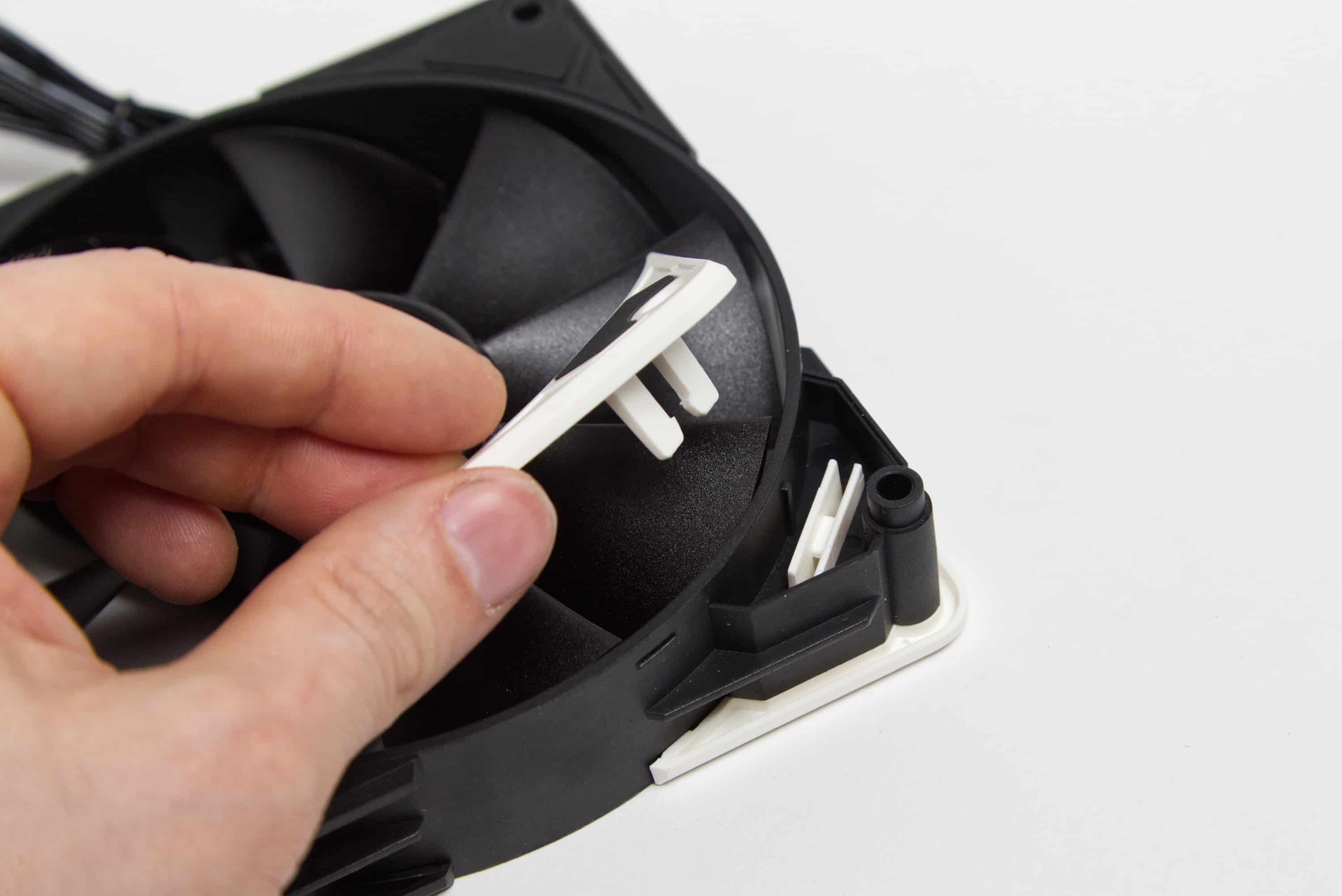Der Wechsel erfordert eine gewisse Menge an Kraft, sodass ich zunächst Angst hatte, etwas zu zerbrechen, aber auch bei mehrfachen Wechseln im Laufe des Testzeitraums gab es letztendlich keine Probleme. Wer die Ecken eines Sharkoon SilentStorm BW120 nimmt, kann diese auch an den RGB-Lüftern anbringen und umgekehrt. Aber mitgeliefert wird immer nur ein Farbset an Wechselecken pro Lüfterversion. Ich muss zugeben, dass mich hier die Entscheidung wundert, graue Ecken bei den RGB-Lüftern mitzuliefern. Schwarze Rahmen sind bei den SilentStorm 120 RGB ab Werk also nicht geplant, obwohl sie einfacher mit den meisten Farbkonzepten zu vereinen wären.
