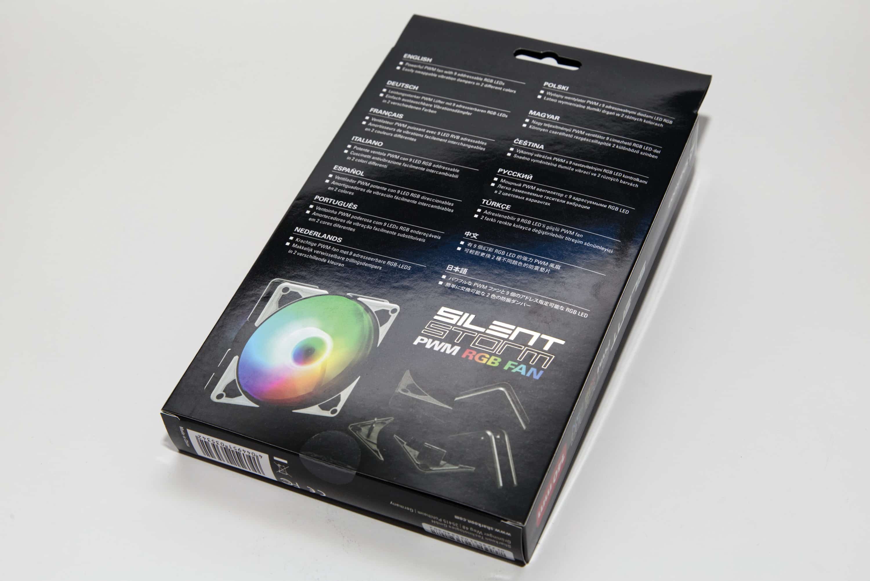 Die glänzende Verpackung der Sharkoon SilentStorm 140 RGB ist nicht zu groß, aber ein wenig länger als üblich. Warum das so ist, zeigt das Öffnen: Abgesehen vom Lüfter und den typischen Lüfterschrauben findet sich eine weitere schwarze Schachtel im Lieferumfang. Diese enthält andersfarbige Ecken für die Lüfter. So kann man nachträglich das Erscheinungsbild der Sharkoon SilentStorm 140 RGB verändern. Doch dazu kommen wir zu einem späteren Zeitpunkt.