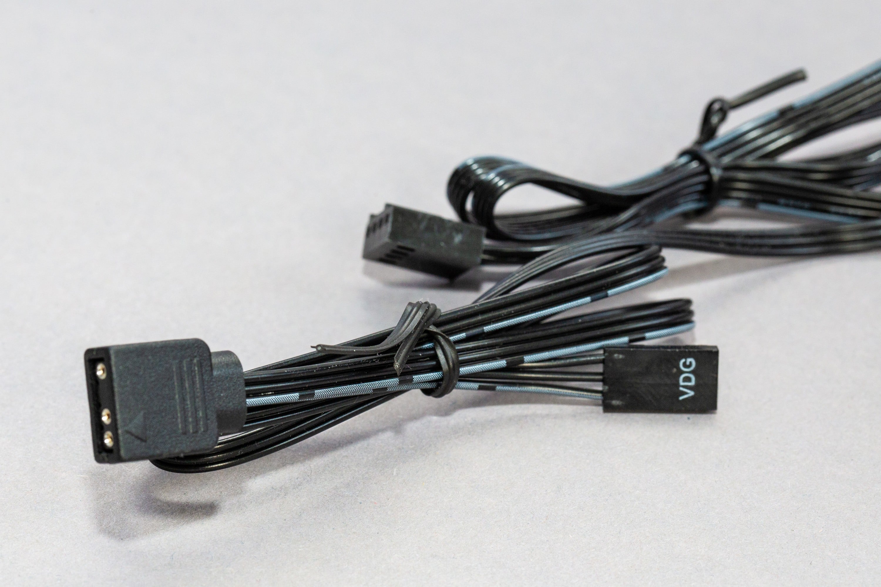 Die RGB-Anschlüsse an den Sharkoon SilentStorm 140 RGB-Lüftern sind in zwei Ausführungen am Kabel zu finden. Einmal ein regulärer Standard-ARGB-Anschluss und außerdem ein VDG-Anschluss, wie er heutzutage kaum noch zu finden ist.