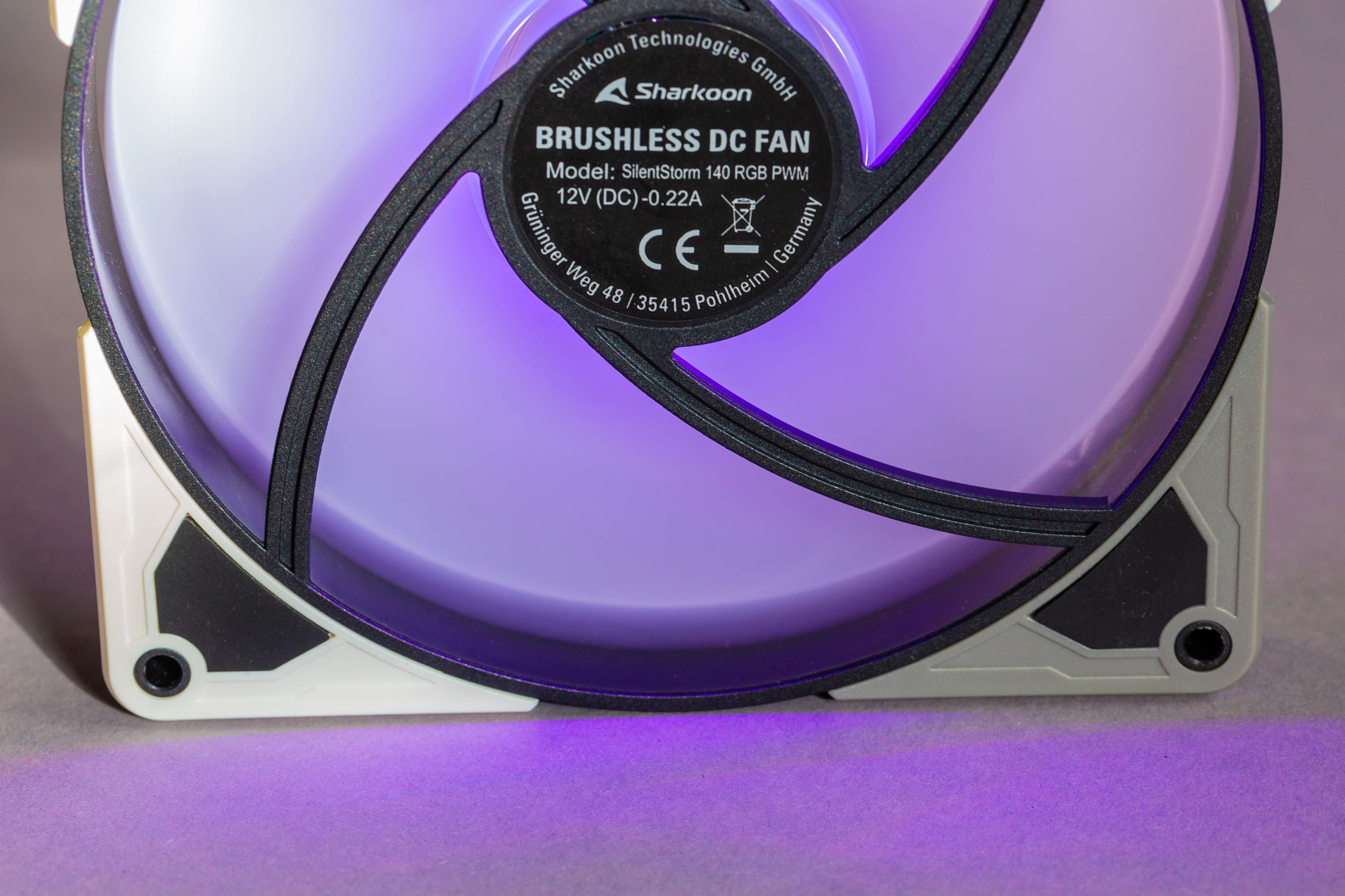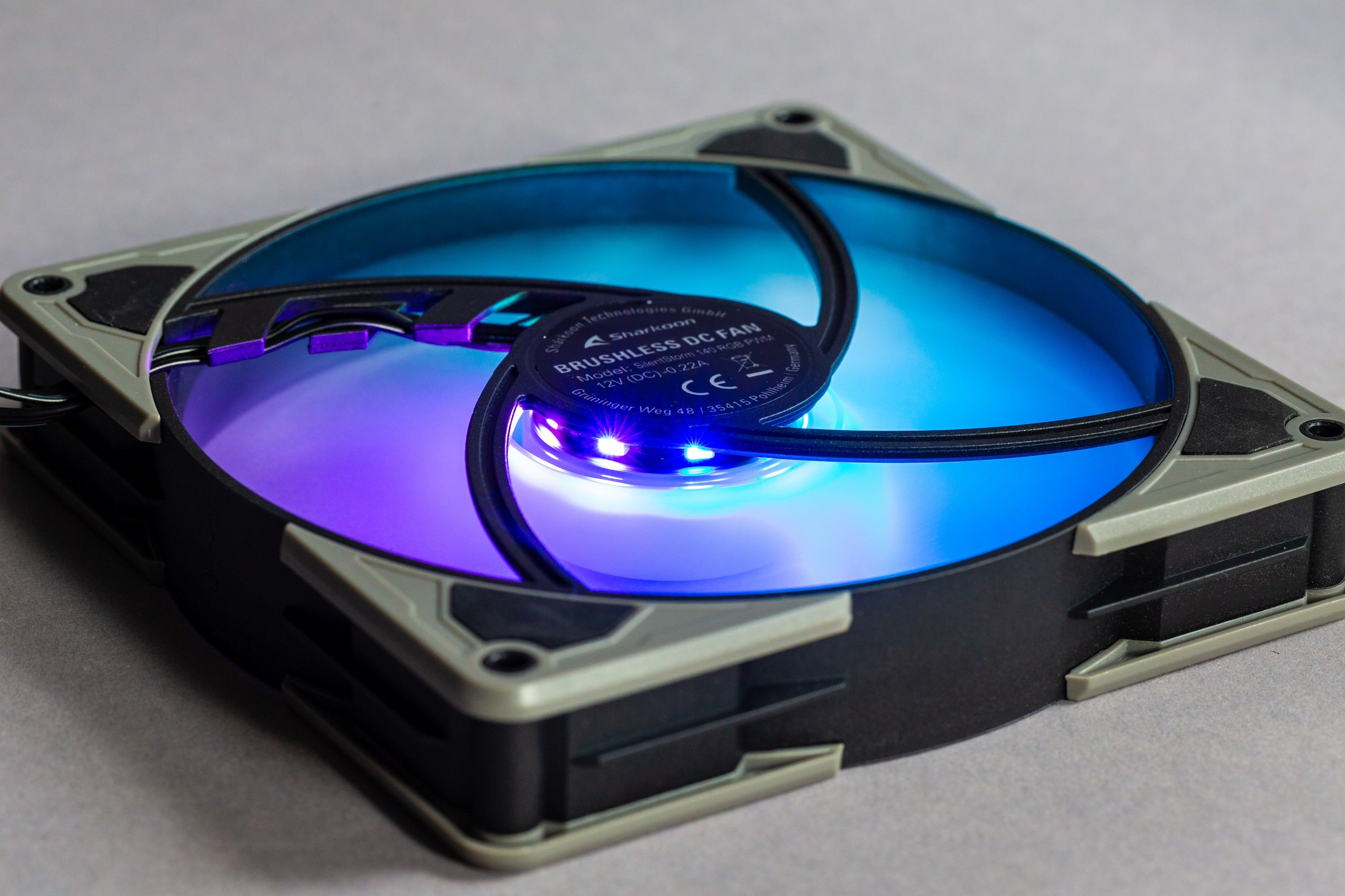 Die RGB-Beleuchtung der Sharkoon SilentStorm 140 RGB ist durchaus farblich schön, wobei sie unter der typischen Schwäche an den Spitzen der Lüfterblätter leiden, die viele 140-mm-Lüfter betreffen. Allerdings sieht man von hinten im Winkel recht direkt auf die einzelnen LEDs.