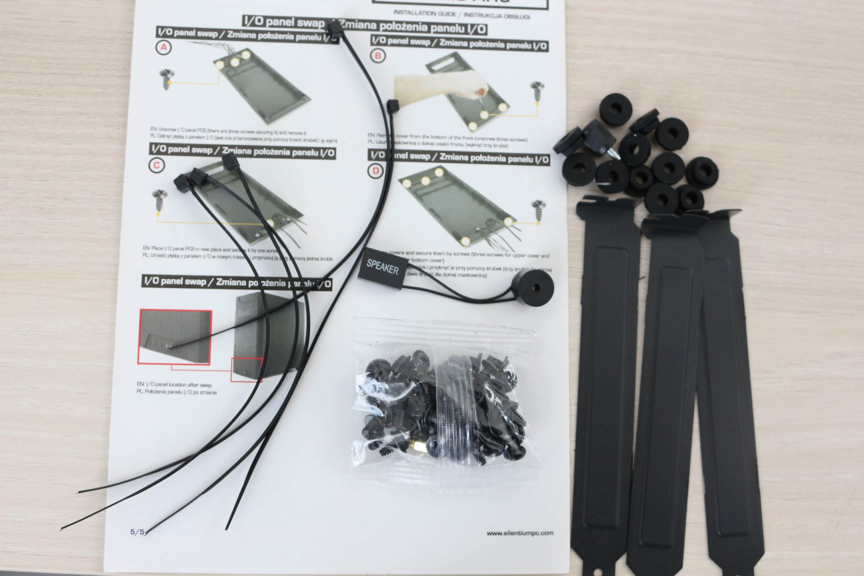 Das SilentiumPC Armis AR3 kommt gut und sicher verpackt in einem braunen Karton mit schwarzer Schrift und ist von Styropor umhüllt. Das mitgelieferte Zubehör wurde in einem durchsichtigen Beutel verstaut und innerhalb des Gehäuses mit einem Kabelbinder befestigt. Dieser Beutel beinhaltet alle wichtigen Schrauben, fünf schwarze Kabelbinder, einen Mainboard-Speaker, drei PCI-Ersatzblenden aus Stahl und eine kurze bebilderte Einbauanleitung in englischer Sprache. Außerdem gehören zum Lieferumfang zwei vorinstallierte 120-mm-Lüfter, eine 3-Stufen-Lüftersteuerung für bis zu zehn Lüfter und die ebenfalls vorinstallierten Abstandshalter für das Mainboard.