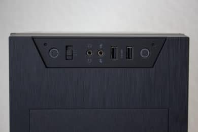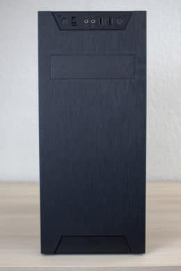 Wie das Armis AR5 gehört das AR3 definitiv zu den sehr schlichten und unauffälligeren Gehäusen. Die Frontpartie ist komplett geschlossen und aus Kunststoff gefertigt. Zudem wurde es mit einer Struktur versehen, die optisch ein wenig an gebürstetes Aluminium erinnert. Außerdem lässt sich eine 5,25″-Blende für ein externes DVD-Laufwerk oder eine Lüftersteuerung erkennen. Im oberen Bereich hat SilentiumPC das I/O-Panel angebracht. Dieses verfügt über zwei Anschlüsse für USB 3.0, jeweils einen Anschluss für Kopfhörer bzw. Mikrofon und drei Schalter für Power, Reset und I/O-Beleuchtung. Zuletzt wurde das I/O-Panel noch mit einem 3-Stufen-Regler für die Lüftersteuerung ausgestattet.