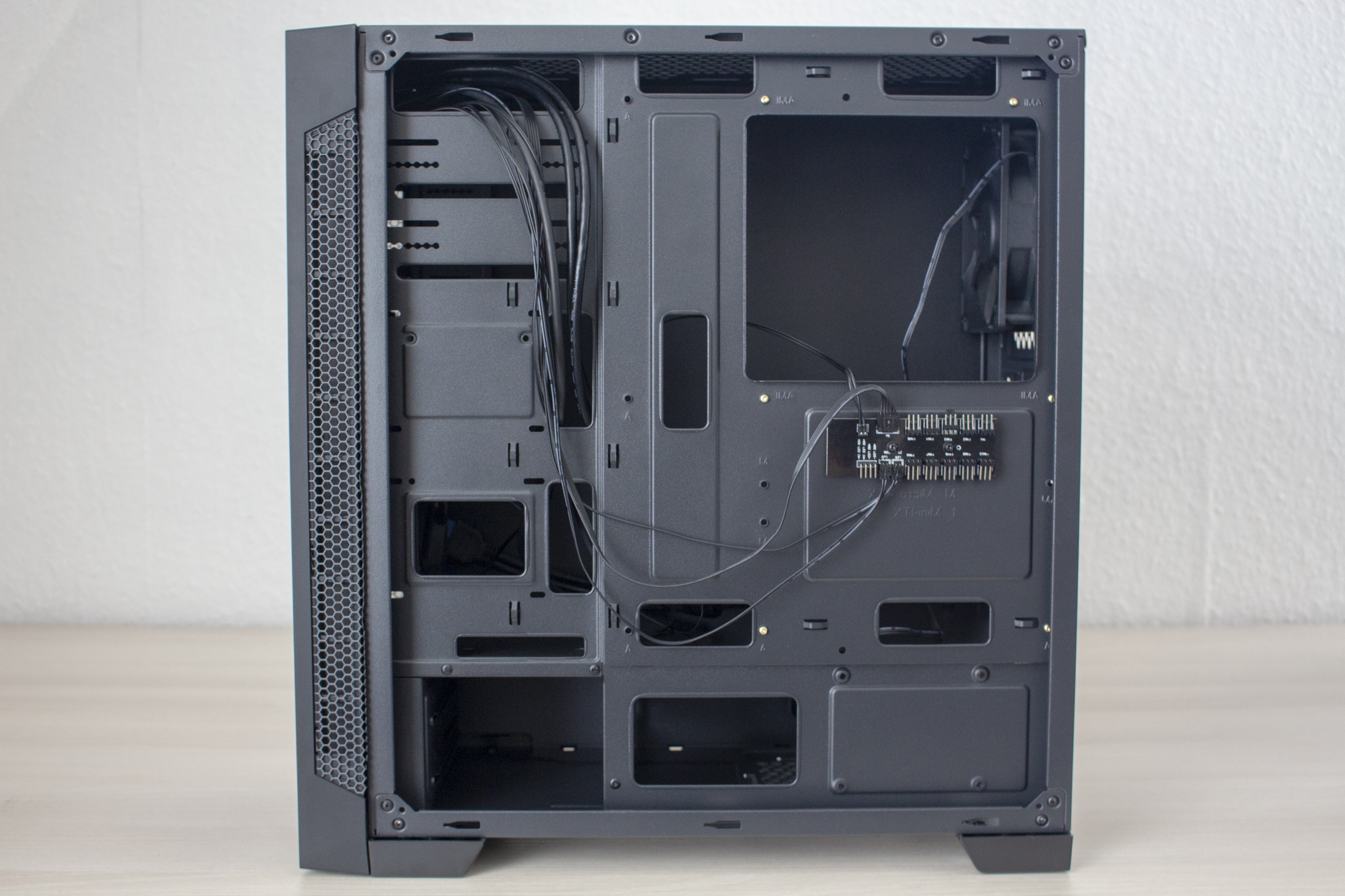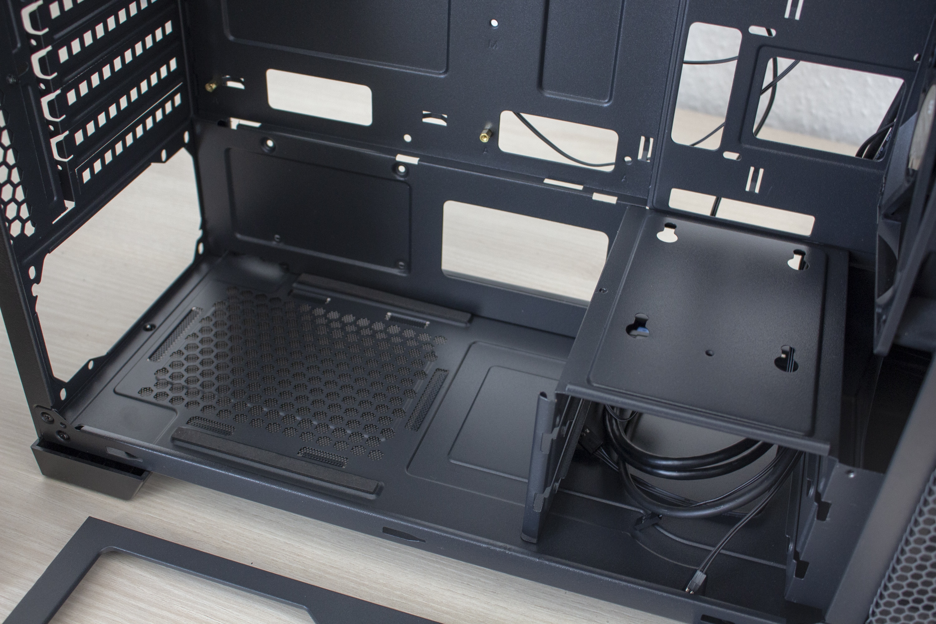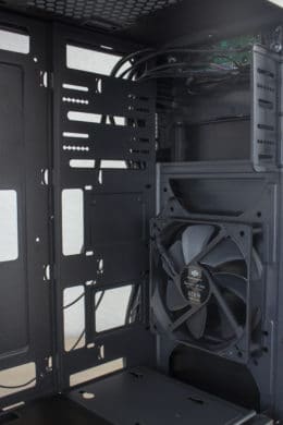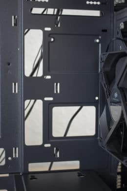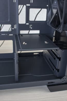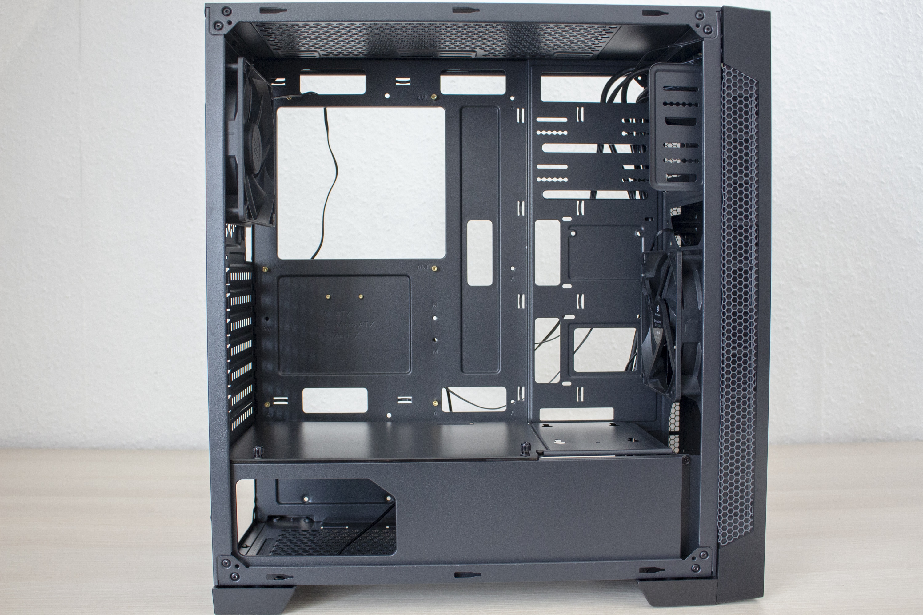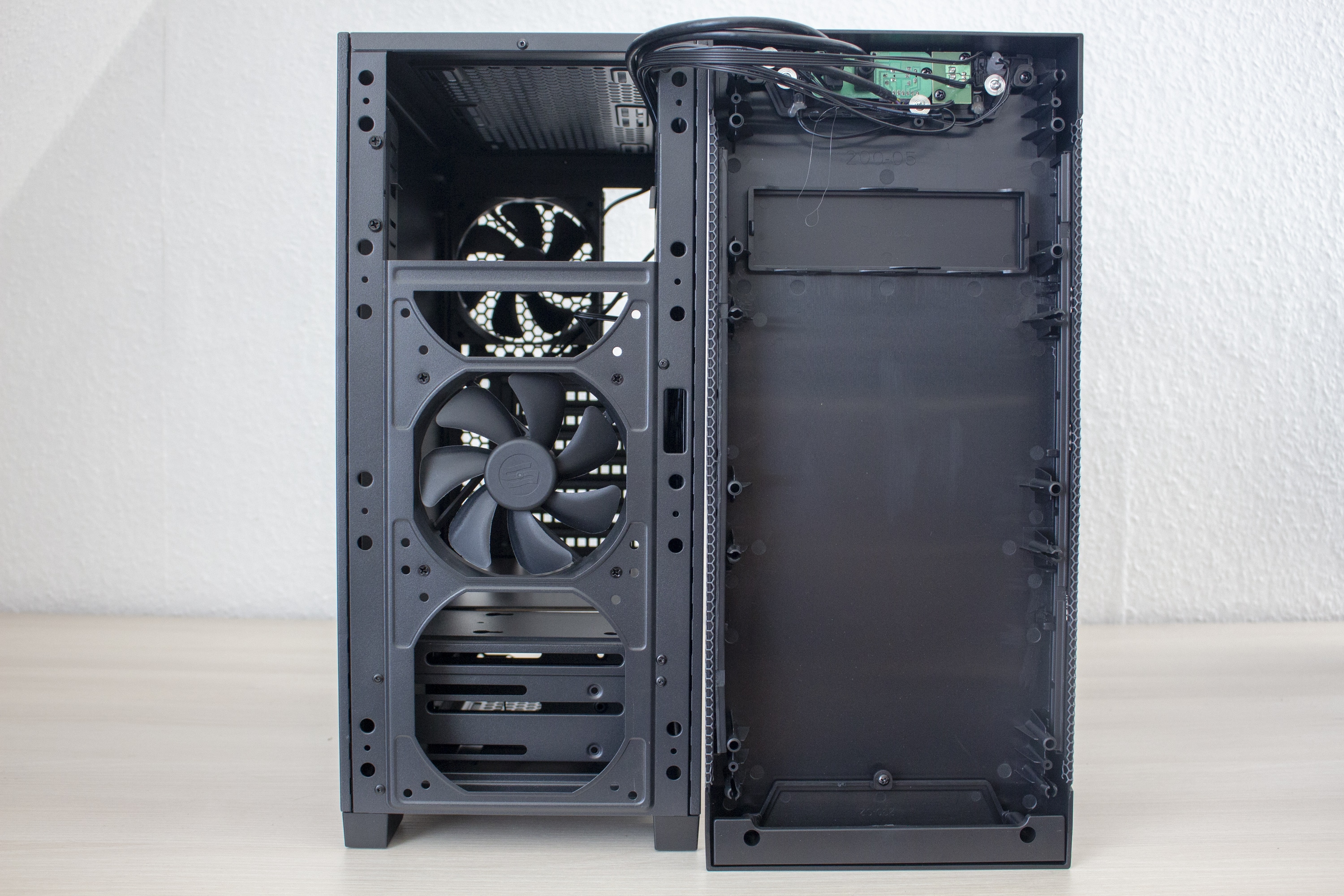 Im Innenraum folgt auch SilentiumPC dem aktuellen Trend und gestaltet diesen sehr offen bzw. unterteilt das Innere mit Hilfe einer Netzteilabdeckung in zwei Bereiche. Der vorinstallierte Gehäuselüfter in der Front kann ungehindert Luft in den Innenraum befördern und so Grafikkarte und CPU mit Frischluft versorgen. Um das Innere auch nach dem Zusammenbau noch aufgeräumt wirken zu lassen, hat der Hersteller das Mainboard-Tray zudem mit diversen Kabelmanagement-Öffnungen versehen.