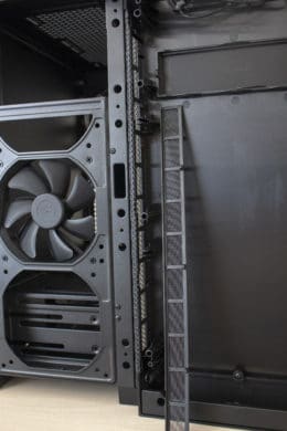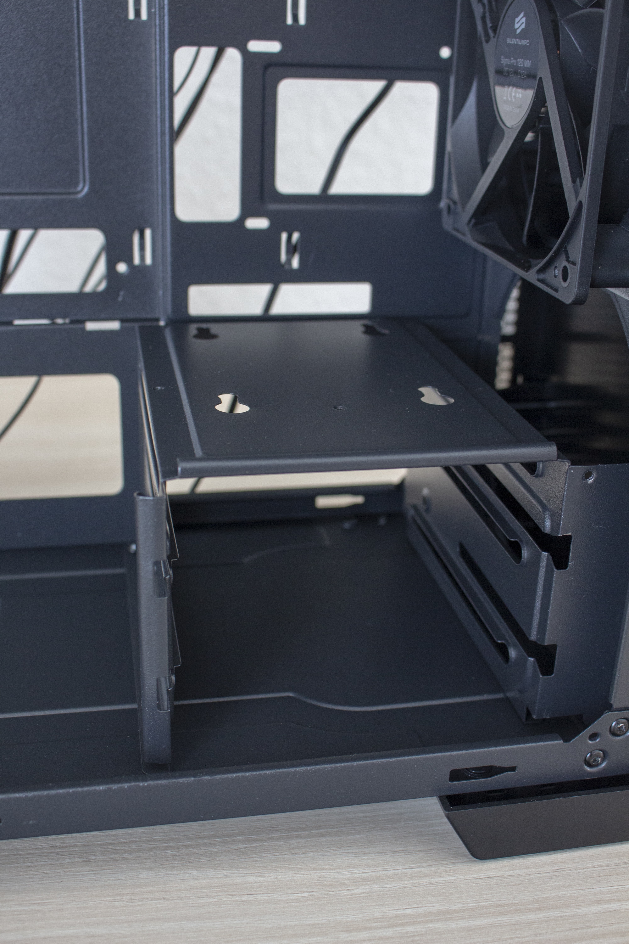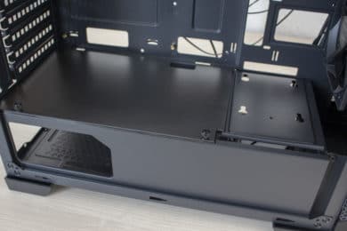 Entfernt man beide Elemente, wird der Blick auf die Montageposition für das Netzteil und den HDD-Käfig frei. Um Schwingungsübertragungen zu vermeiden, wurden zwei Moosgummistreifen am Boden festgeklebt auf denen das Netzteil ruhen kann. Rechts daneben befindet sich der HDD-Käfig für zwei 3,5″-Festplatten. Benötigt man noch mehr Speicherplatz, dann können drei weitere SSDs am Mainboard-Tray bzw. auf dem Deckel des Festplattenkäfigs angebracht werden.