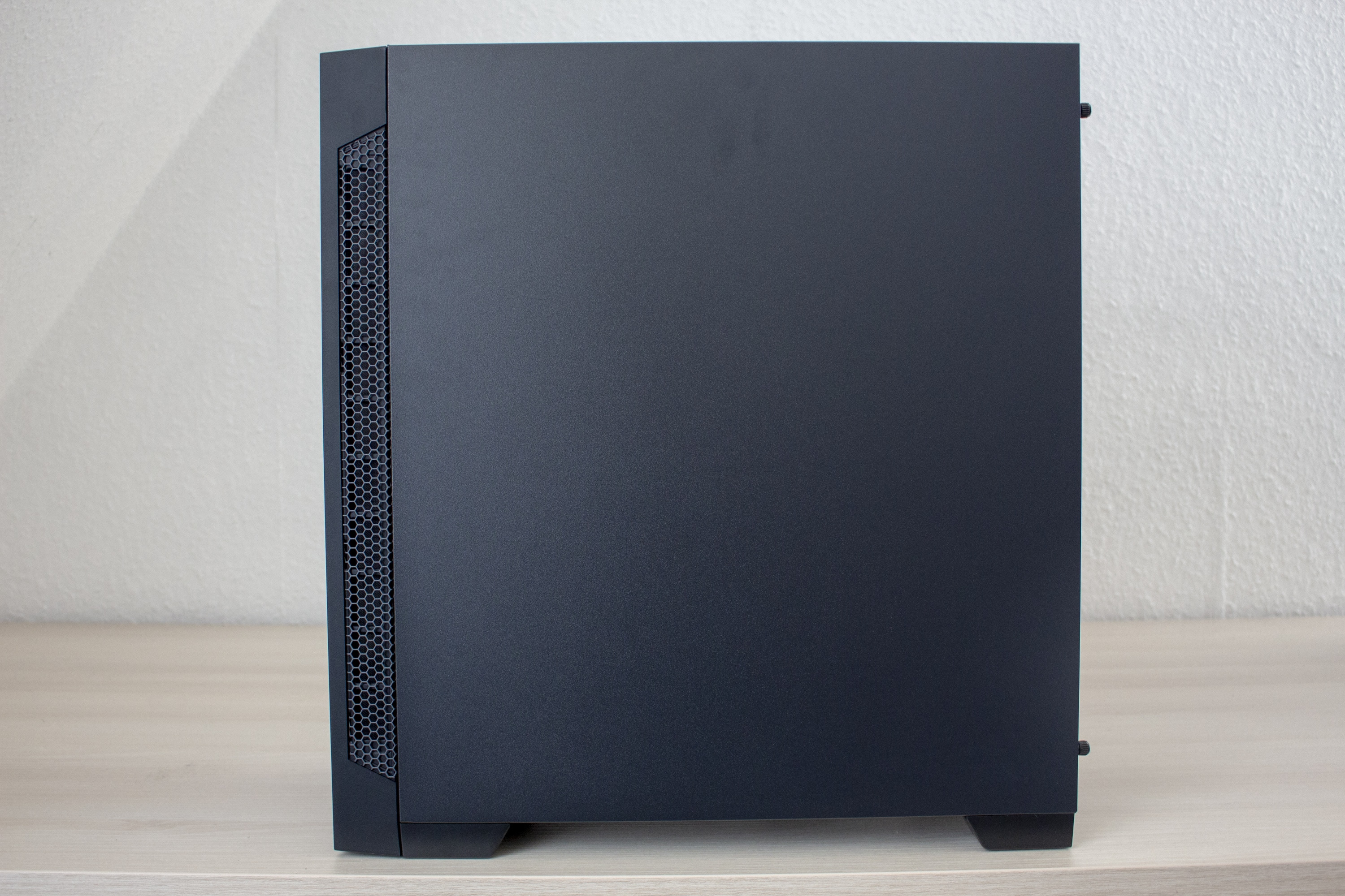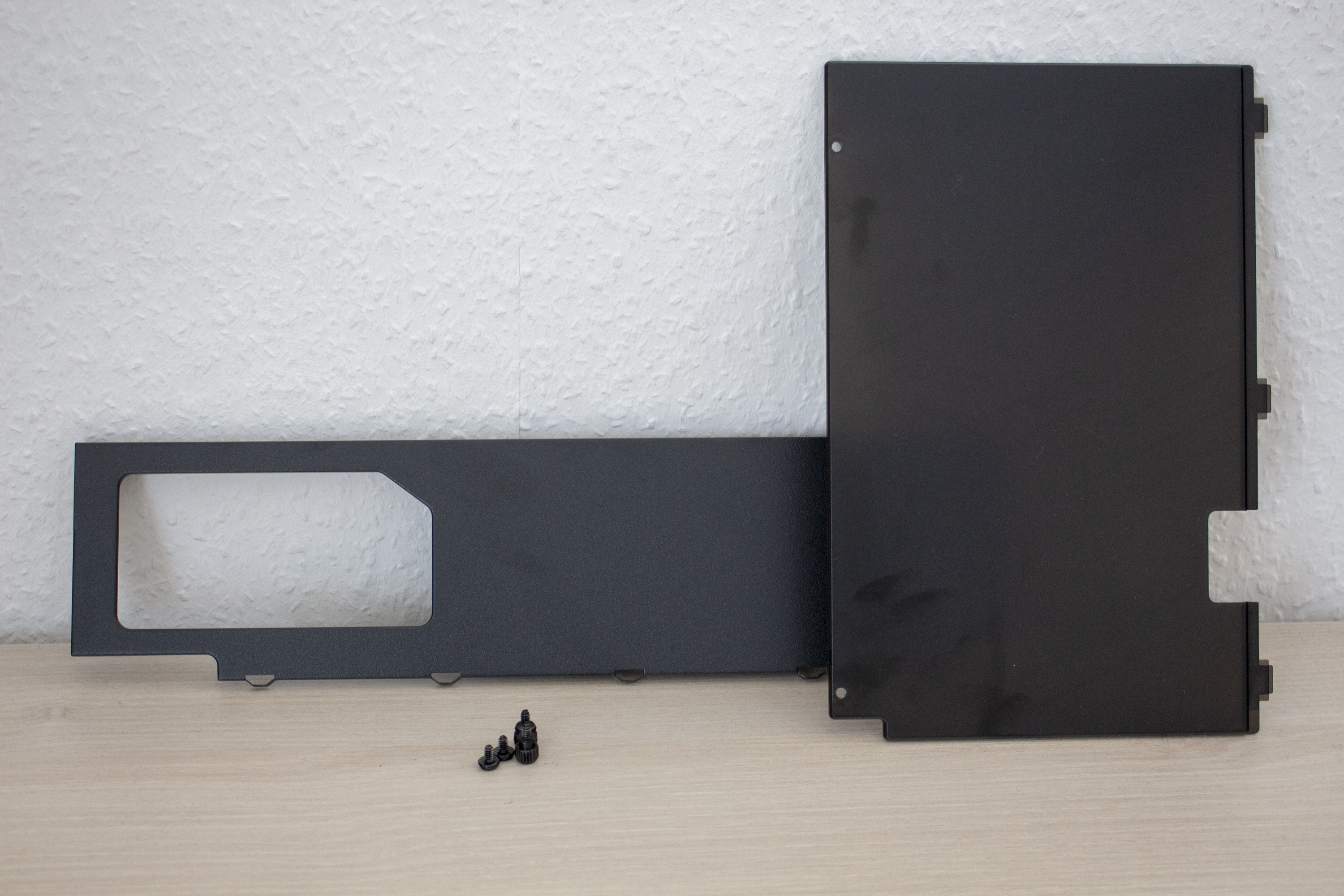 Bei den Seitenteilen setzt sich die schlichte Optik fort. Beide Panels sind komplett aus Stahl gefertigt und mit Rändelschrauben bestückt. Leider sind beide Elemente recht wabbelig, sehr leicht und klappern auch im angeschraubten Zustand ein wenig. Hier hat der Hersteller also spürbar Material eingespart.