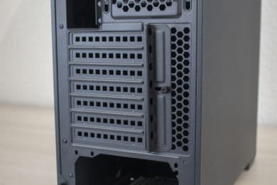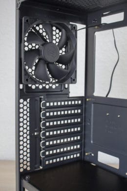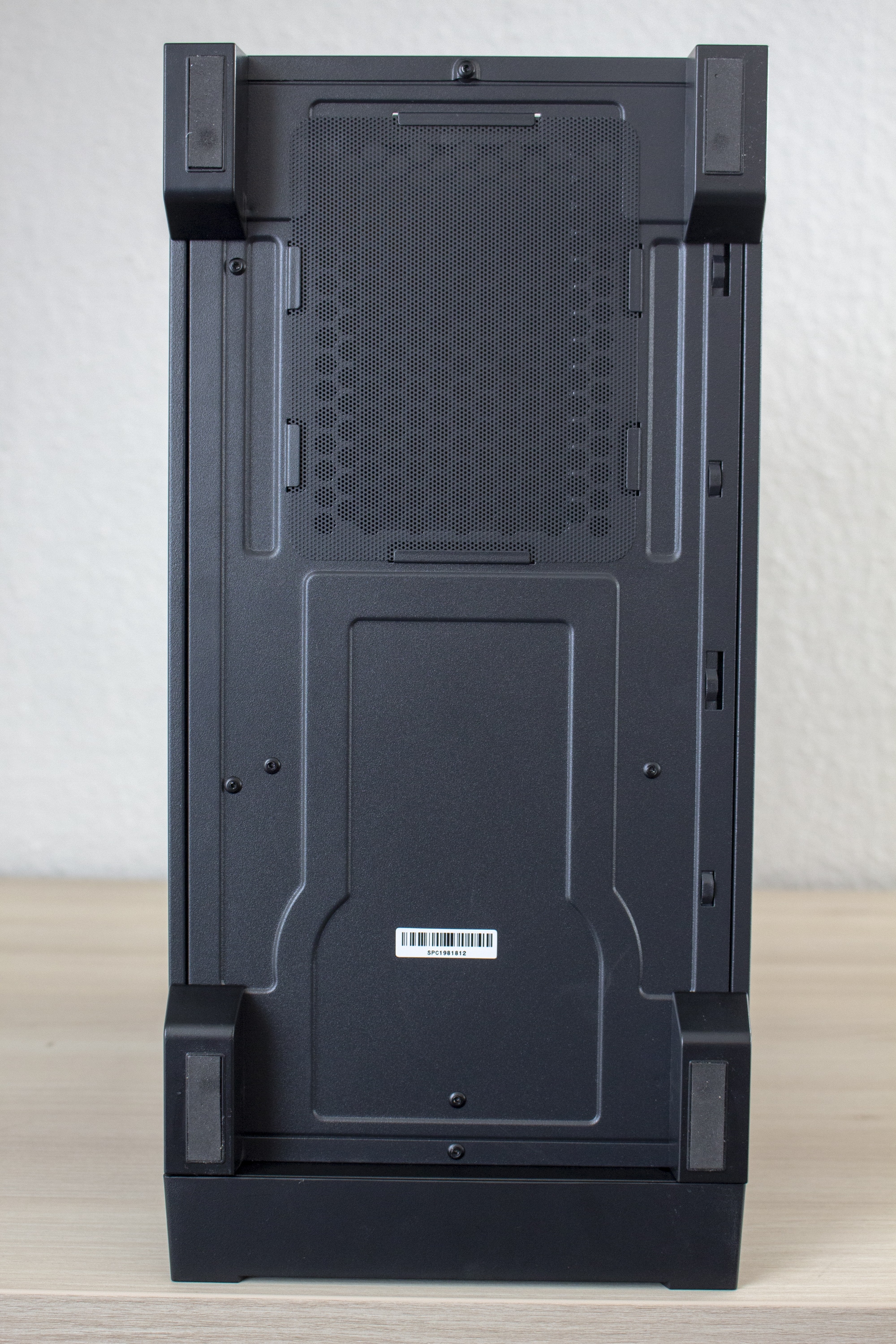 Die Rückseite und Unterseite des Armis AR3 verbergen keine besonderen Features. Der Midi-Tower steht auf gummierten und soliden Kunststofffüßen, das Netzteil wird unten montiert und mit einem Meshfilter vor grobem Staub geschützt. Darüber befinden sich die sieben PCI-Slots und der zweite vorinstallierte Gehäuselüfter. Unglücklicherweise muss man alle PCI-Slotblenden herausbrechen. Immerhin legt SilentiumPC drei Ersatzblenden bei.