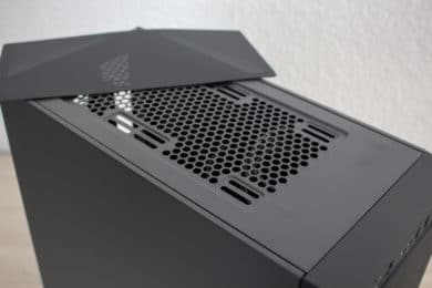 Die Deckelpartie wird durch eine große Lüfteröffnung dominiert. Diese bietet Platz für zwei 120- oder zwei 140-mm-Lüfter. Um den Innenraum vor Staub zu schützen und den Deckel schlichter wirken zu lassen, hat SilentiumPC einen magnetischen Staubfilter vorinstalliert.