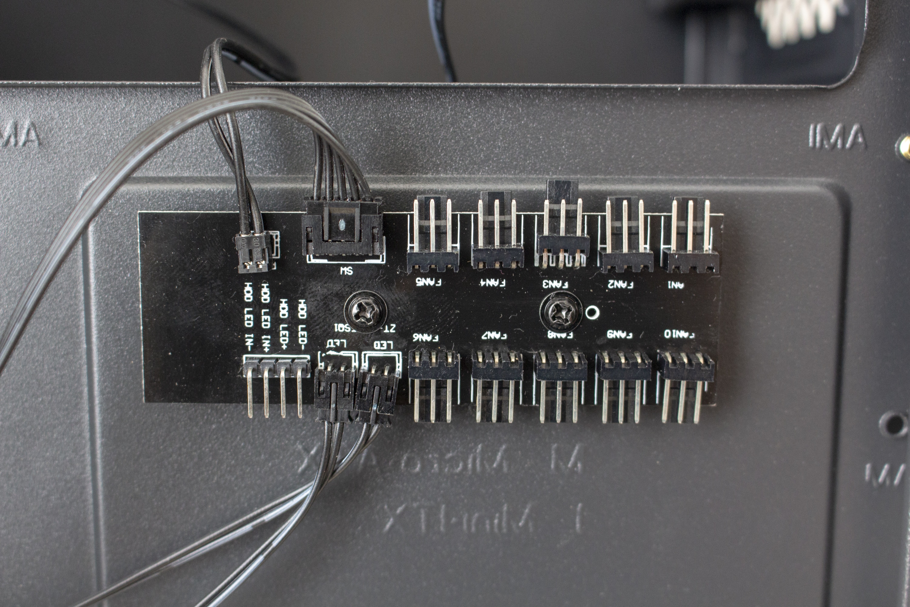 Auf der Rückseite des Mainboard-Trays gibt es kaum Überraschungen. Lediglich die vorinstallierte Lüftersteuerung ist hervorzuheben und in dieser Preiskategorie eher untypisch. Diese unterstützt bis zu zehn 3-Pin-Lüfter und kann über den Regler am I/O-Panel gesteuert werden. Die Stromversorgung der Platine erfolgt über einen modernen SATA-Anschluss.