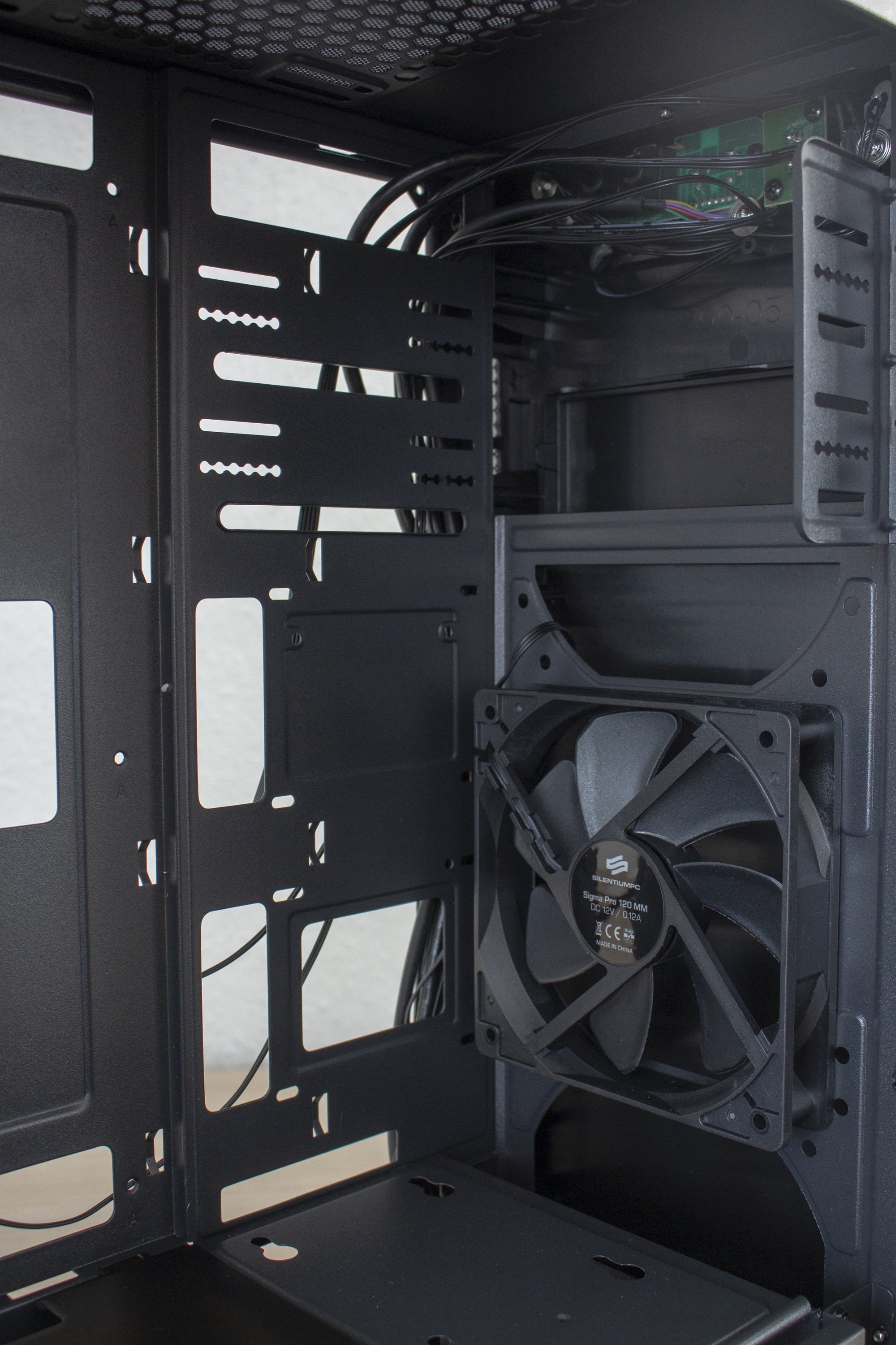 Die vorinstallierten Lüfter sind vom Typ Sigma Pro, haben eine Rahmenbreite von 120 mm und drehen mit maximal 1200 rpm. Selbst auf der höchsten Stufe der Lüftertsteuerung verhalten sich bei Ventilatoren recht unauffällig und erzeugen keine Nebengeräsuche. Dafür hält sich der erzeugt Airflow aber auch in Grenzen.