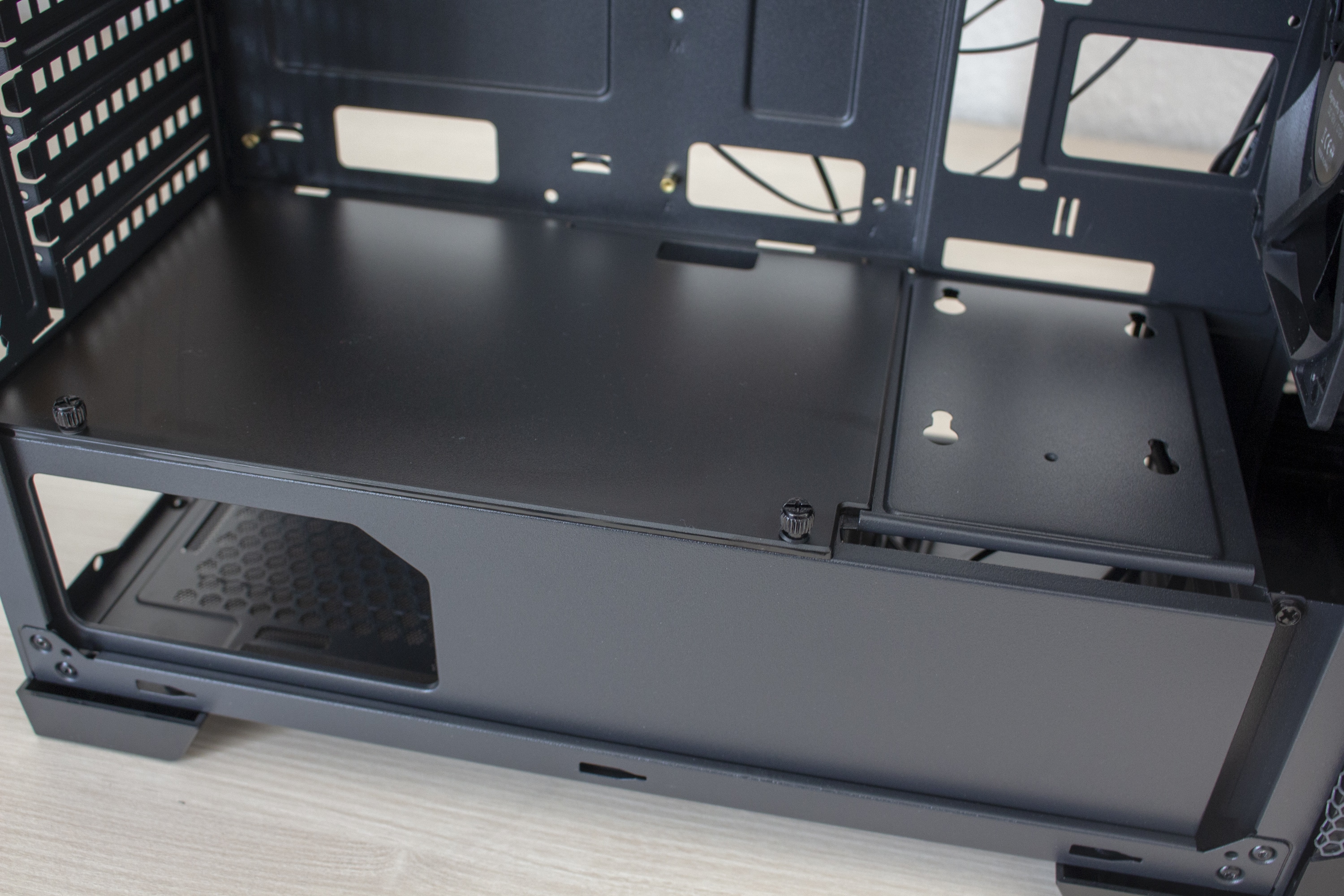 Senkt man den Blick etwas, fällt einem sofort die Netzteilabdeckung ins Auge. Diese soll das Netzteil und sämtliche Kabel verbergen. Im Gegensatz zu vielen anderen Gehäusen ist diese Abdeckung bei dem Armis AR3 aber etwas anders gestaltet. Der Hersteller hat diese Blende nämlich modular aufgebaut. Der obere Bereich besteht aus einer leicht transparenten Kunststoffplatte und wird mit zwei Rändelschrauben am zweiten Element befestigt. Das zweite bzw. untere Element ist aus Stahl gefertigt und mittels zwei normaler Schrauben mit dem Korpus verbunden.