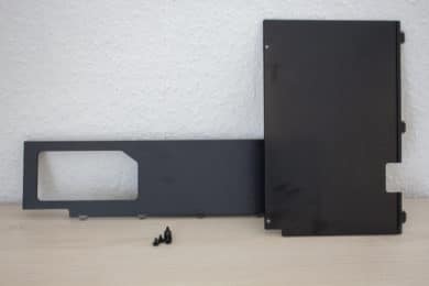 Der Einbau der Hardware läuft im SilentiumPC Armis AR3 etwas anders als gewohnt. Denn zur Montage des Netzteils und der Festplatten müssen zuerst die zwei Elemente der Netzteilabdeckung entfernt werden. Erst wenn die Stromversorgung und gegebenenfalls die HDDs eingebaut wurden, kann zumindest das Stahlelement wieder angebracht werden. Hier trat allerdings auch direkt das erste Problem auf. Mit den installierten Komponenten war es relativ kniffelig die untere Blende wieder so in Position zu bringen, dass man diese wieder festschrauben konnte.