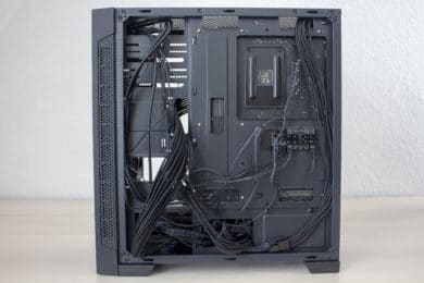 Der restliche Einbau verlief ohne weitere Komplikationen. Der Platz auf der Vorderseite ist geräumig gestaltet und gibt viel Raum zum Arbeiten. Das Armis AR3 hat Platz für CPU-Kühler mit einer Höhe von bis zu 159 mm und unterstützt Grafikkarten bis zu einer Länge von 375 mm. Diese Platzverhältnisse reichen für viele aktuelle Komponenten aus. Grenzwertig ist hingegen der Platz auf der Rückseite. Mit 14 mm gibt es hier nur begrenzt Raum zum Verlegen der Kabel. Gerade die verwendeten Kabelverlängerungen haben die abschließende Anbringung des Seitenteils etwas erschwert. Gibt man sich aber etwas Mühe, lässt sich auch in diesem Midi-Tower ein ordentliches System verwirklichen.
