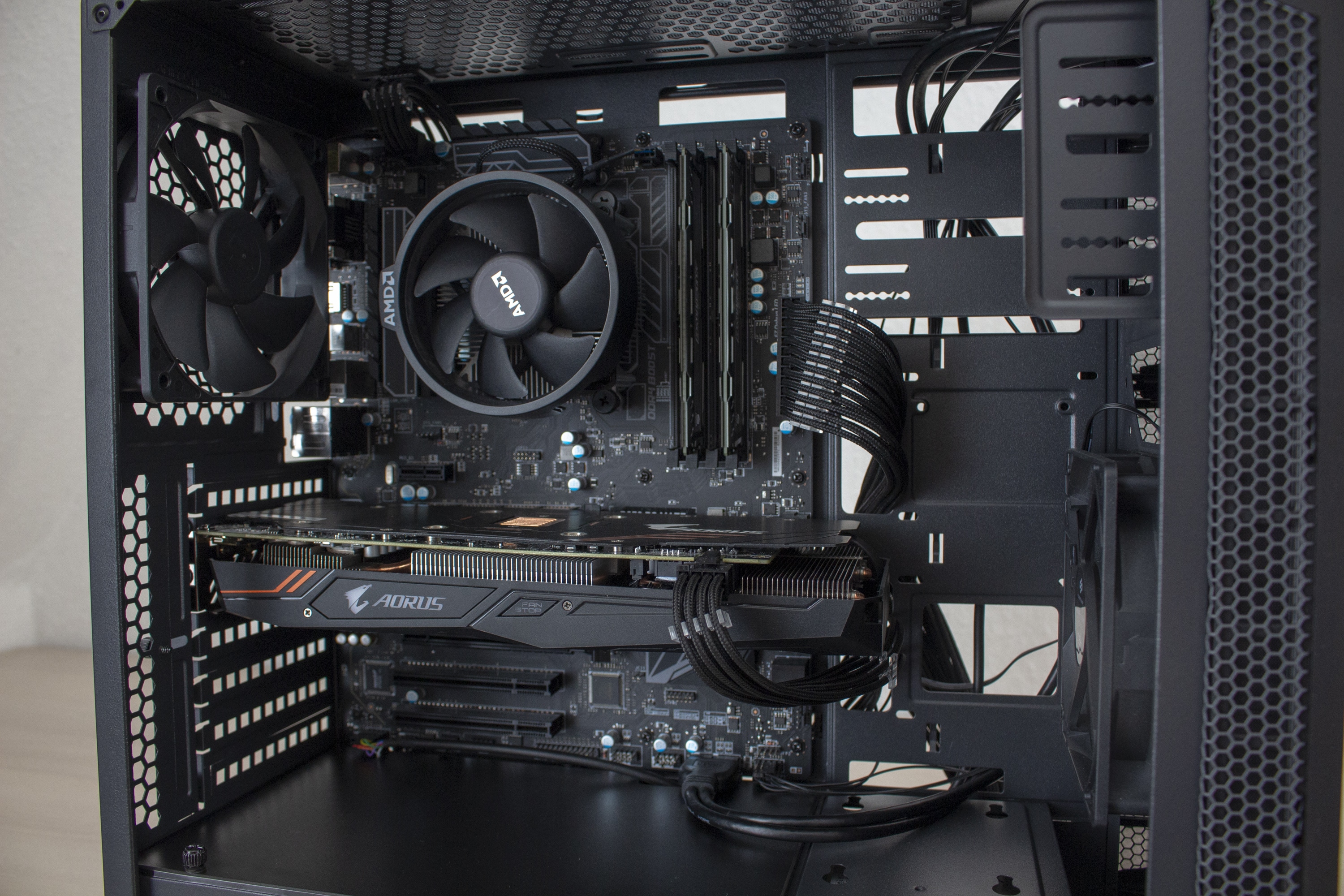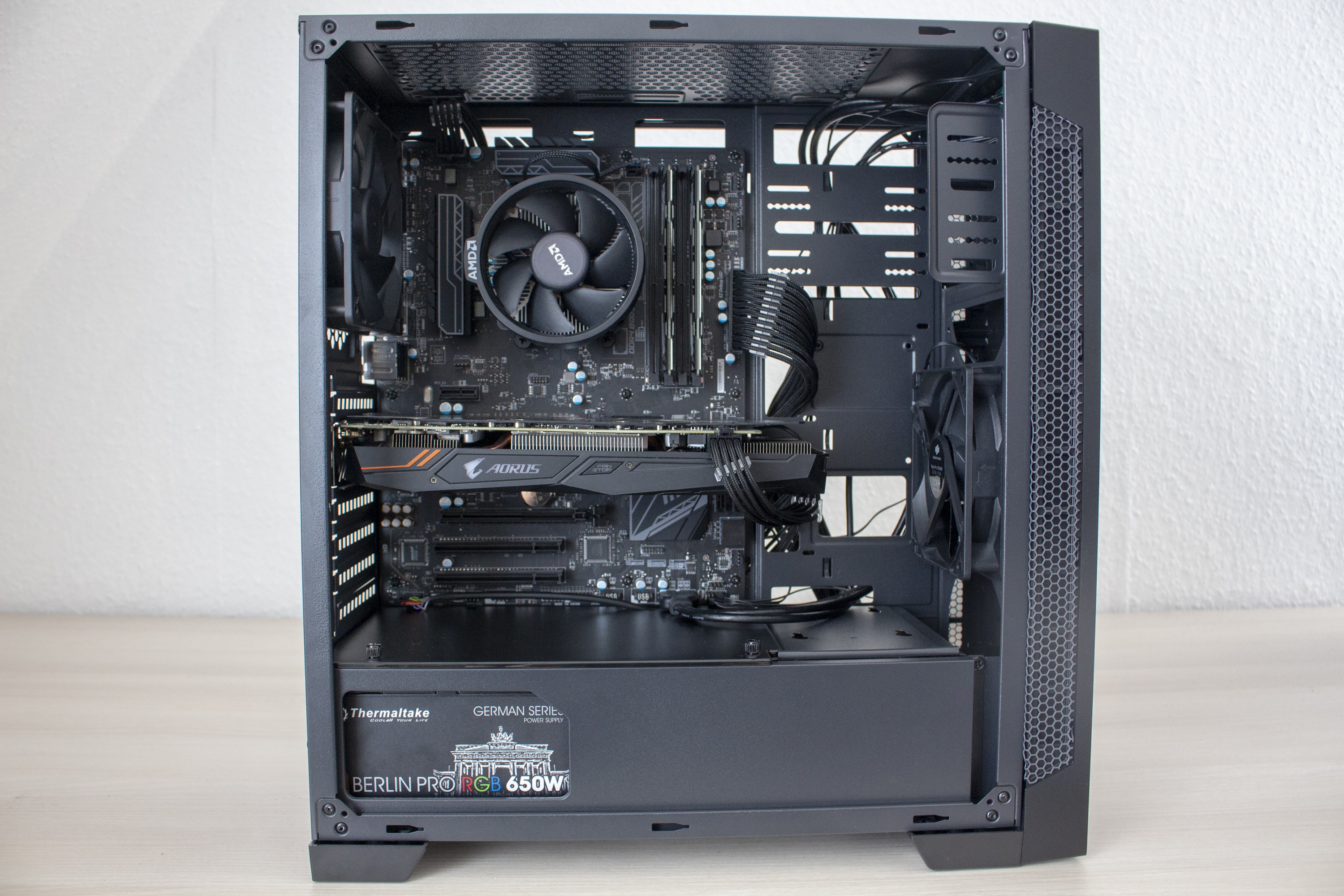 Nun kommen wir zum Systemeinbau. Als Hardware verwenden wir einen AMD Ryzen 5 1400 auf einem MSI B350 PC Mate mit 16GB Crucial Ballistix Sport LT grau DDR4-2666. Für die Bildausgabe ist eine GTX 1060 6GB von Gigabte AORUS zuständig. Die Stromversorgung erledigt das nichtmodulare Berlin Pro RGB 650W mit RGB-Lüfter. Um die Verkabelung optisch noch etwas aufzuwerten, wurden zudem einzeln gesleevte Kabelverlängerungen von Phanteks verwendet.